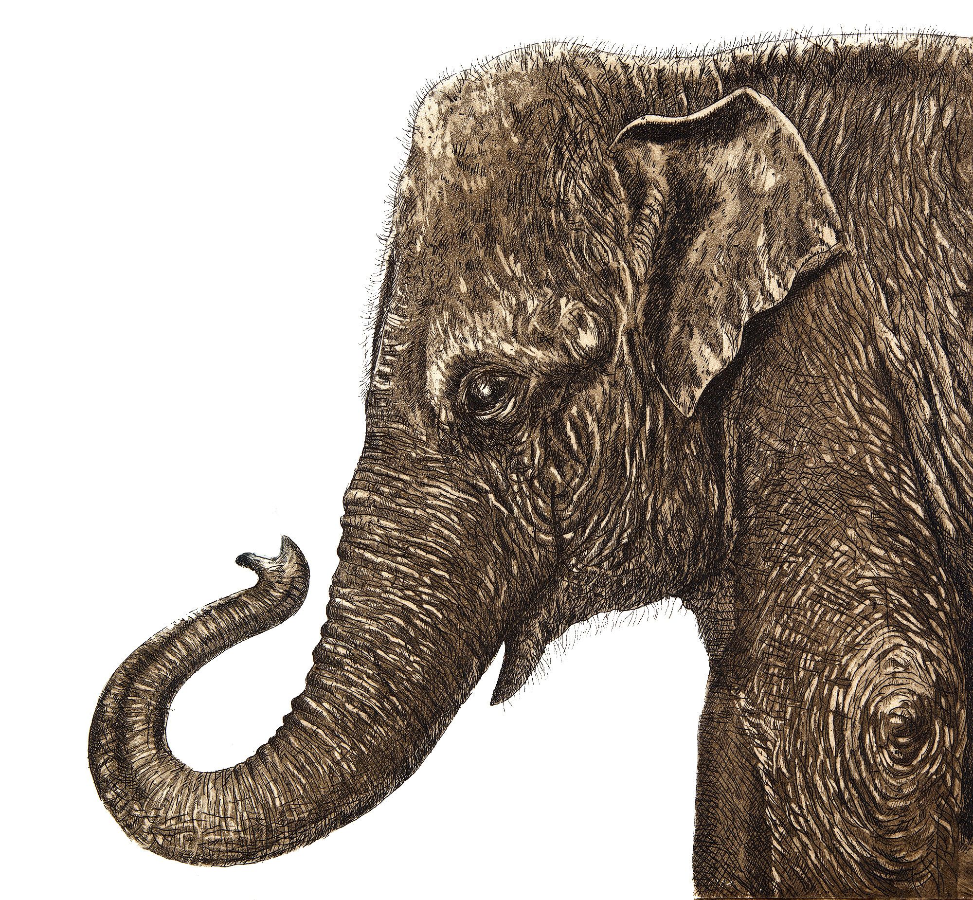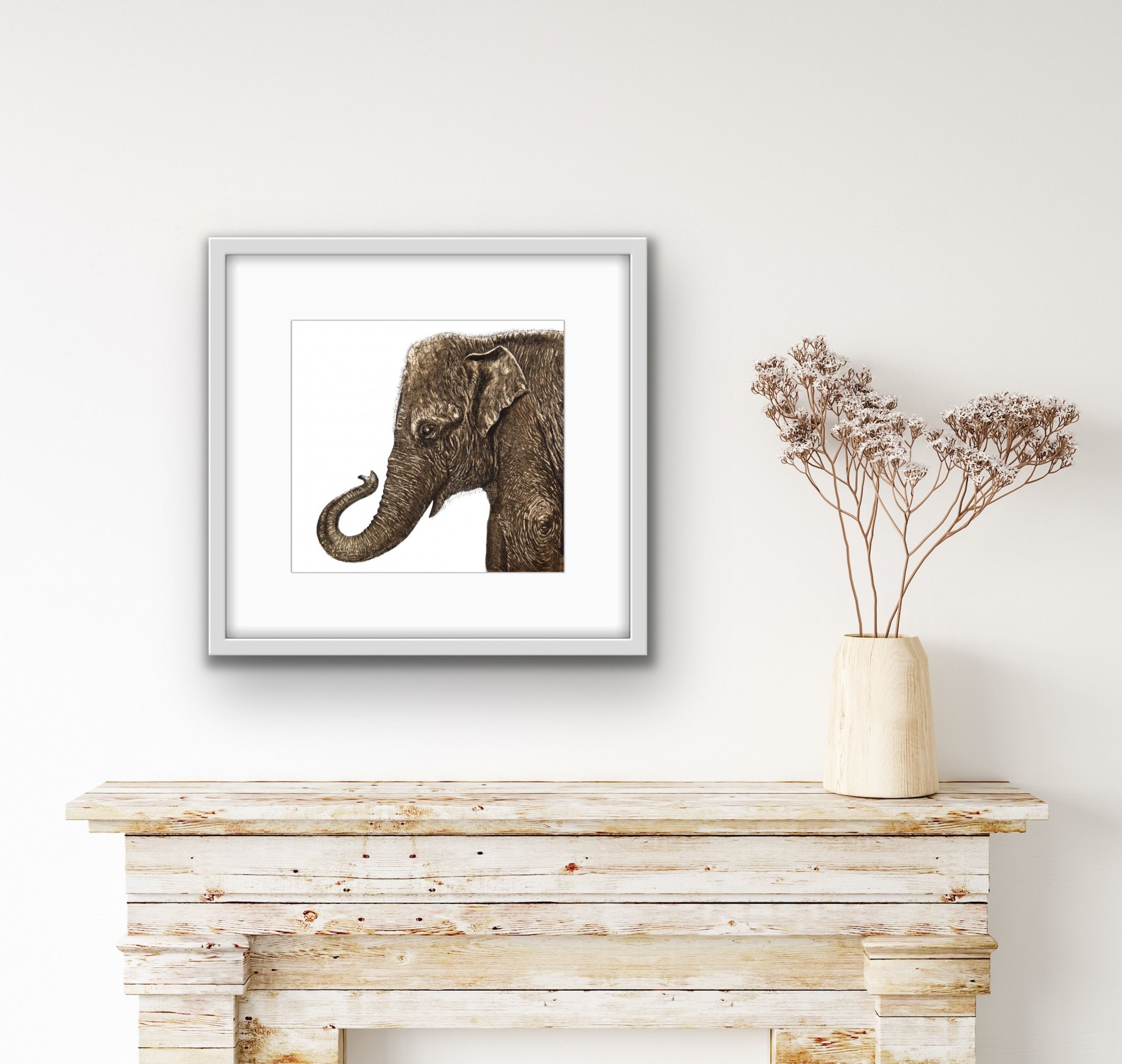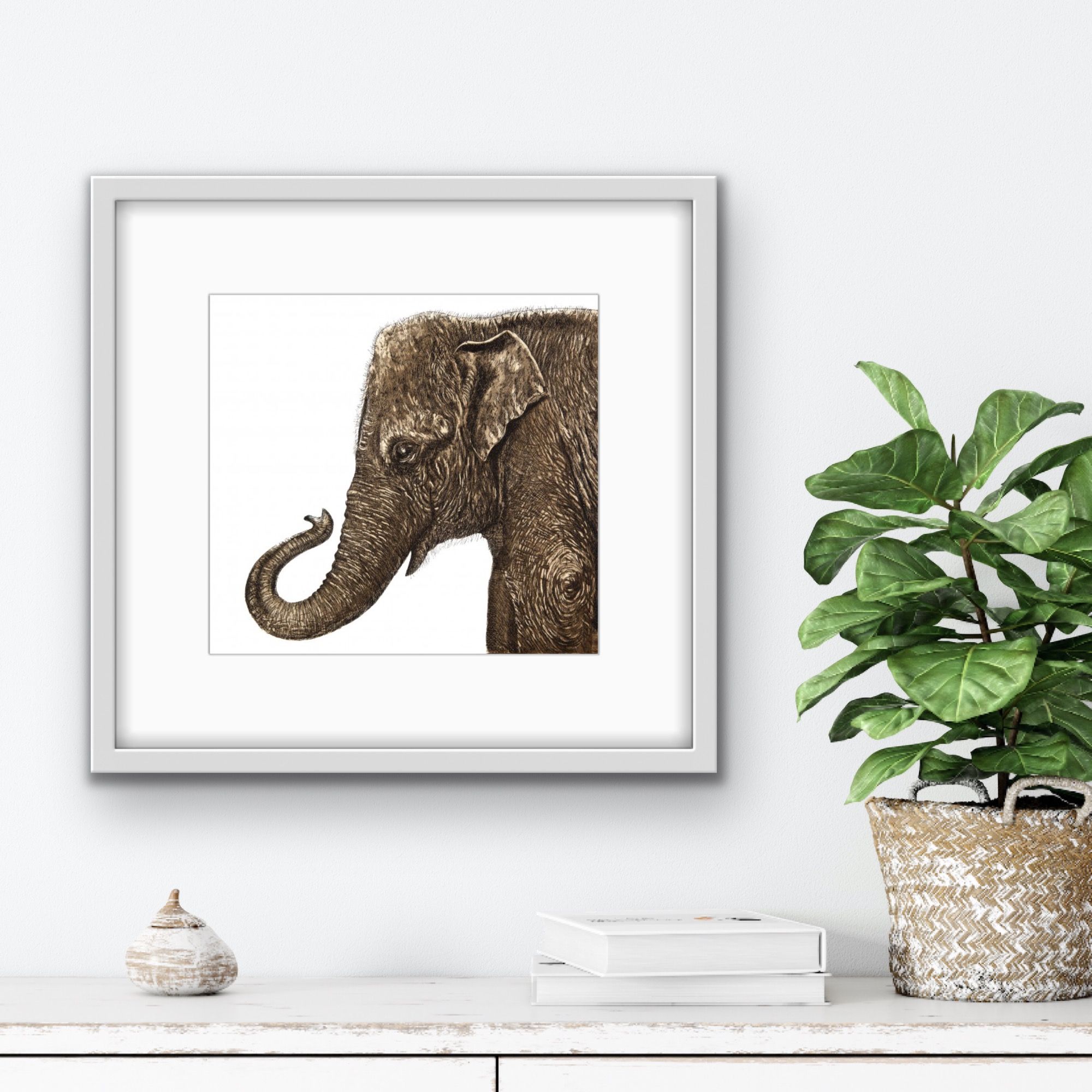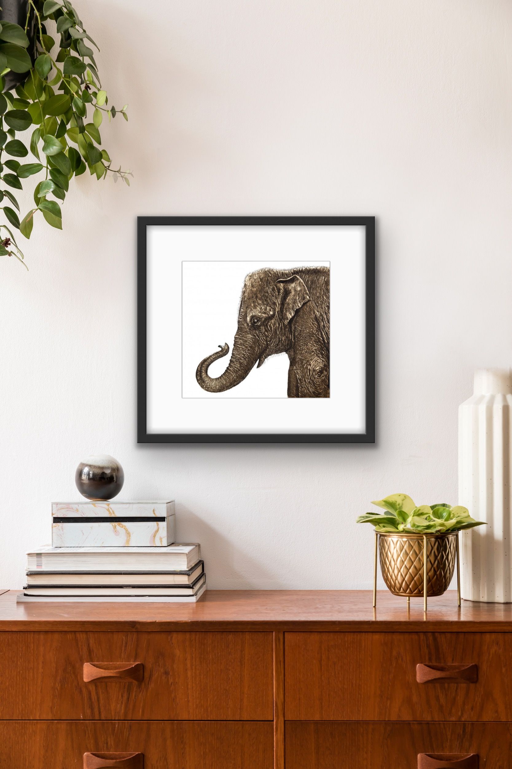 Jane Peart Ellie II Limited Edition Etching Print Edition of 100 Image Size: H 29cm x W 31cm Signed Sold Unframed Please note that in situ images are purely an indication of how a piece may look. Traditional copper plate etching with aquatint. Baby Asian elephant seen as Whipsnade Zoo. Jane Peart was born in London and studied illustration