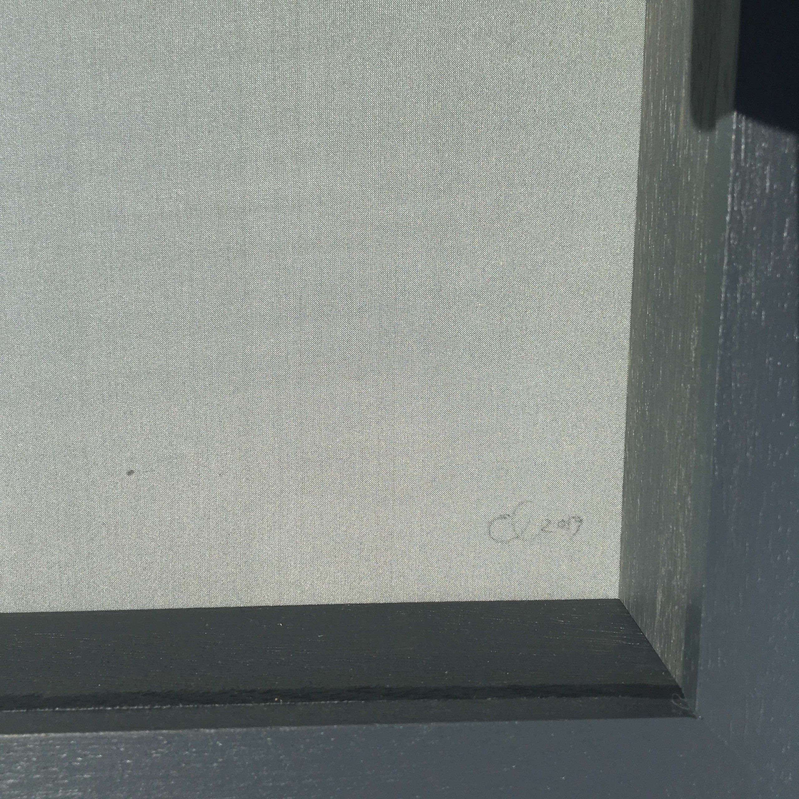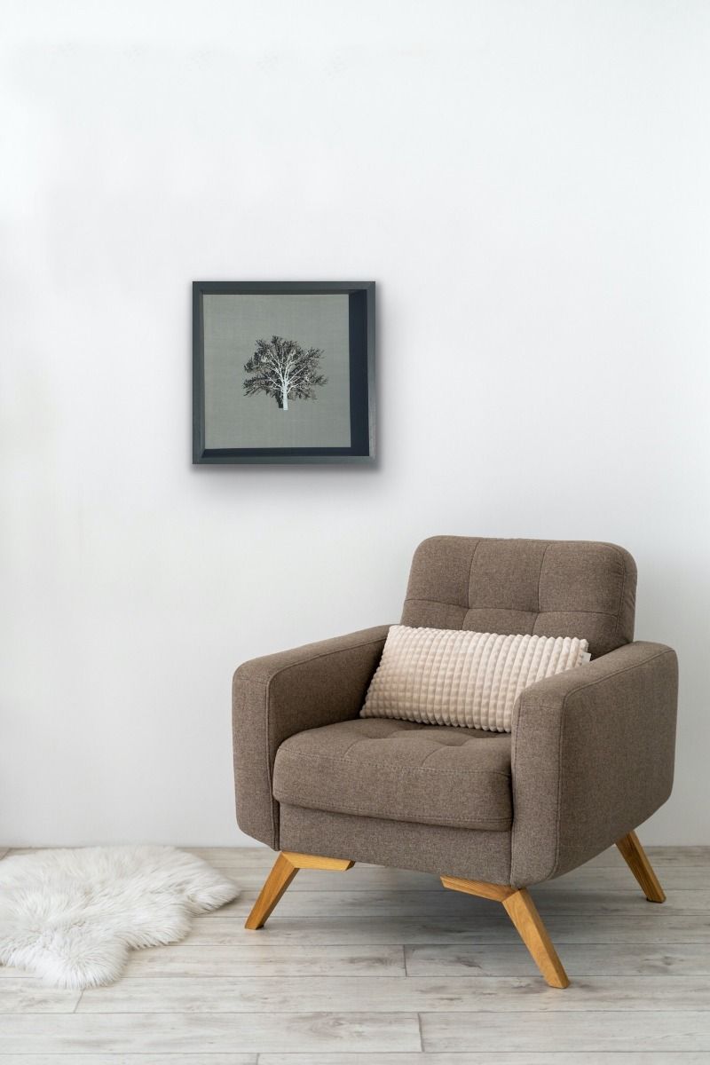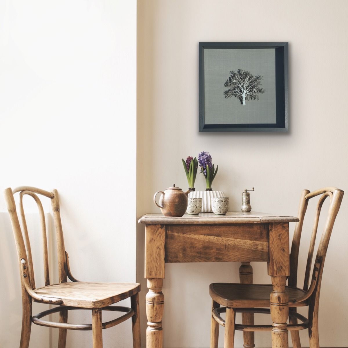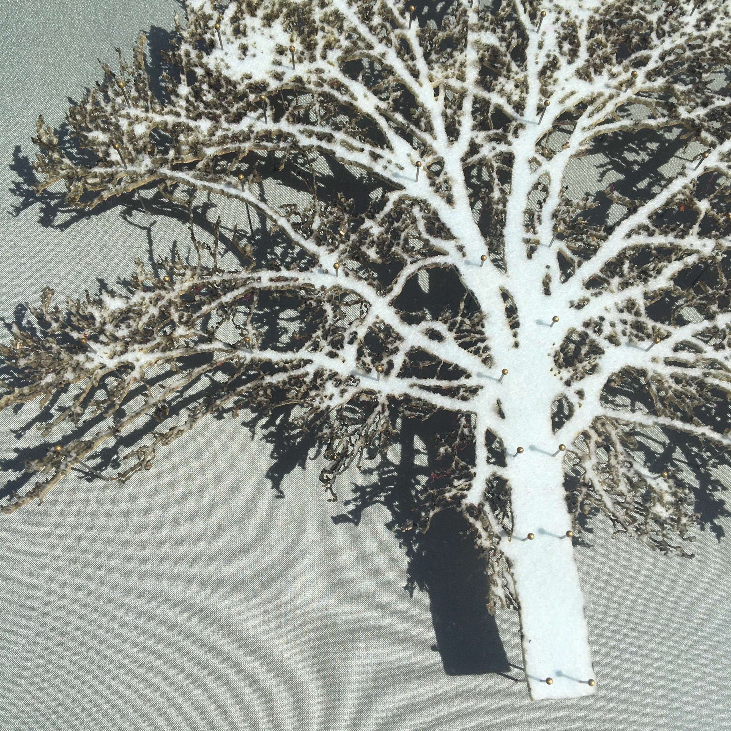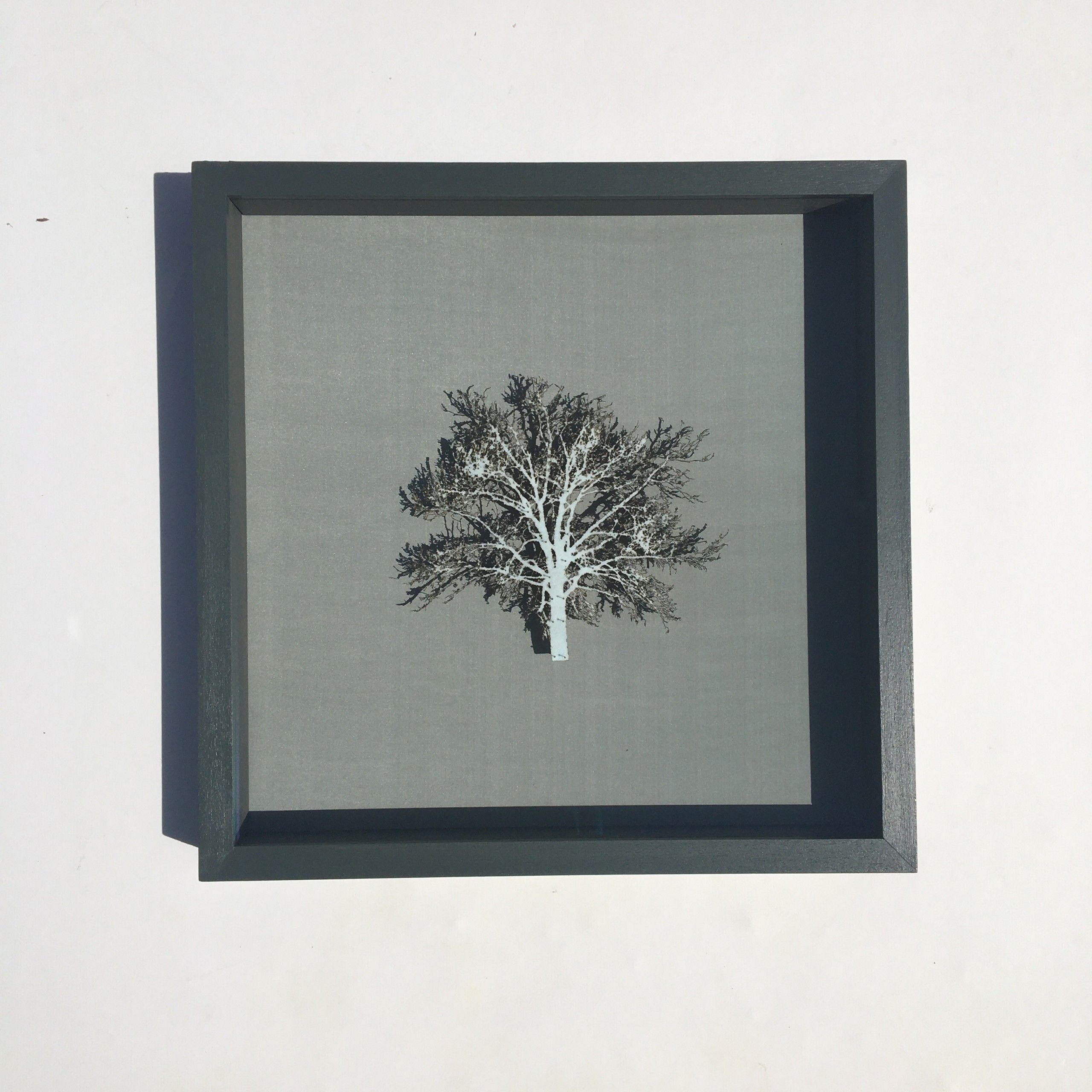 Emma Levine White Oak Laser Cut Paper Hawthorn Tree Attached with Pins Etymology Pins, Silk and Paper Framed Size: H 53cm x W 53cm x D 7cm Framed in a Dark Grey Wood Effect Box Frame White Oak is an original paper cut artwork by Emma Levine. The white and grey tones gives the work a serene