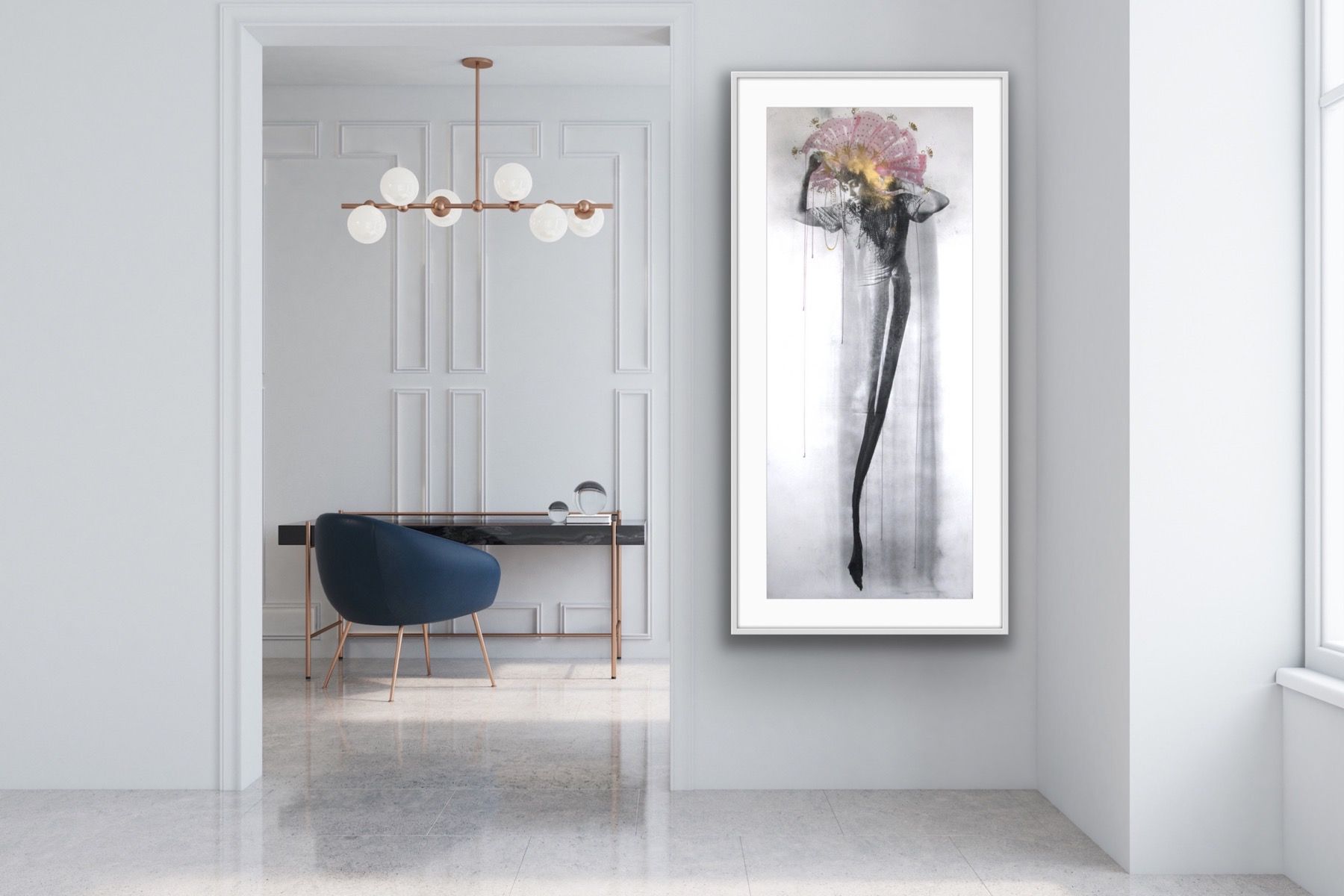 Enigma II' (Edition 6/7)is a figurative hand painted screen-print with charcoal and metallic powders on Somerset Satin Print making Paper. Each print is unique. 180 x 70 cm, Paper size.