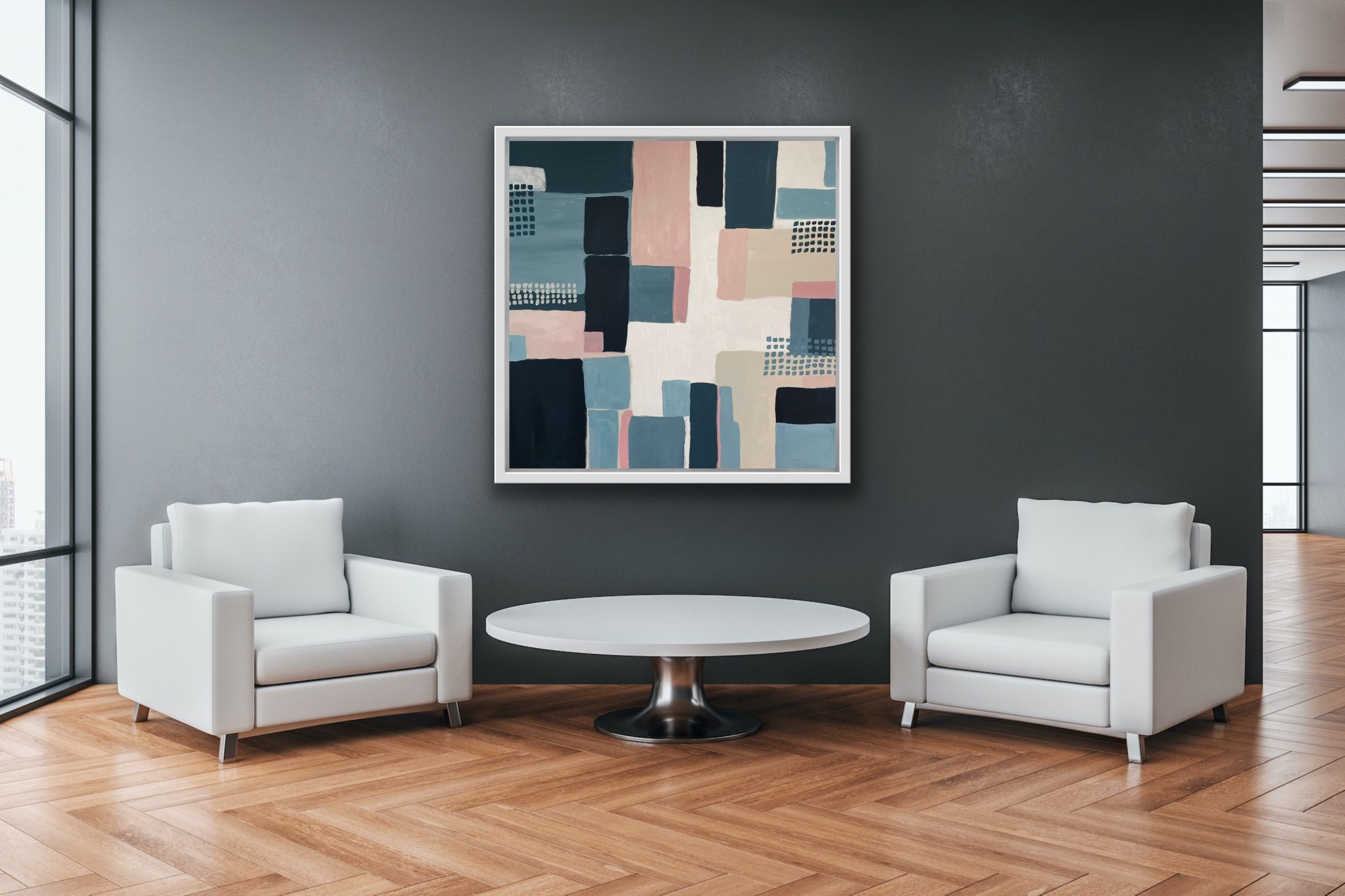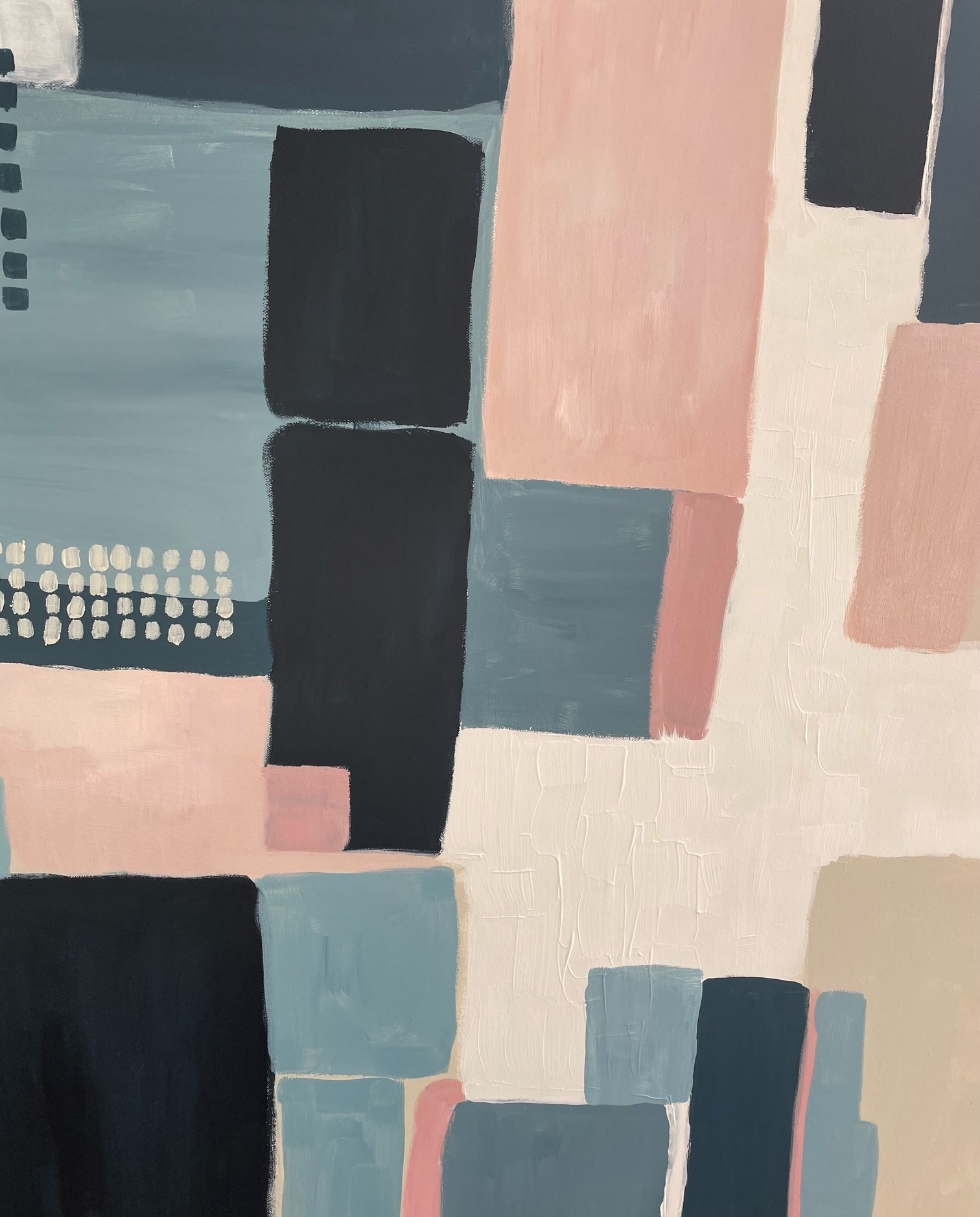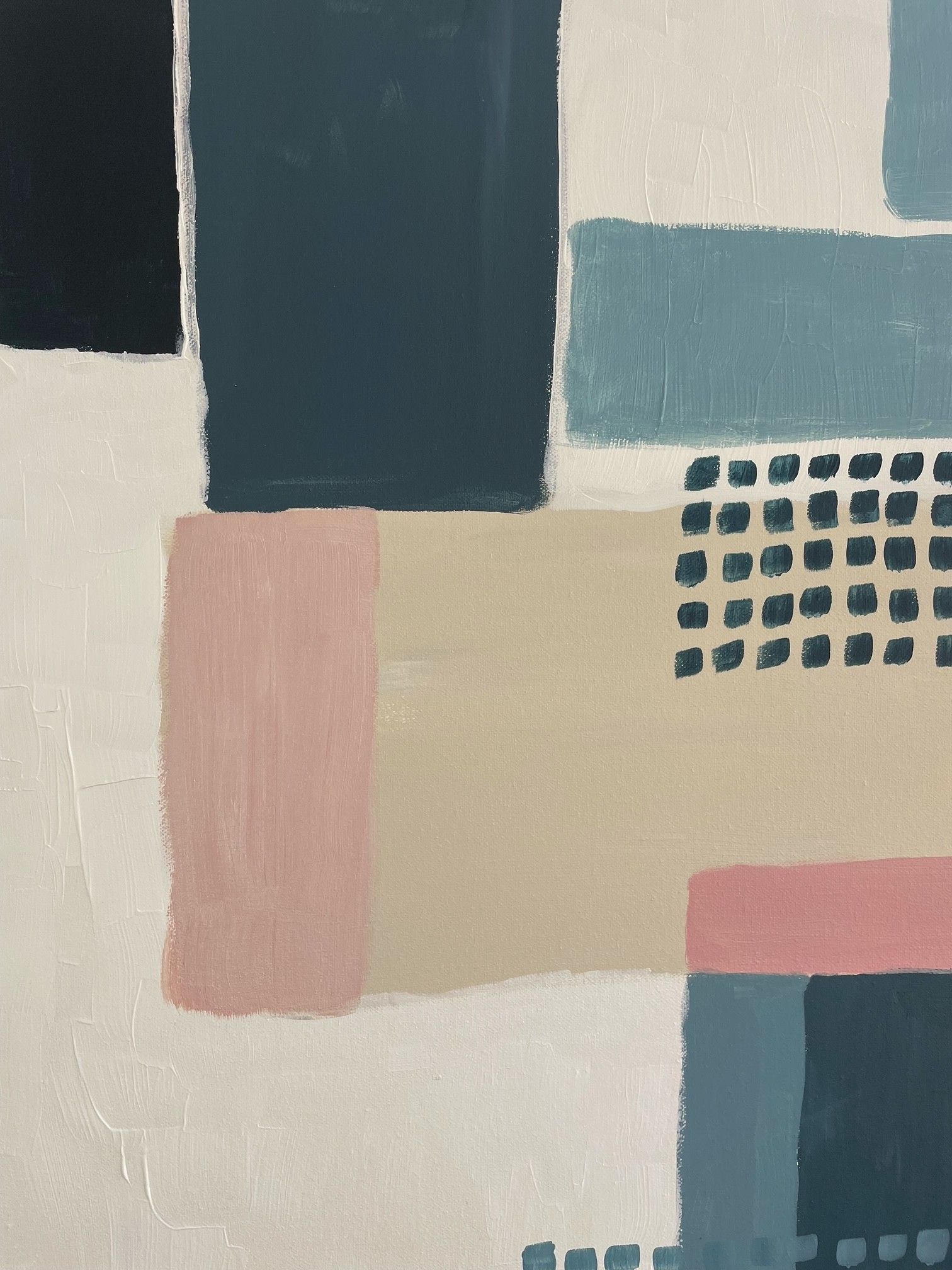 'Field Patterns Blue and Pink' makes up one of a diptych by artist Fleur Park. This painting features her signature pattern making quilted together with geometric shapes which move the viewers gaze around the composition. This painting contains a sophisticated colour palette and considered use of negative space in her
