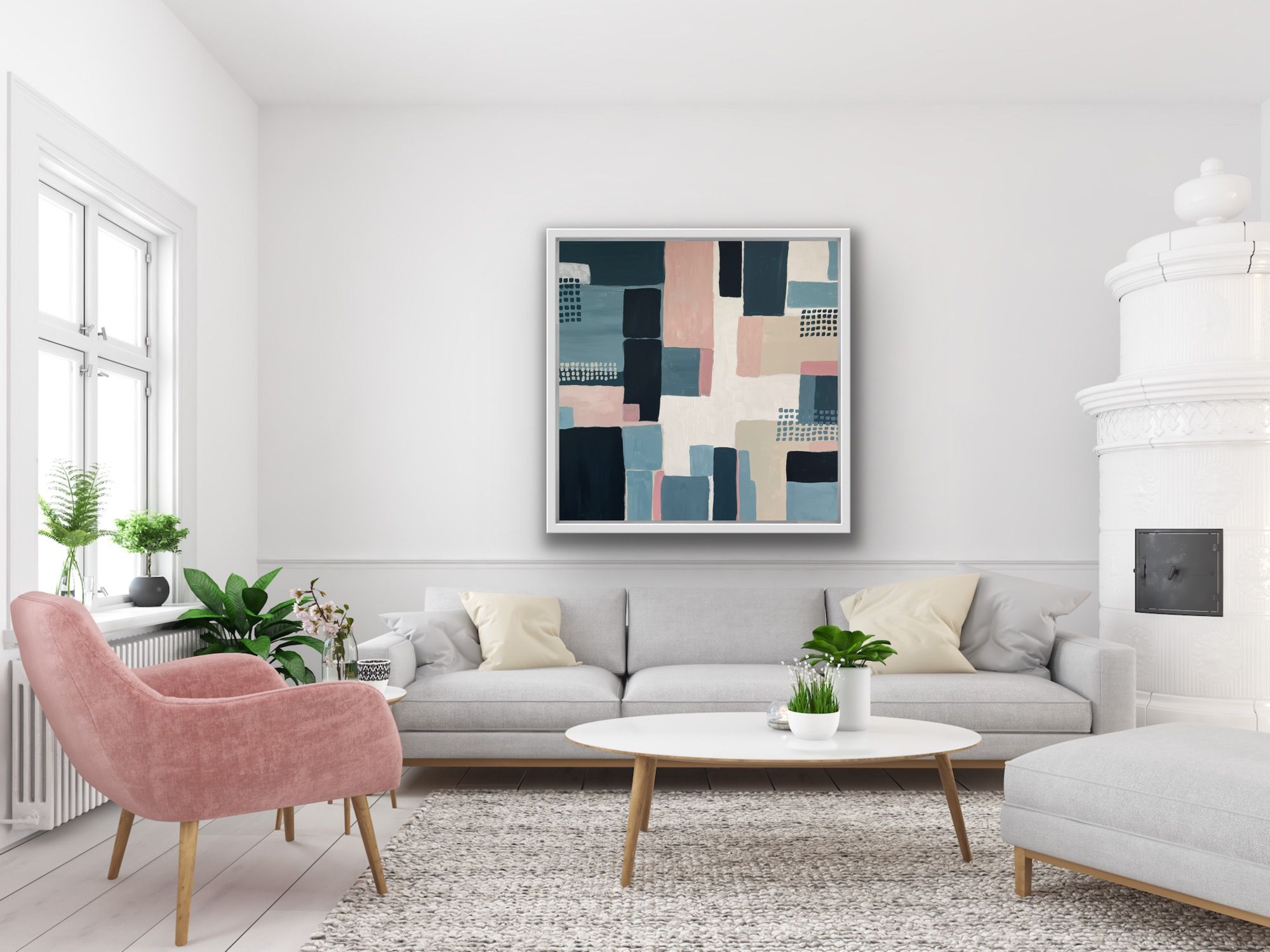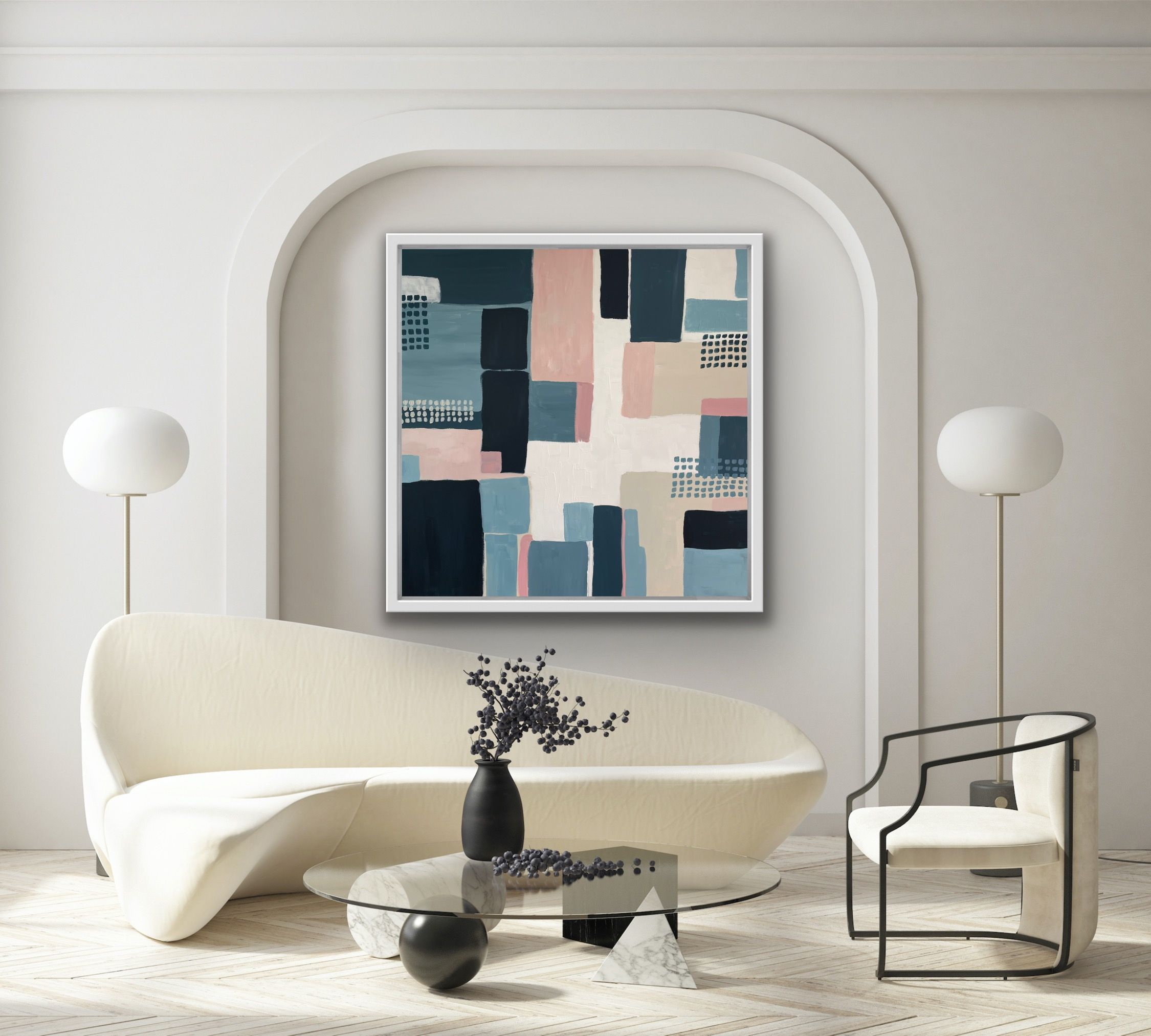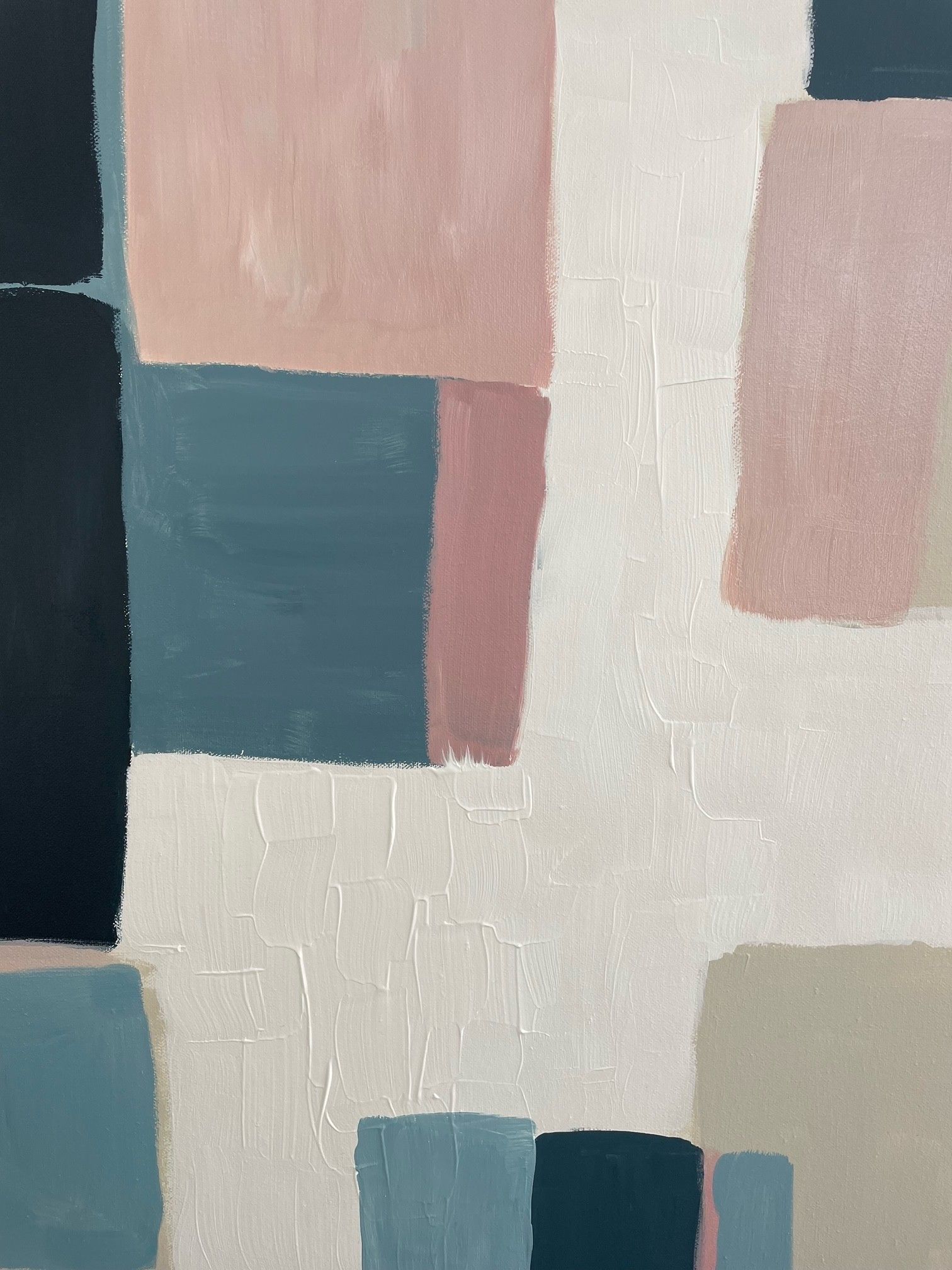 'Field Patterns Blue and Pink' makes up one of a diptych by artist Fleur Park. This painting features her signature pattern making quilted together with geometric shapes which move the viewers gaze around the composition. This painting contains a sophisticated colour palette and considered use of negative space in her