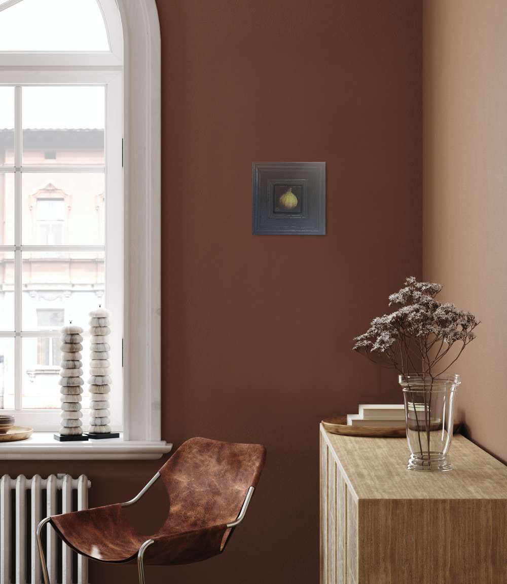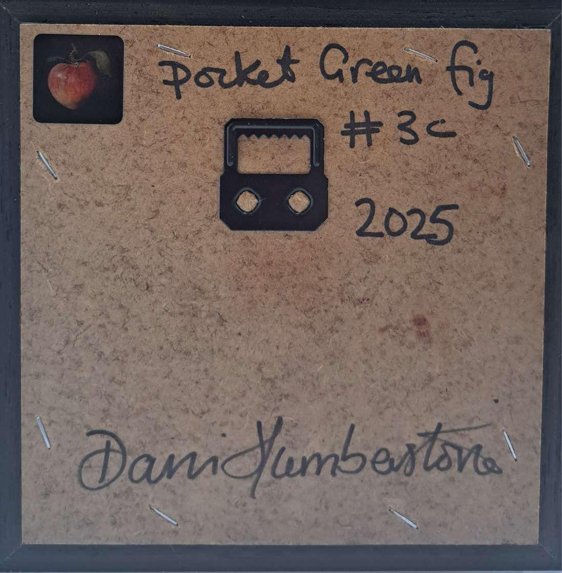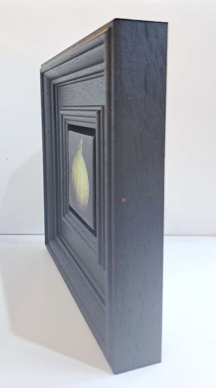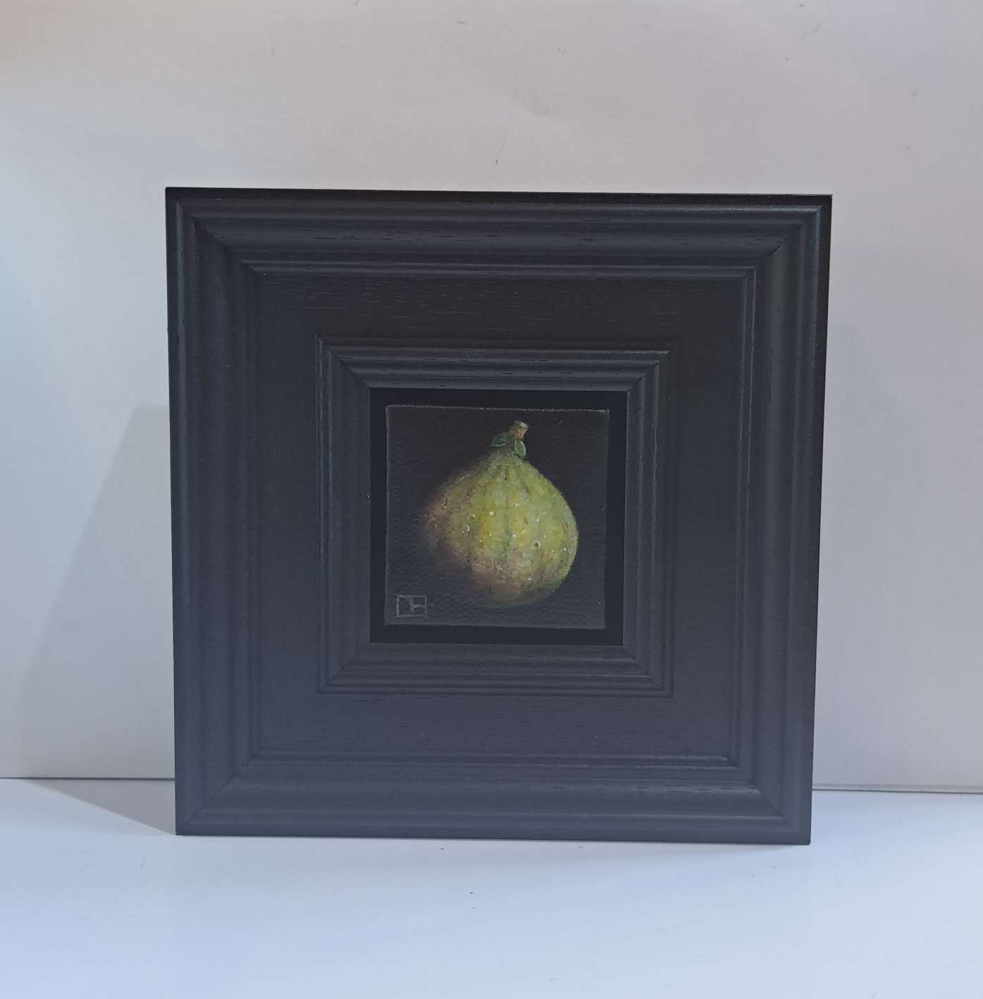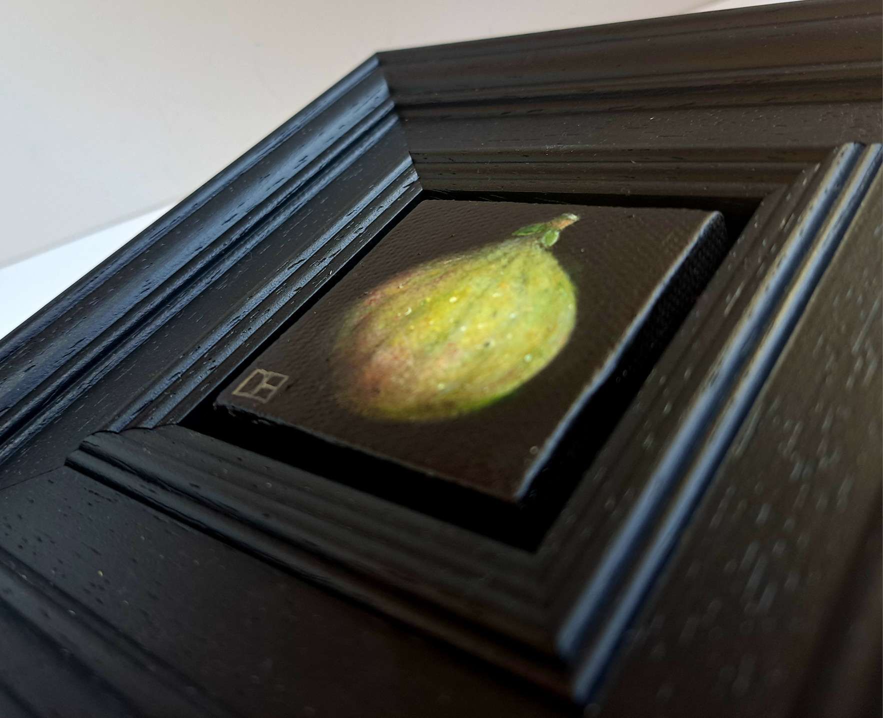 Pocket Green Fig 3c is an original oil painting by Dani Humberstone as part of her Pocket painting series featuring small scale realistic oil paintings, with a nod to baroque still life painting. The paintings are set in a black wood layered frame.