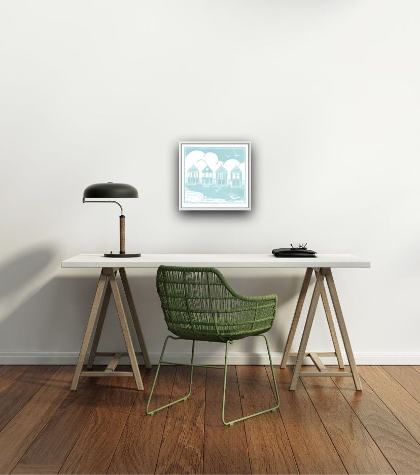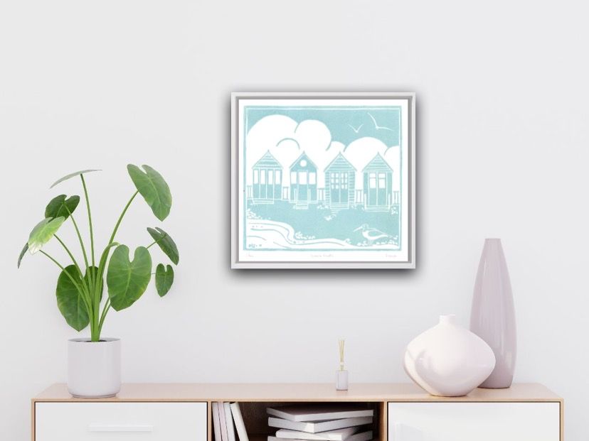 Fiona Carver Four Beach Huts Limited Edition Linocut Print Edition of 50 Image size: H 18cm X W 16.5cm Mounted size: H 31.8cm x W 31cm x D 0.5cm Sold Unframed, mounted in pale cream Please note that in situ images are purely an indication of how a piece may look. Four Beach Huts is a limited edition print by