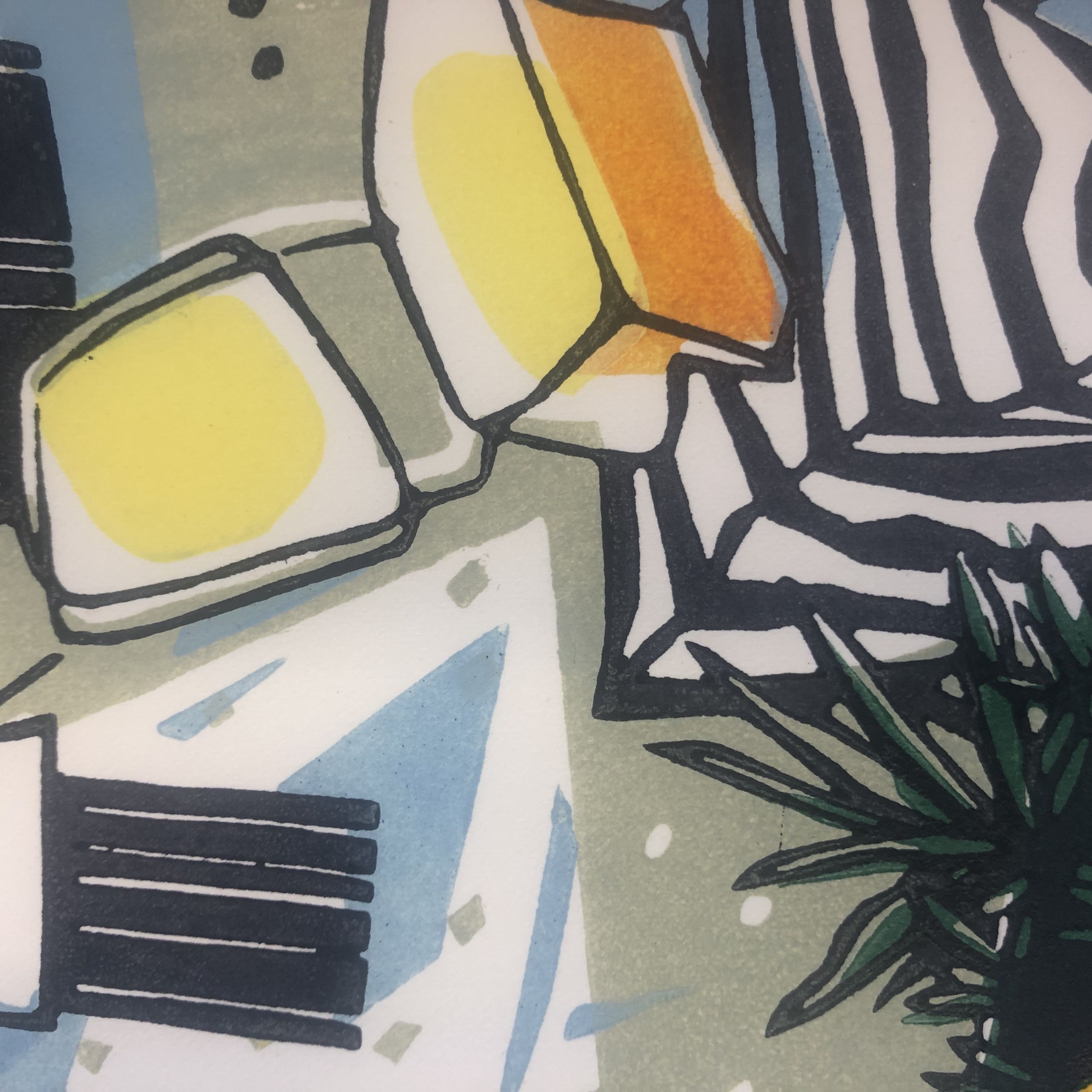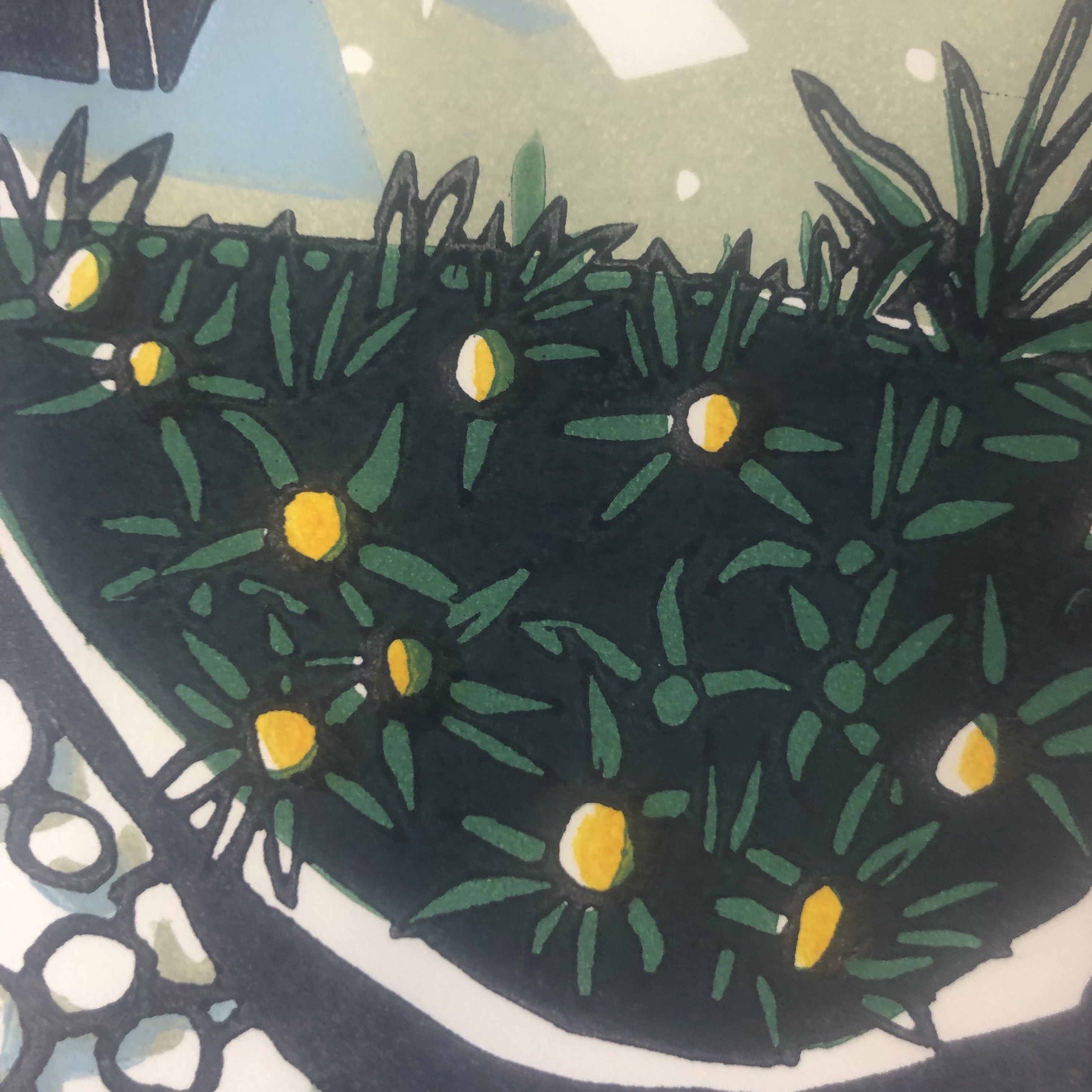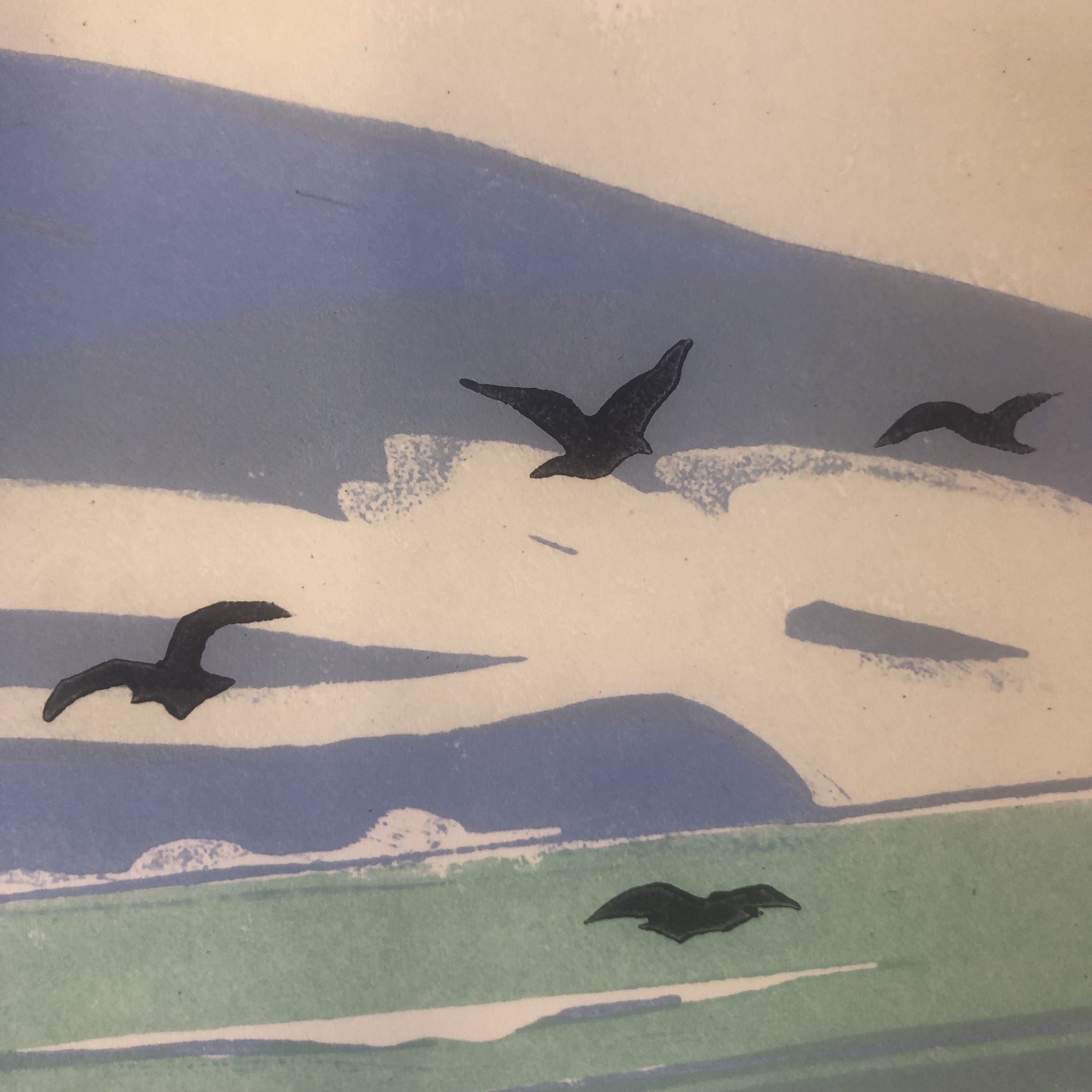 Colin Moore Fish For Sale Limited Edition Linocut Print of 100 3 Block Lino Print Image Size: H 40cm x W 30cm Sheet Size: H 50cm x W 38cm Please note that in situ images are purely an indication of how a piece may look. Fish For Sale is a limited edition 3 block linocut print by