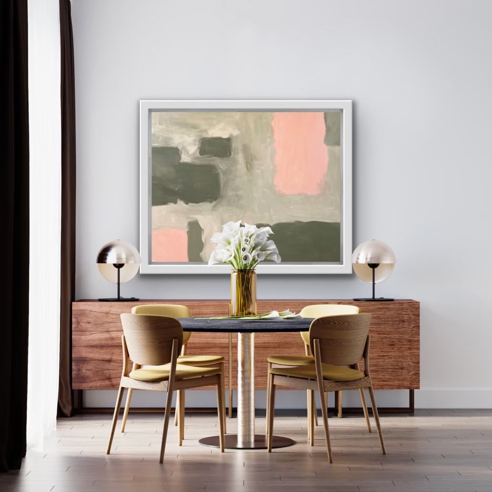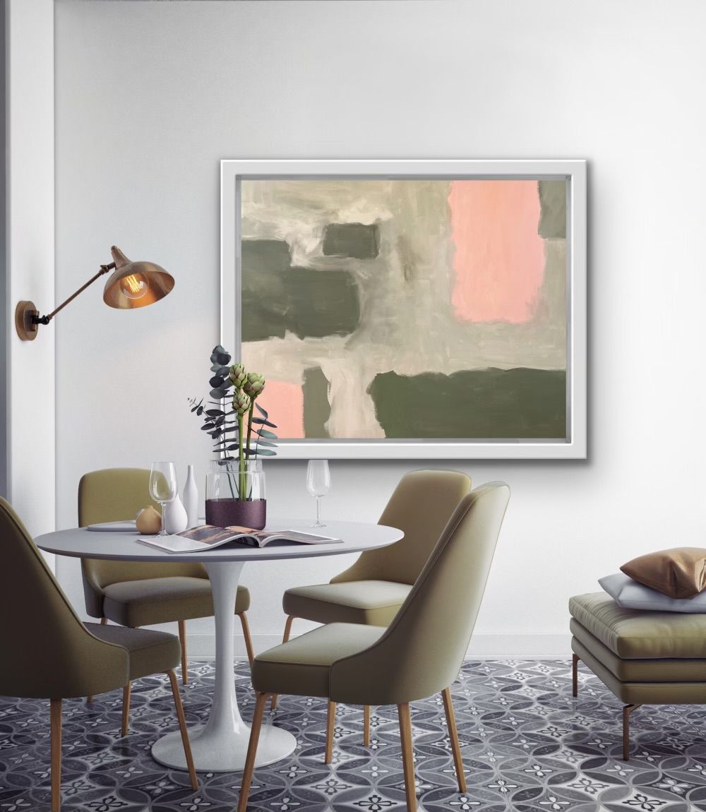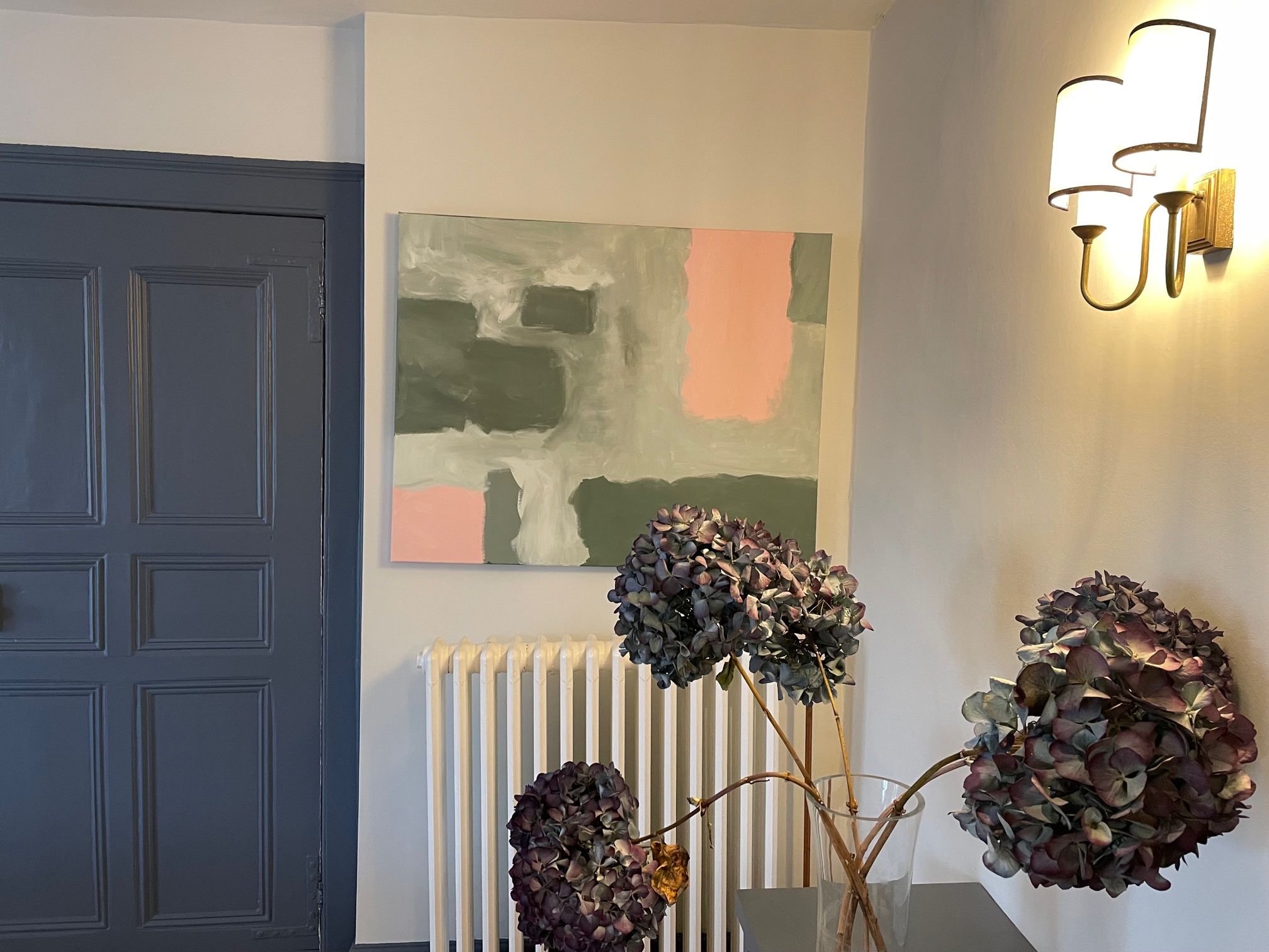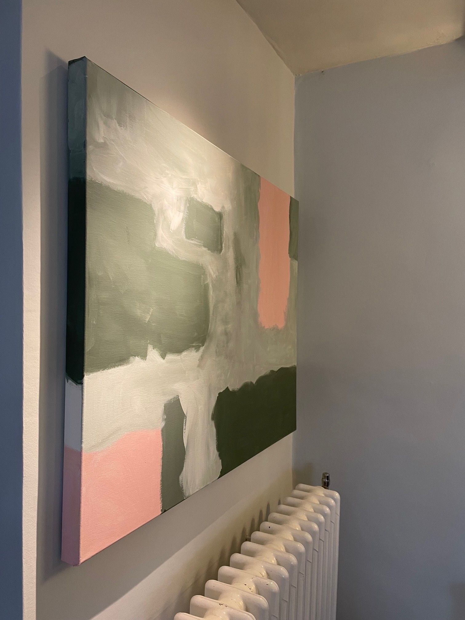 Pink and Green Fields by Fleur Park original Acrylic on canvas Image size: H:100cm x W:80cm Complete Size of Unframed Work: H:100 x W:80cm x D:3cm Sold Unframed Fleur Parks art is influenced by the push and pull of her country life vs her old city life. The juxtaposition of these two is seen in