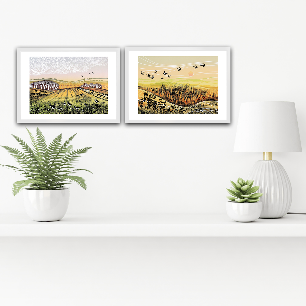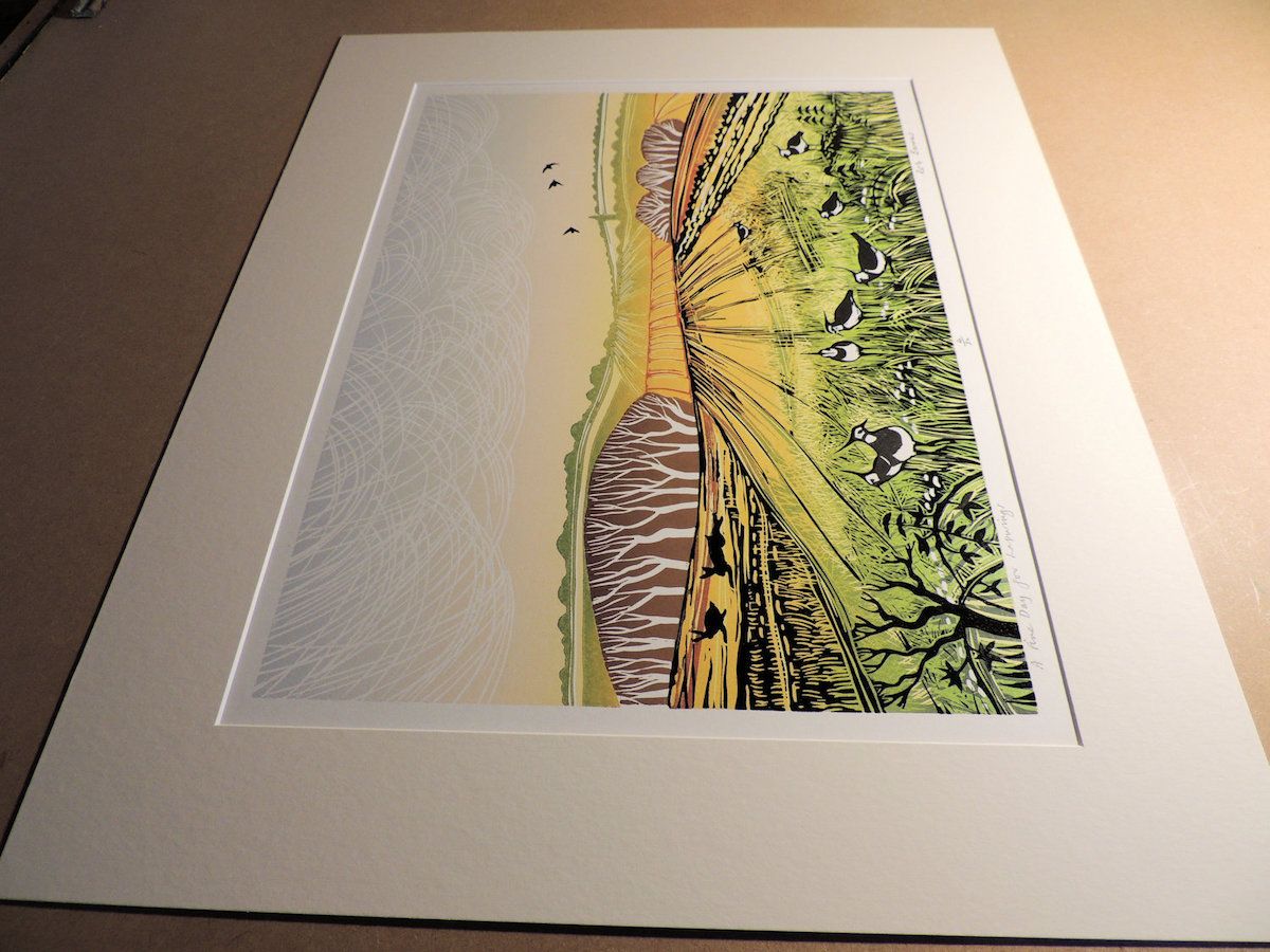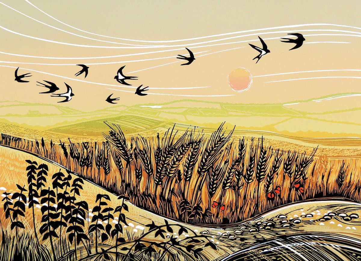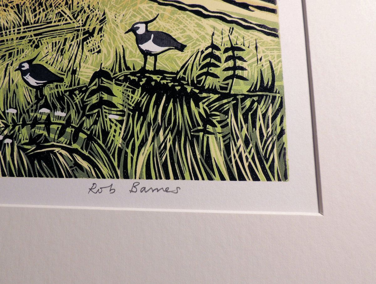 Flight Over Barley by Rob Barnes [2021] This is an early summer creation, when barley is at its best and the wind blows through it. Everything has movement and a flight of birds adds to the spectacle. A Fine Day For Lapwings by Rob Barnes [2021] This linocut was inspired by seeing lapwings