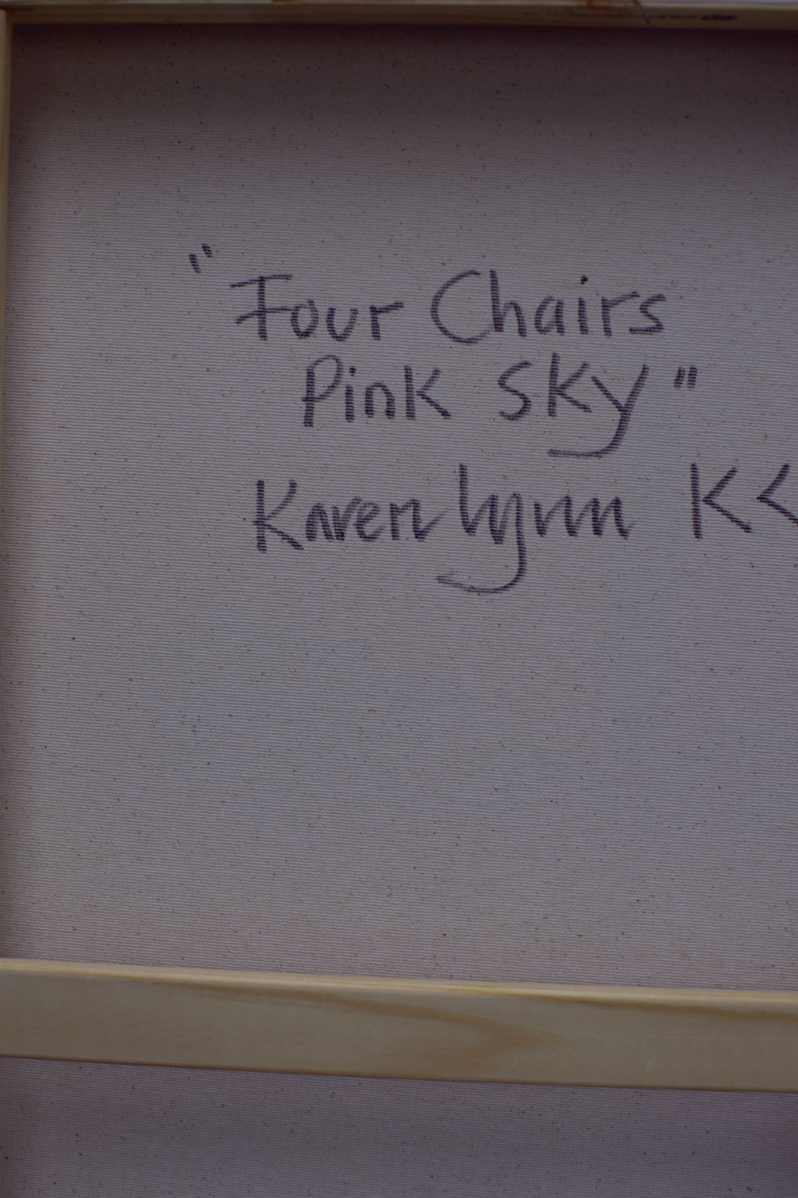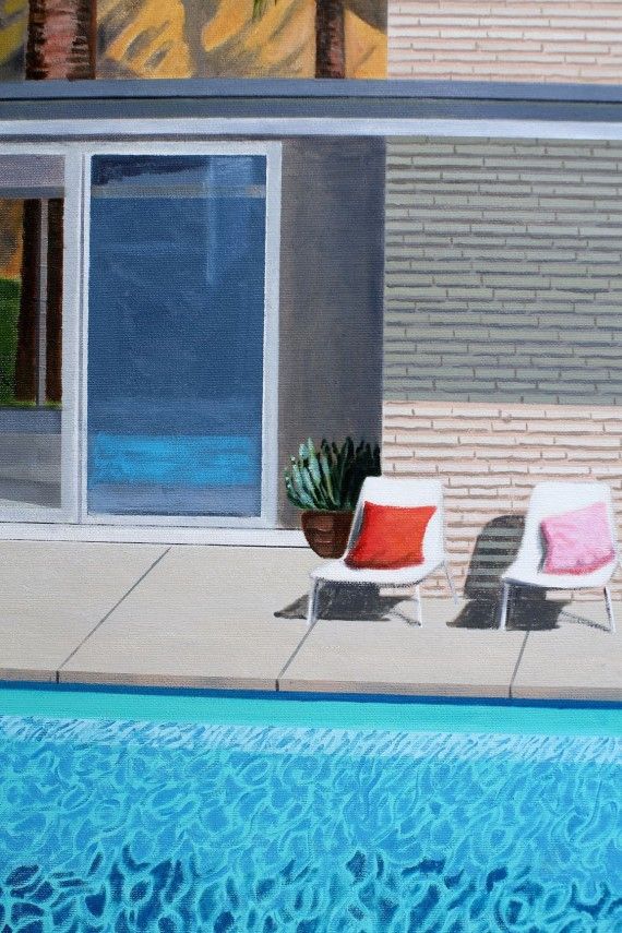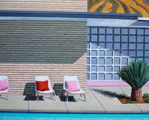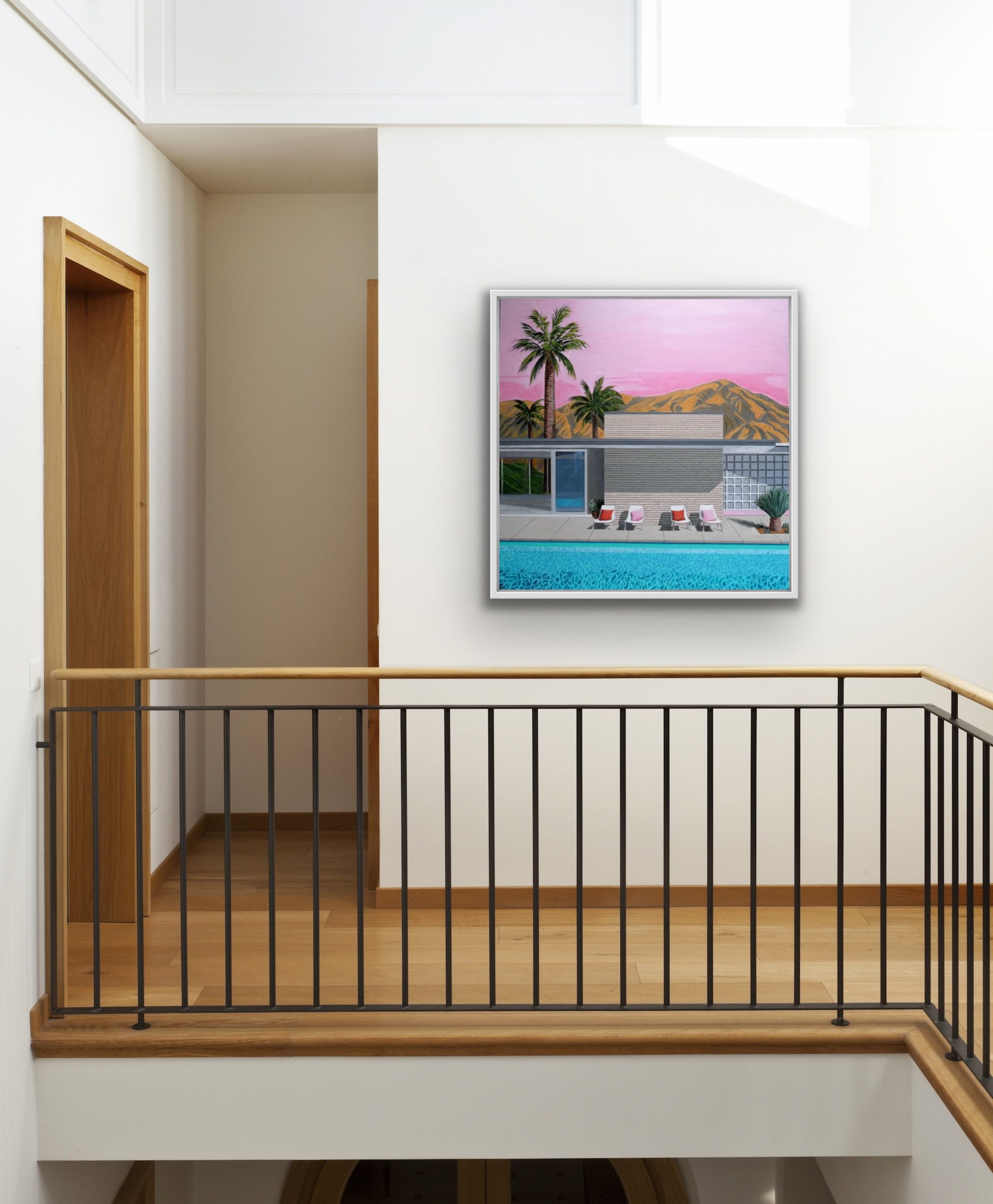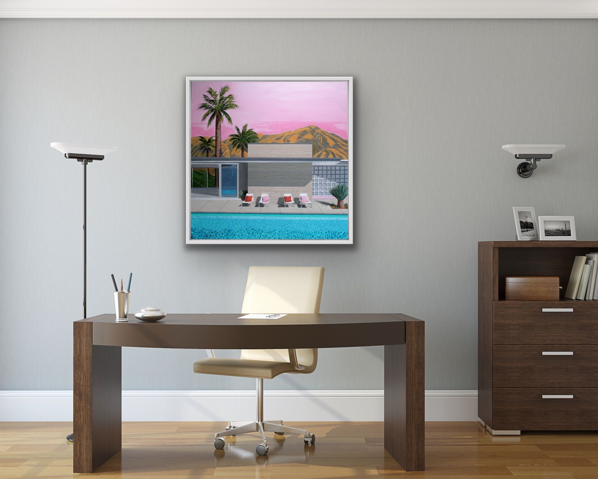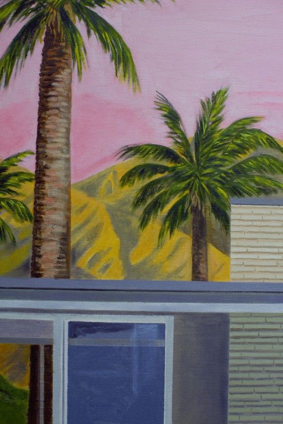 This is a painting from my architectural series of works. In this particular painting I chose a pink sky against a modernist home with a turquoise pool to capture the feeling of heat and sun in a tropical paradise. orange mountains, green palm trees and a splash of pink and orange to