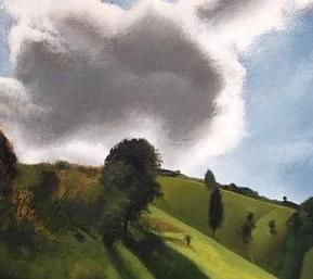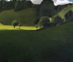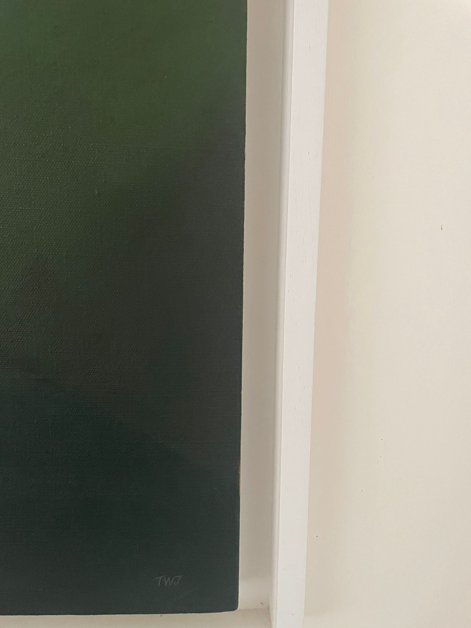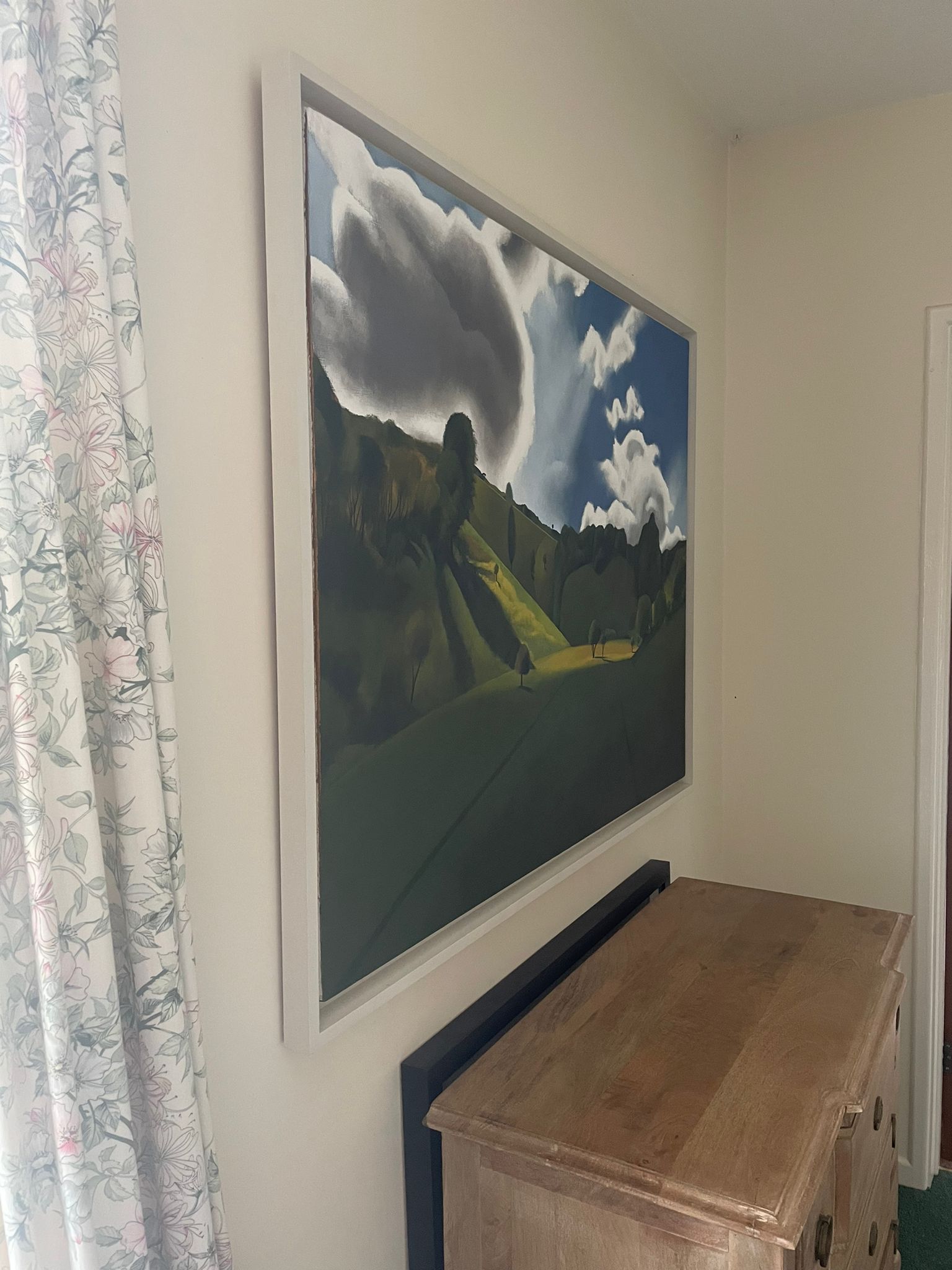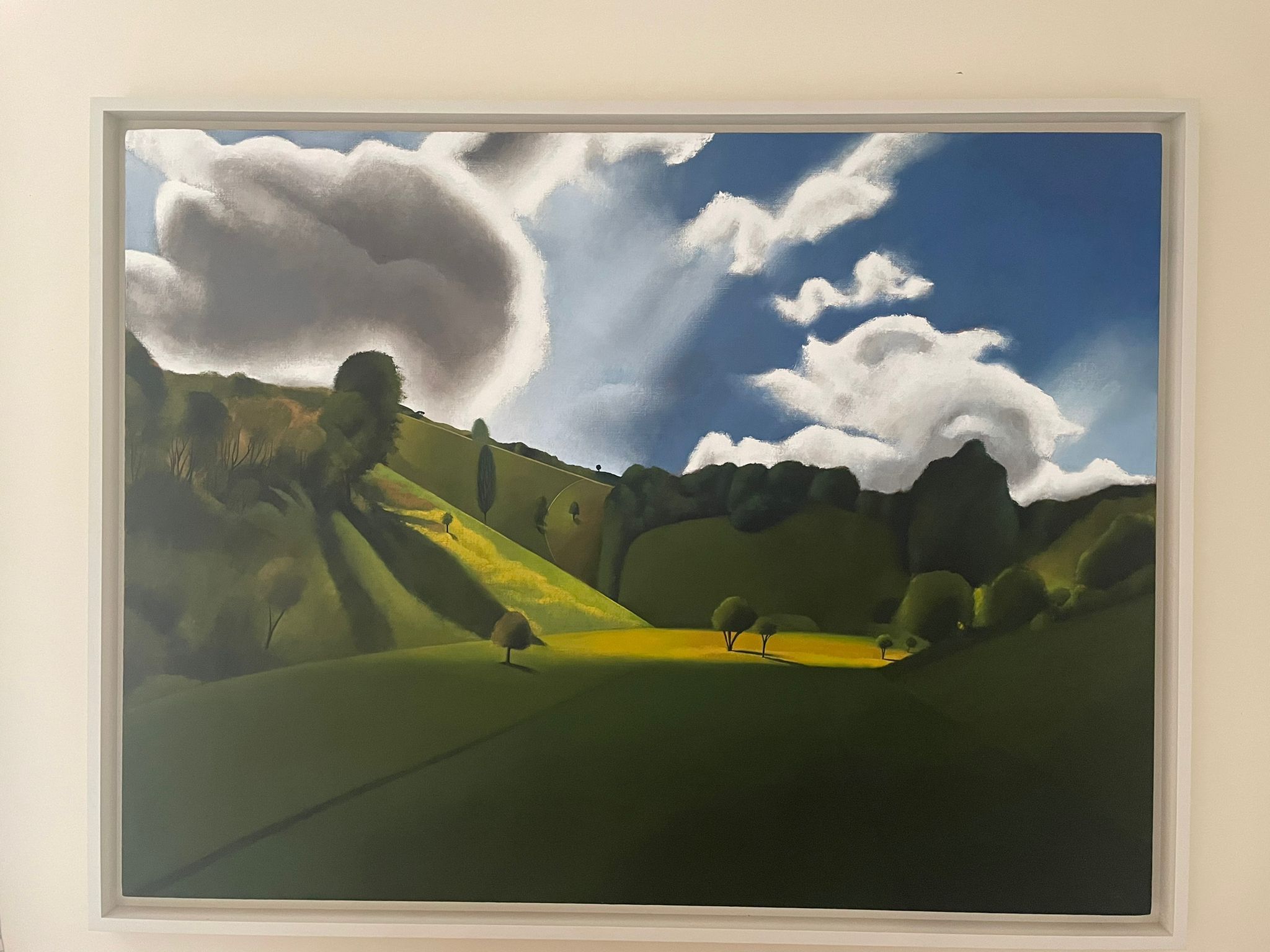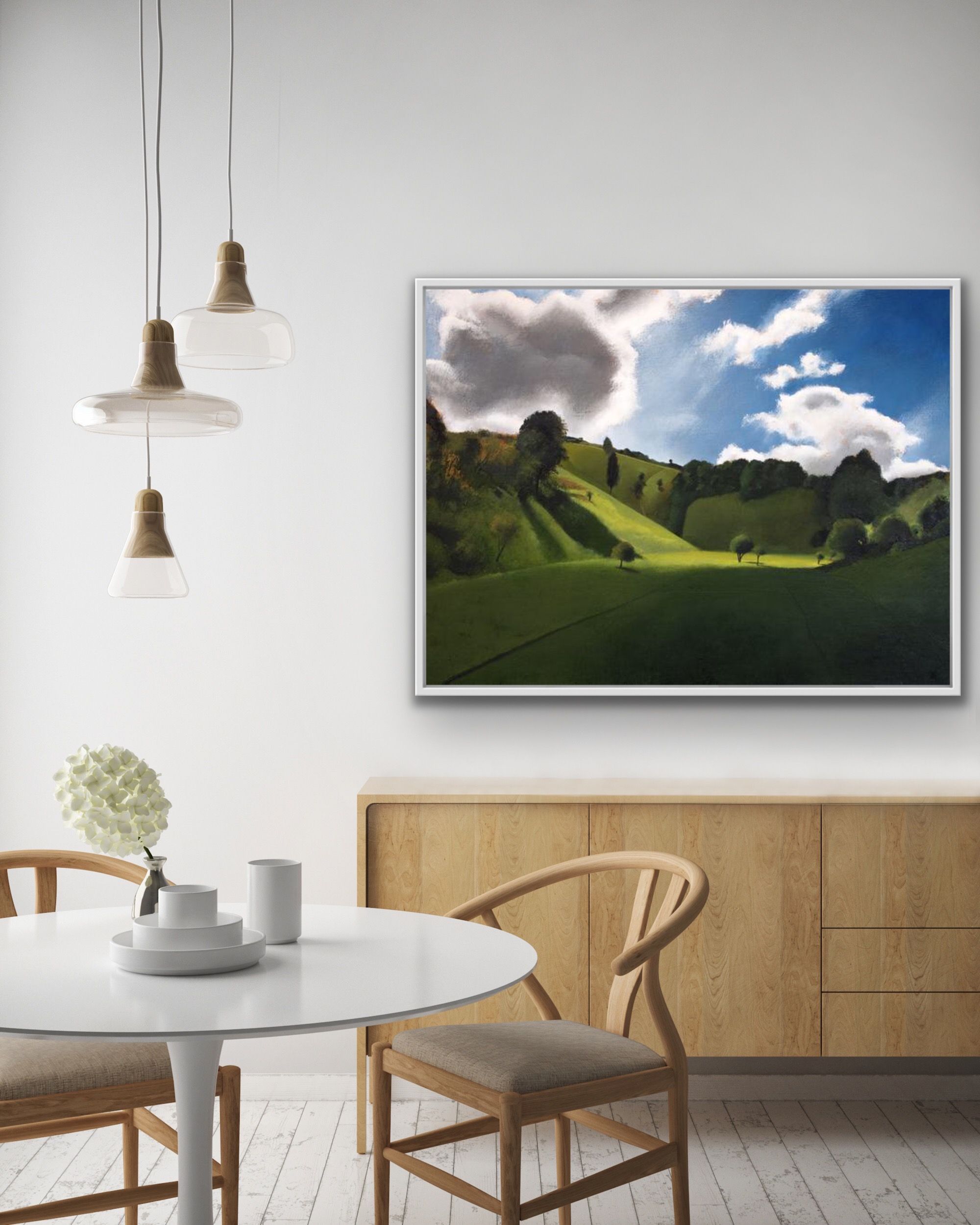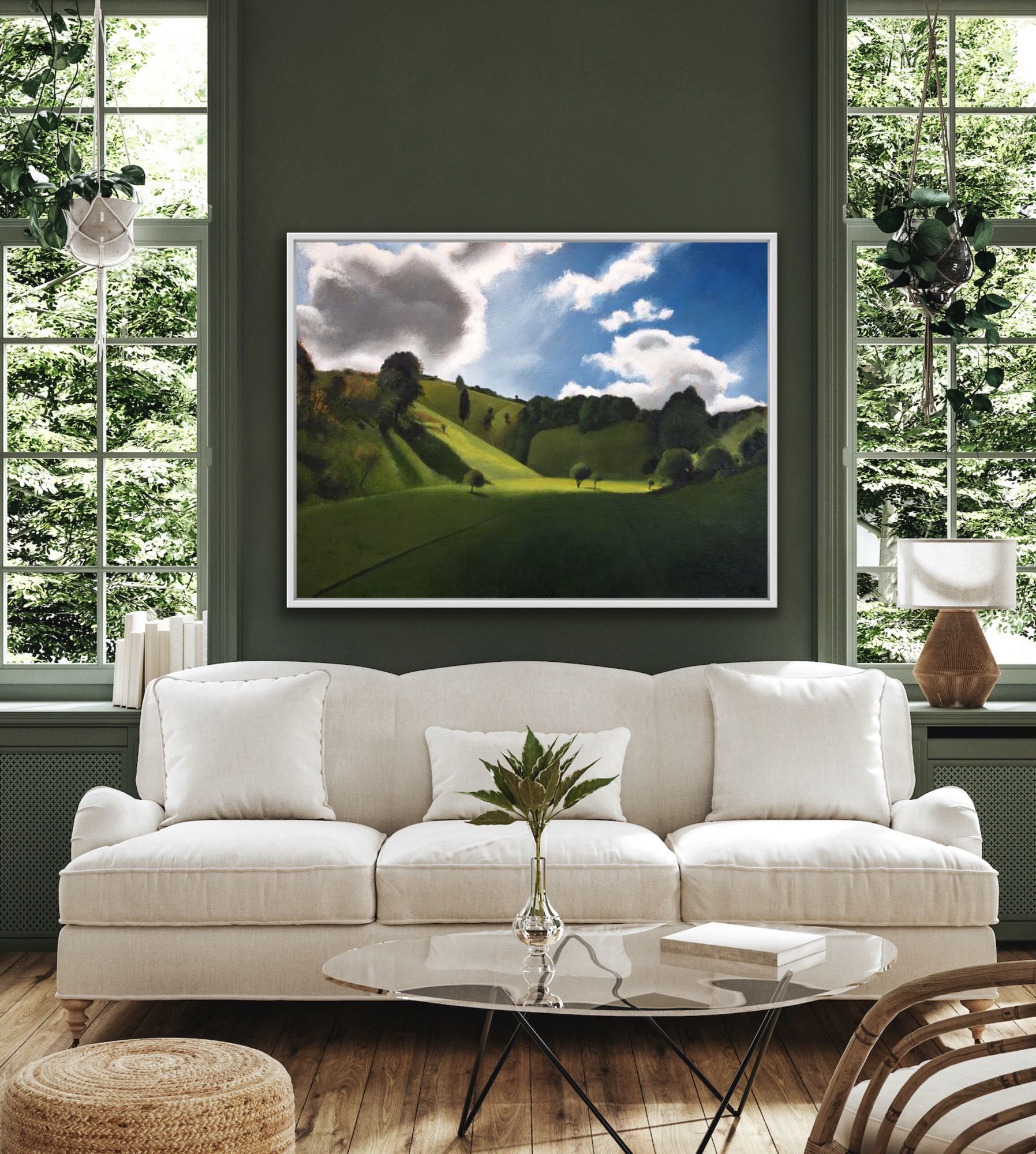 Framed Pegsdon is an original oil painting by artist and painter Tim Woodcock-Jones. The vibrant green tones bring the landscape painting to life and really captures the natural light.