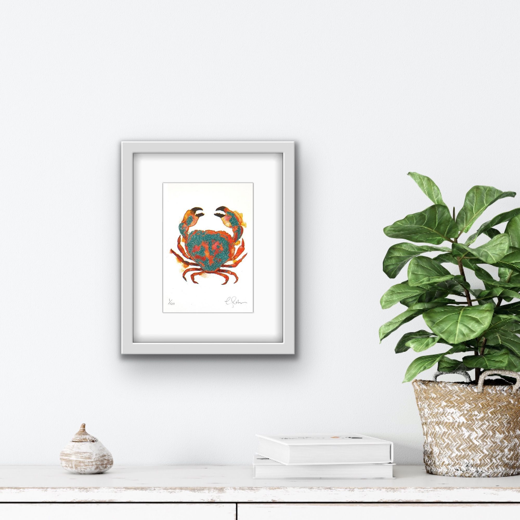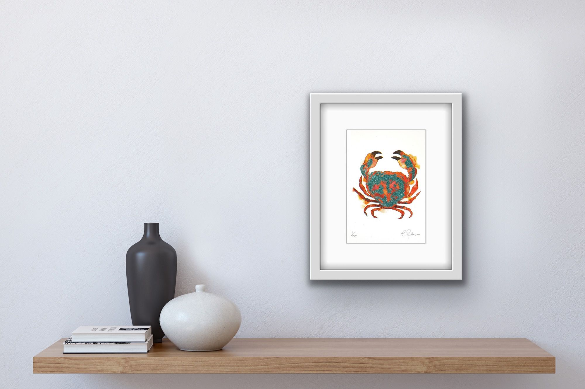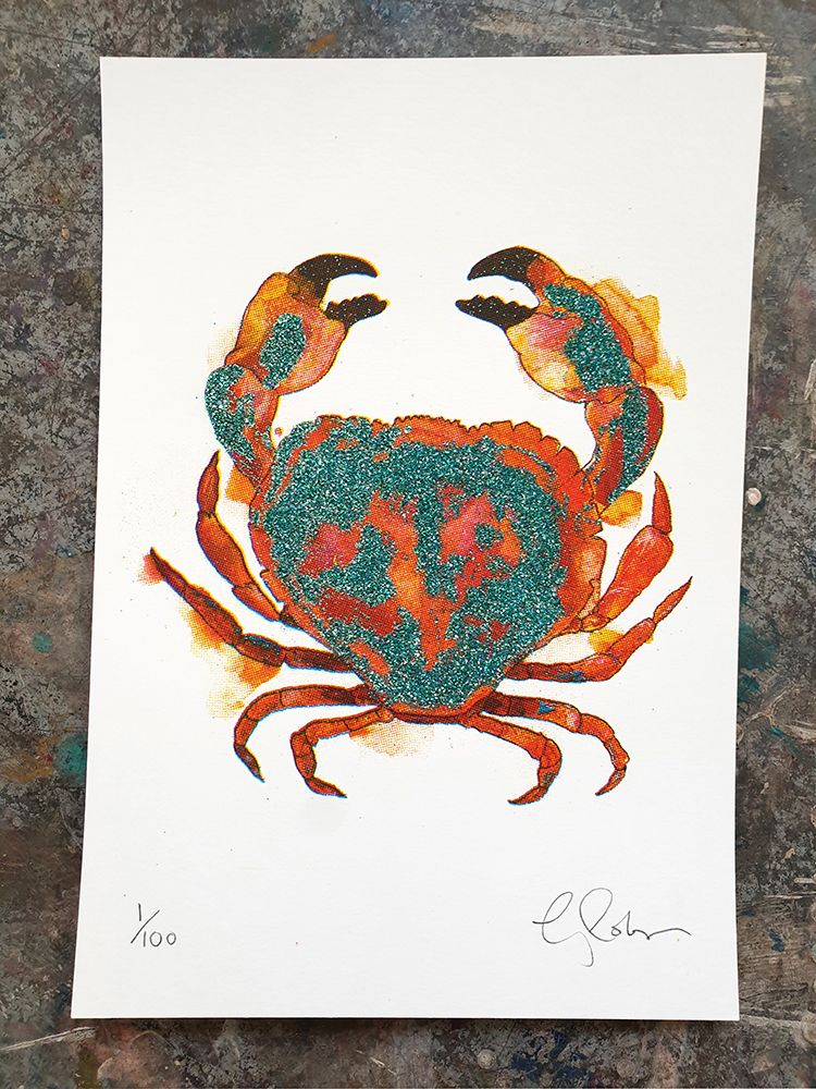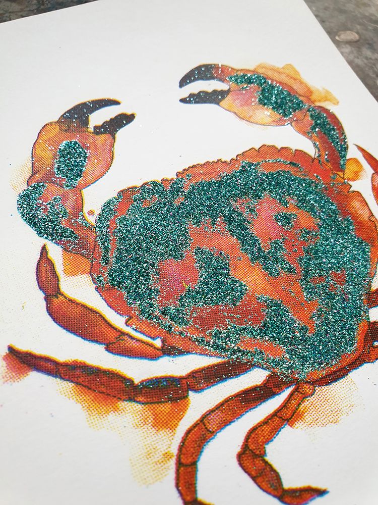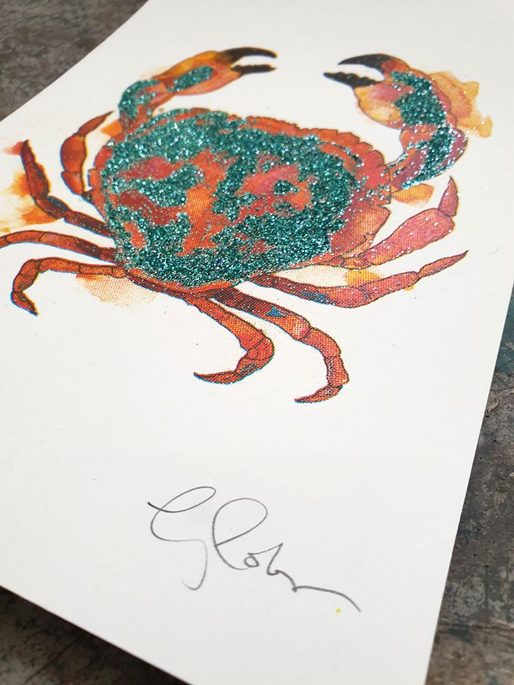 A hand crafted five layer screen print of a painted illustration by the artist of a crab on heritage white paper. With a final layer hand glittered.