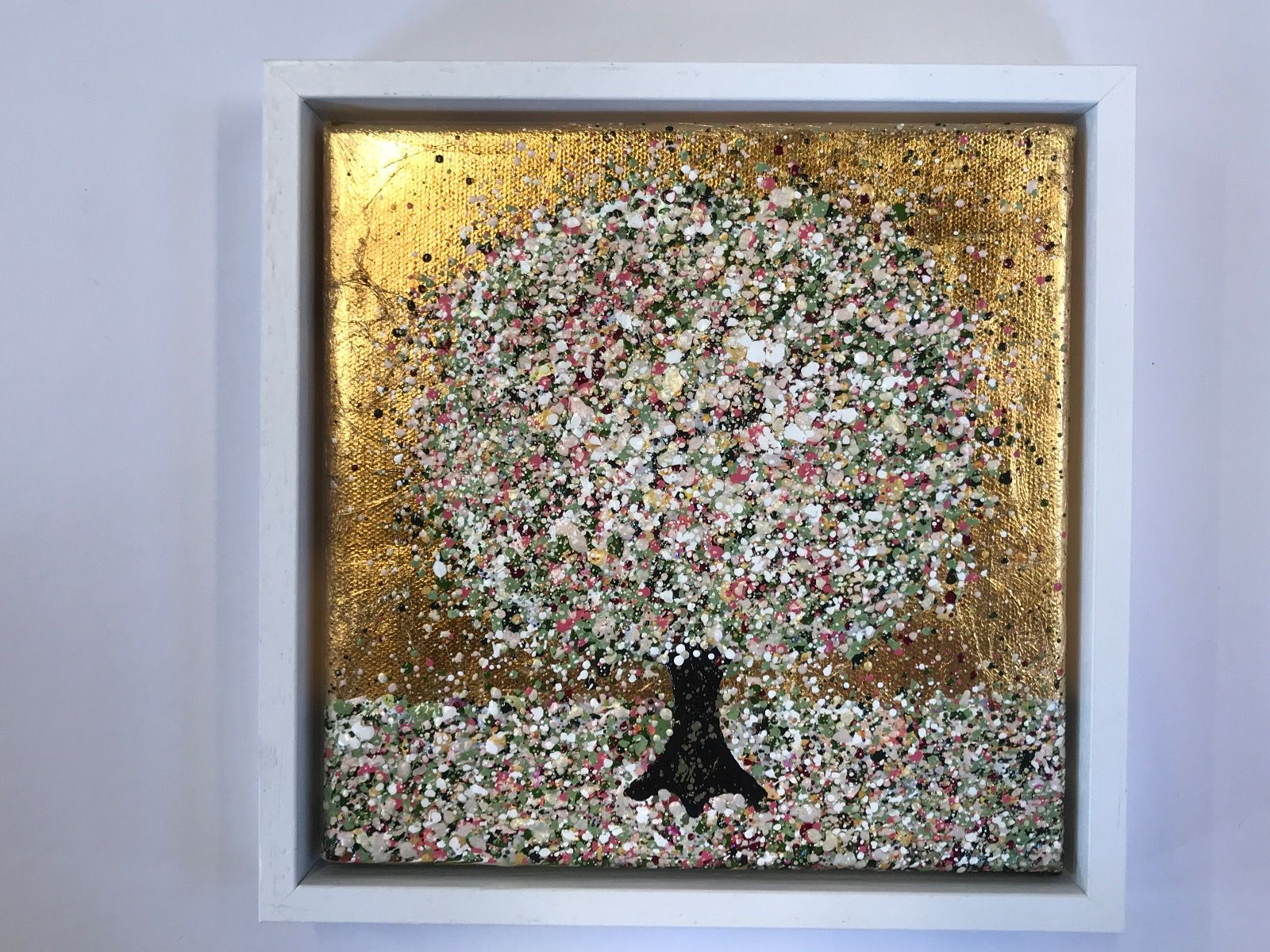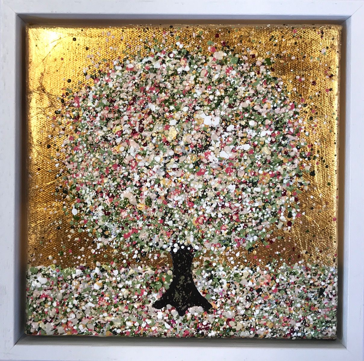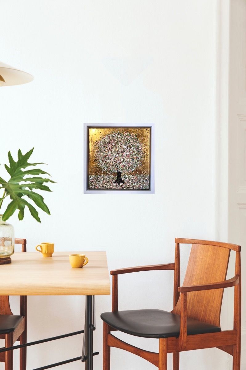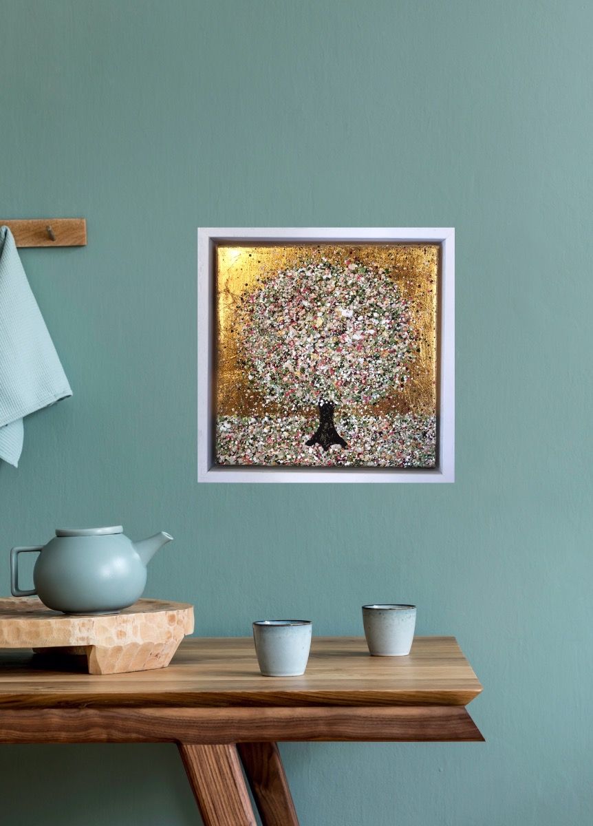 New original landscape painting by Nicky Chubb. Colourful and textured landscape painting of a tree with a shiny background. ADDITIONAL INFORMATION: signed and dated by artist on the back of the painting Acrylic on Canvas 23.2 H x 23.2 W x 4 D cm (9.13 x 9.13 x 1.57 in) Sold framed Image size: Height: 20.5cm