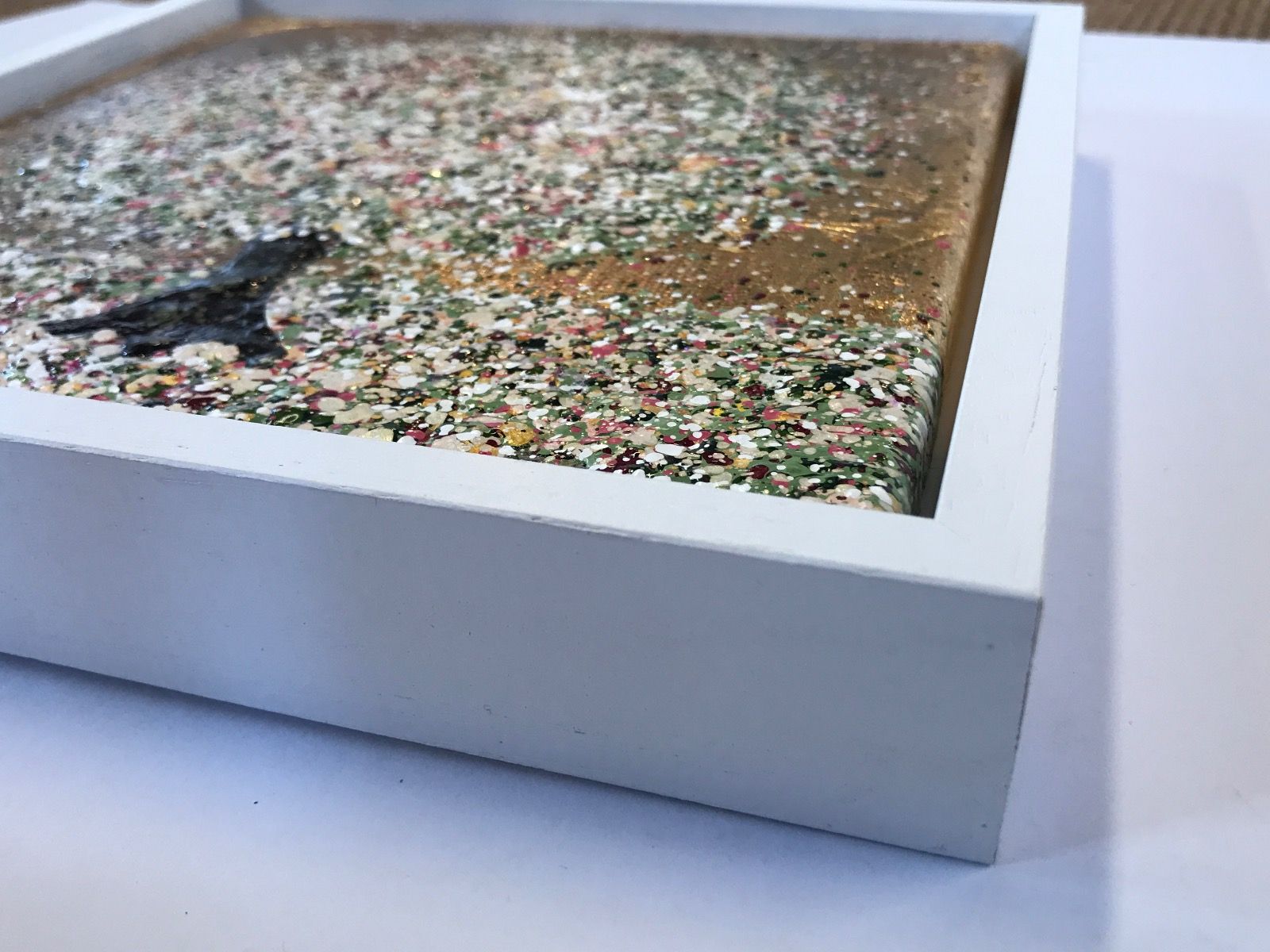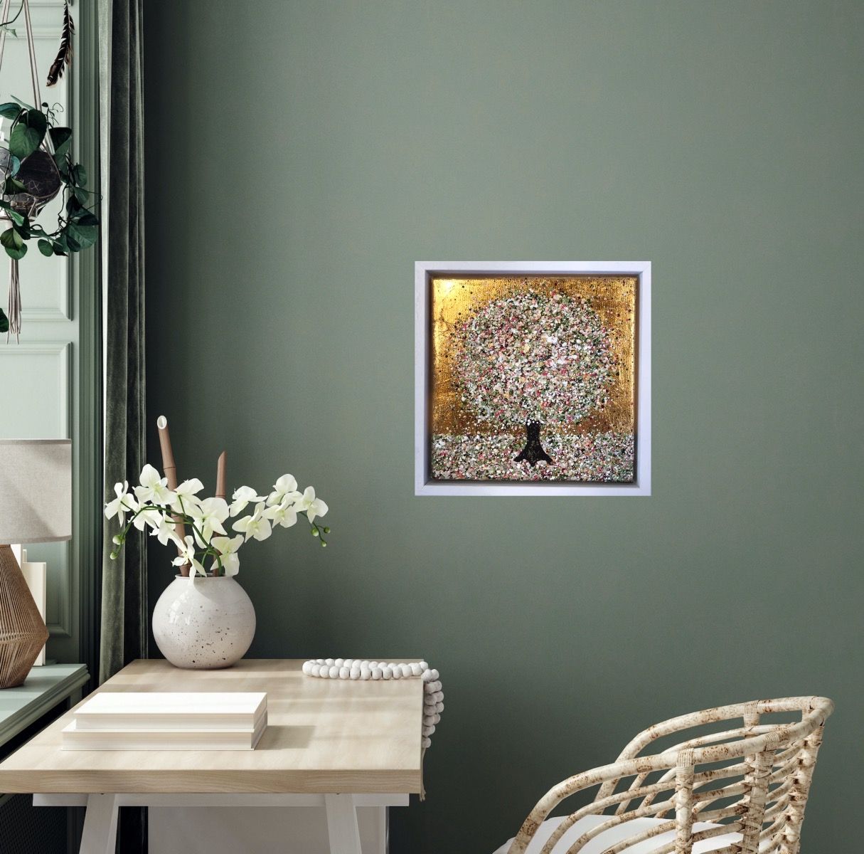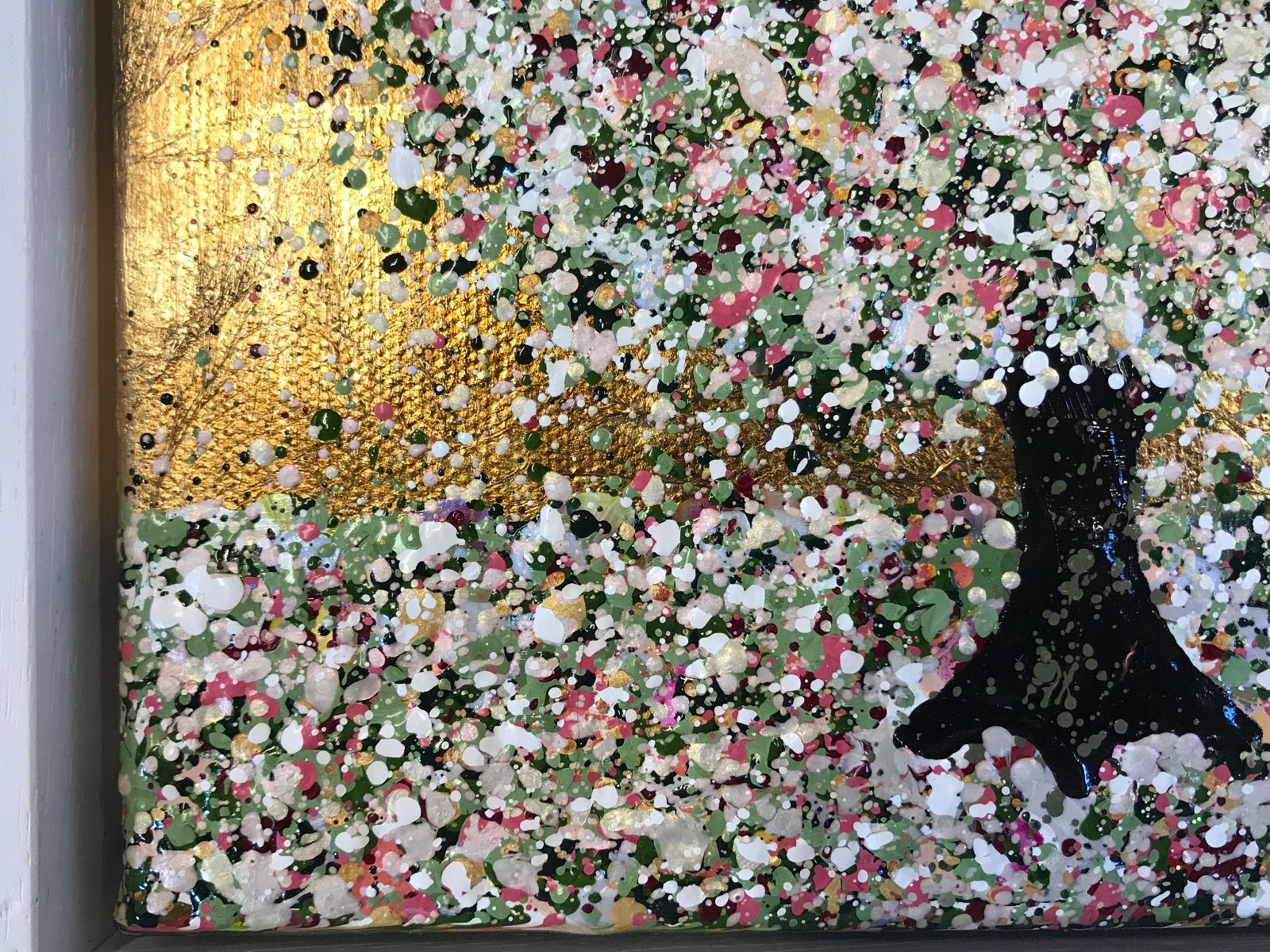 New original landscape painting by Nicky Chubb. Colourful and textured landscape painting of a tree with a shiny background. ADDITIONAL INFORMATION: signed and dated by artist on the back of the painting Acrylic on Canvas 23.2 H x 23.2 W x 4 D cm (9.13 x 9.13 x 1.57 in) Sold framed Image size: Height: 20.5cm