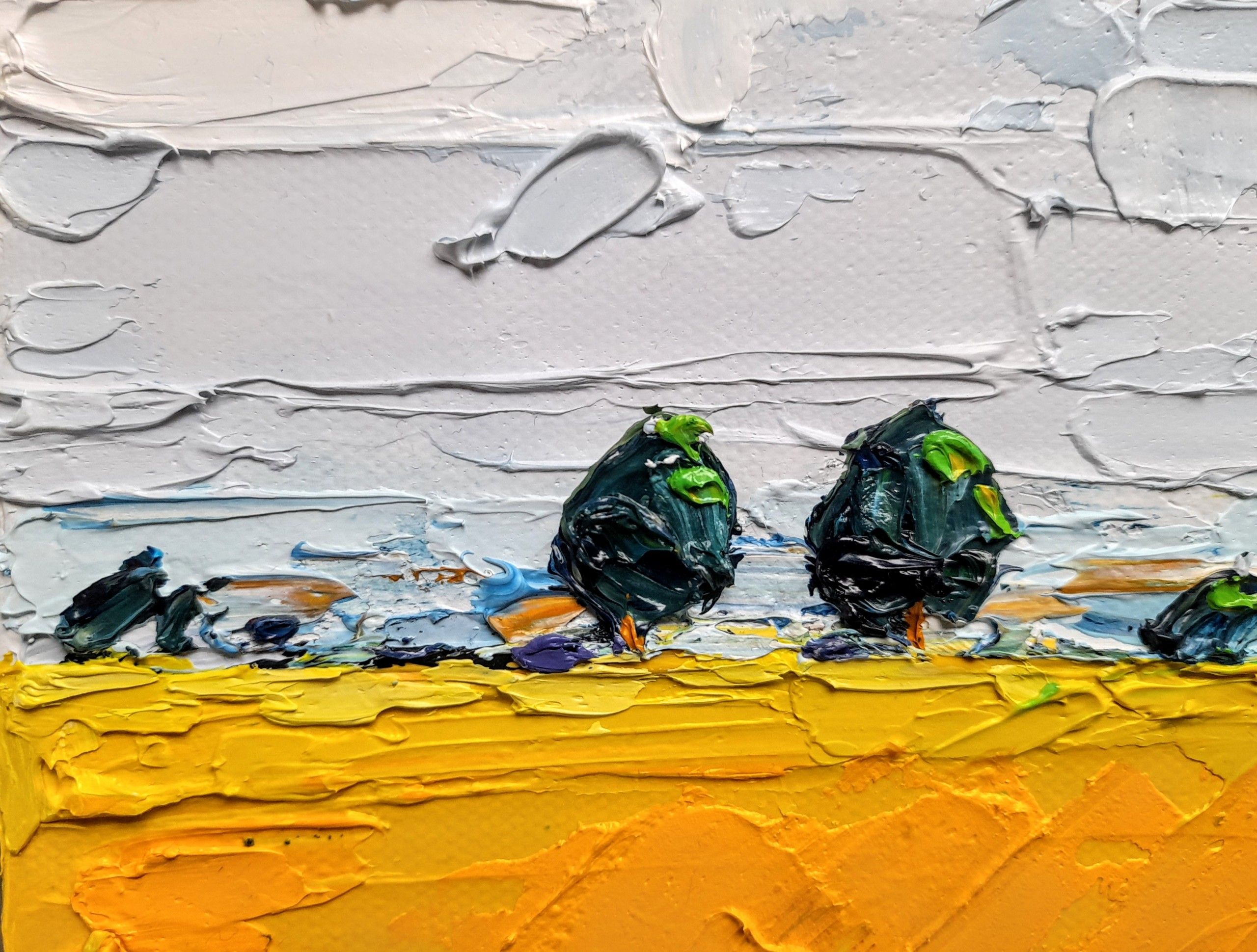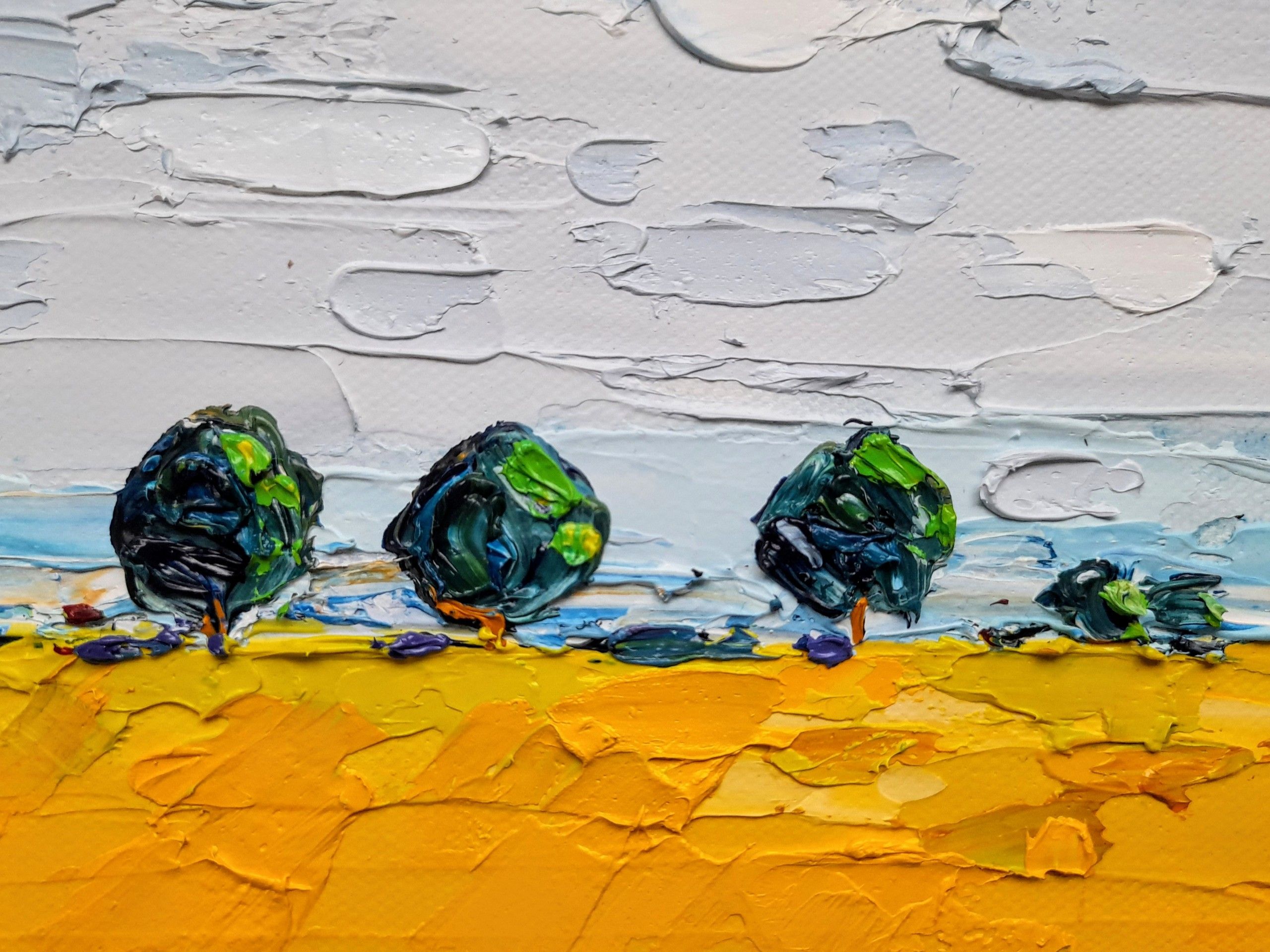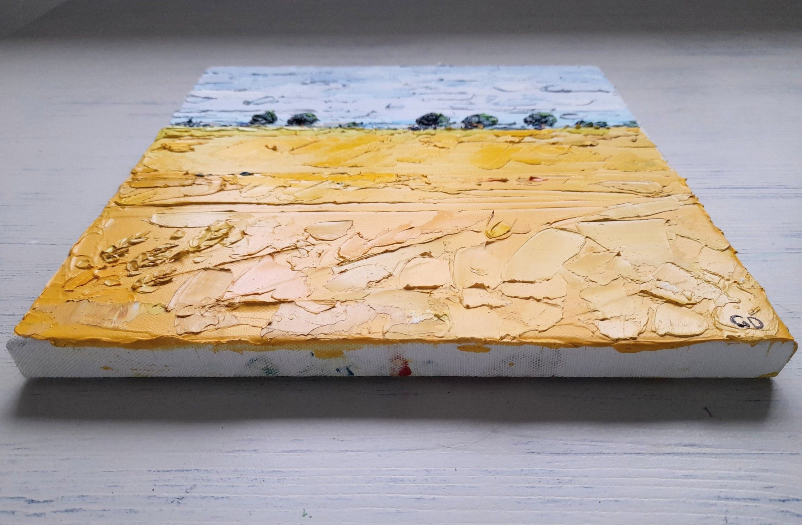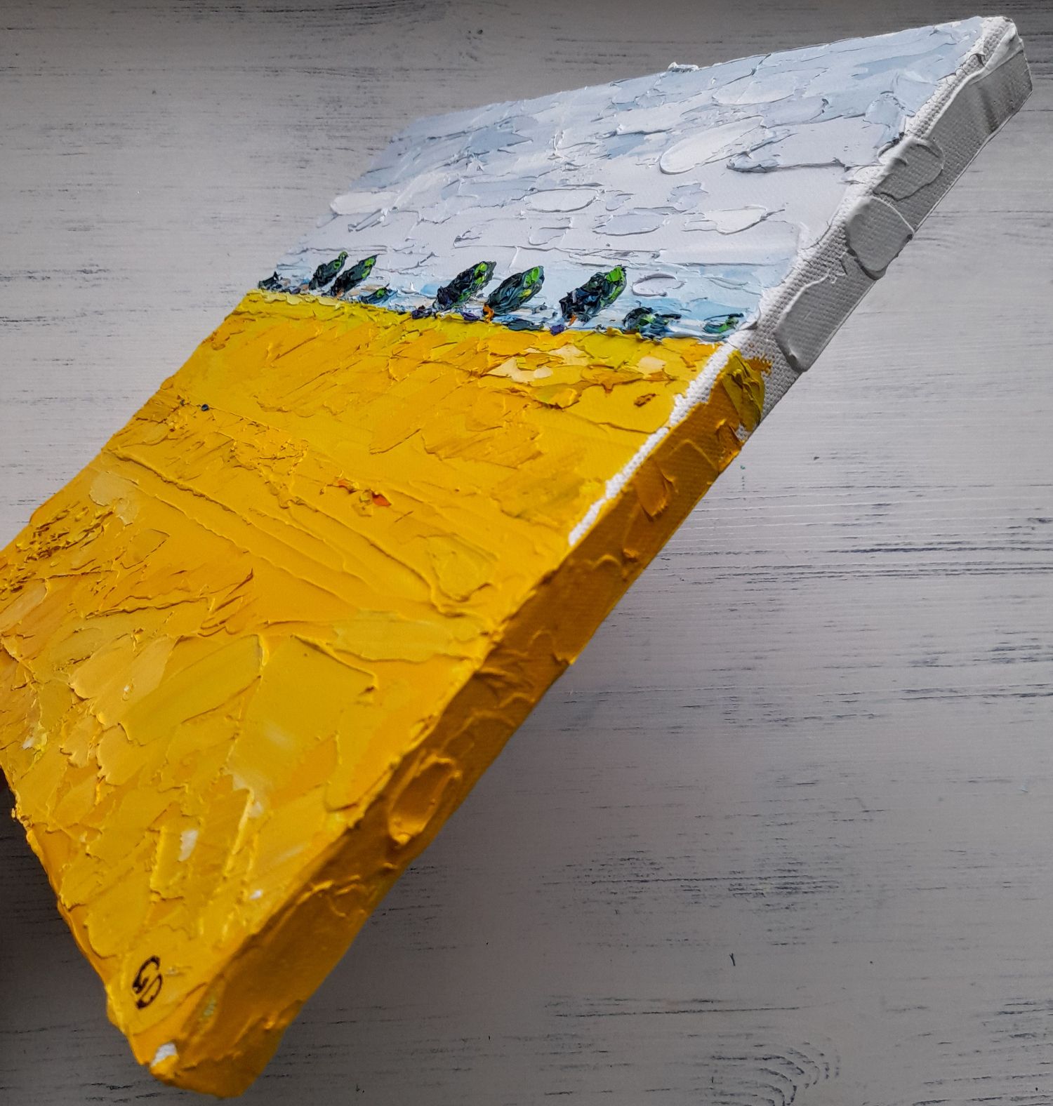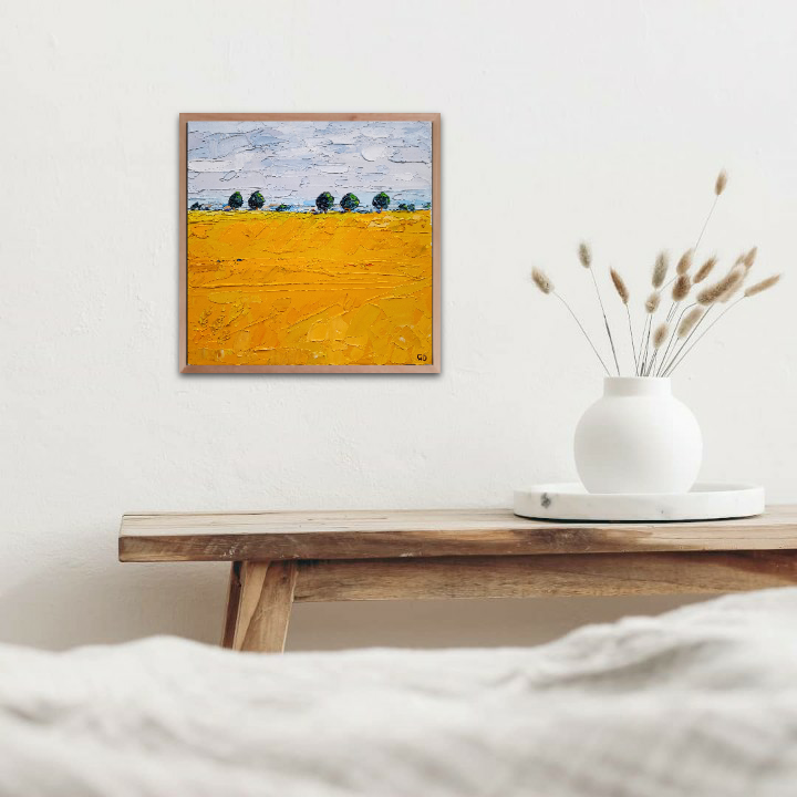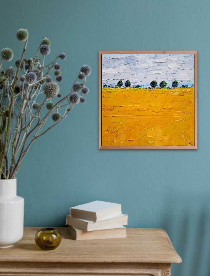 Yellow field, Cotswolds’ is an original landscape painting by Georgie Dowling. A photograph was taken on a dog walk as a reference for this piece which was then created in my home studio. The painting depicts a field of barley and a row of trees that surround it. The autumnal