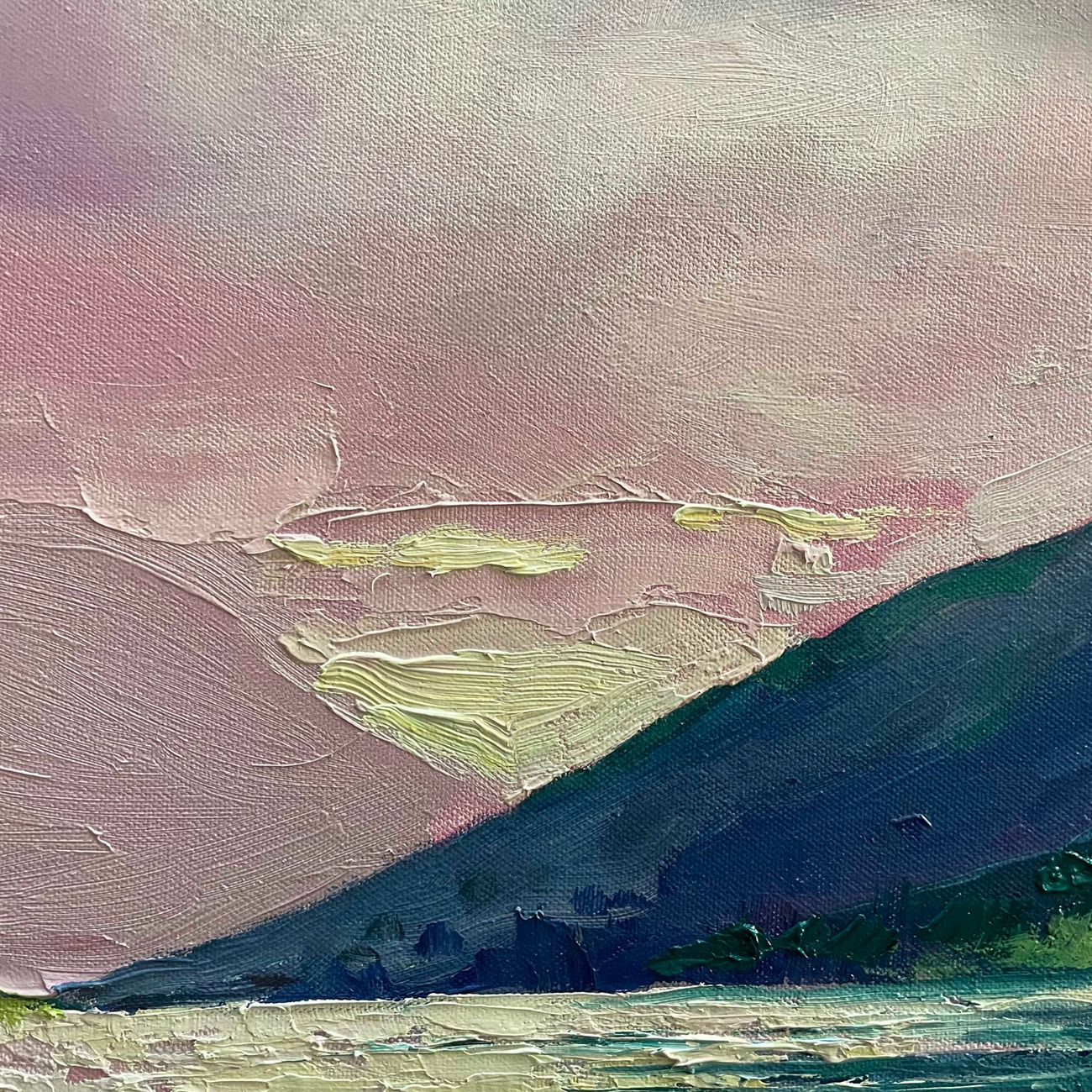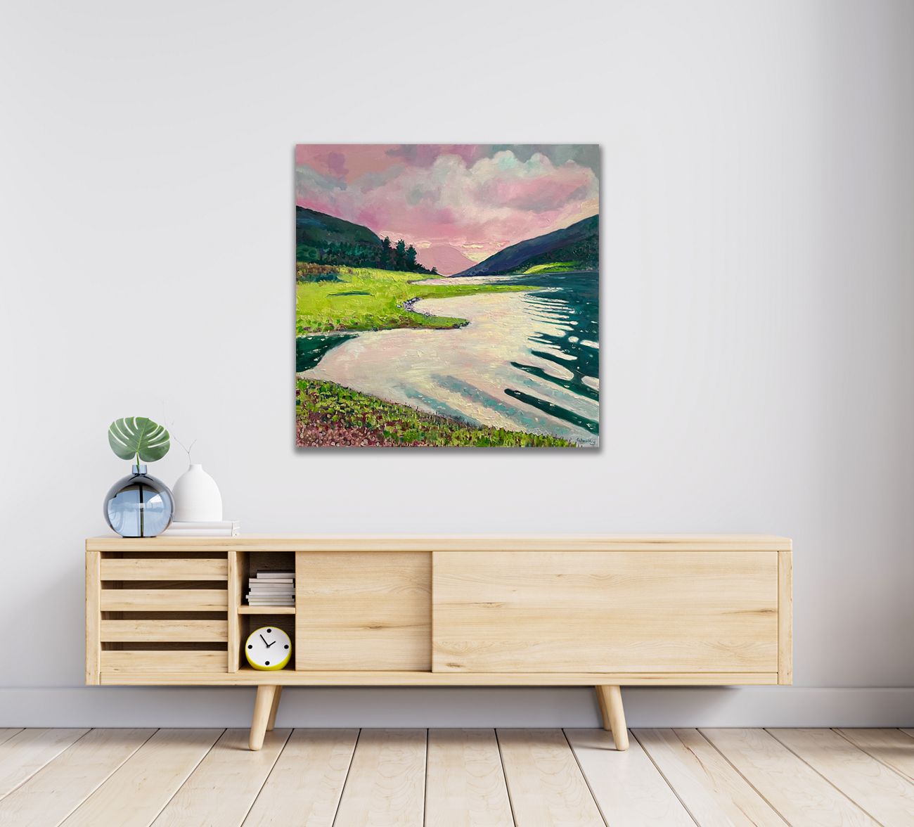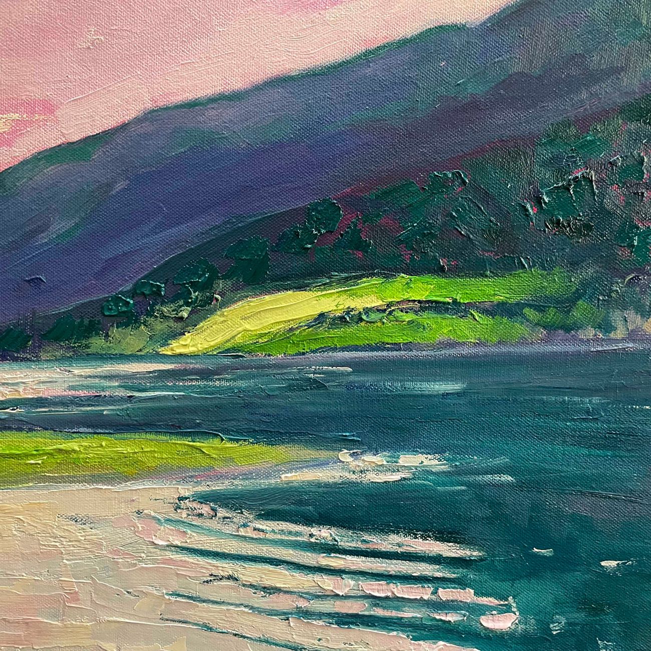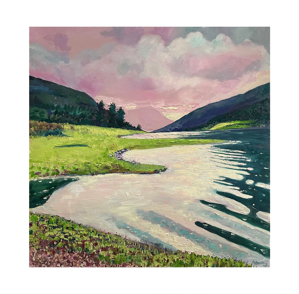 Glencoe Dusk is an original oil painting by Eleanor Woolley. The painting portrays a Glencoe valley at dusk, with Loch Levan leading our eyes up to the mountains beyond. The setting sun and dusky pink clouds reflect on the water, which ripples gently in the foreground. Palette knife and paintbrush