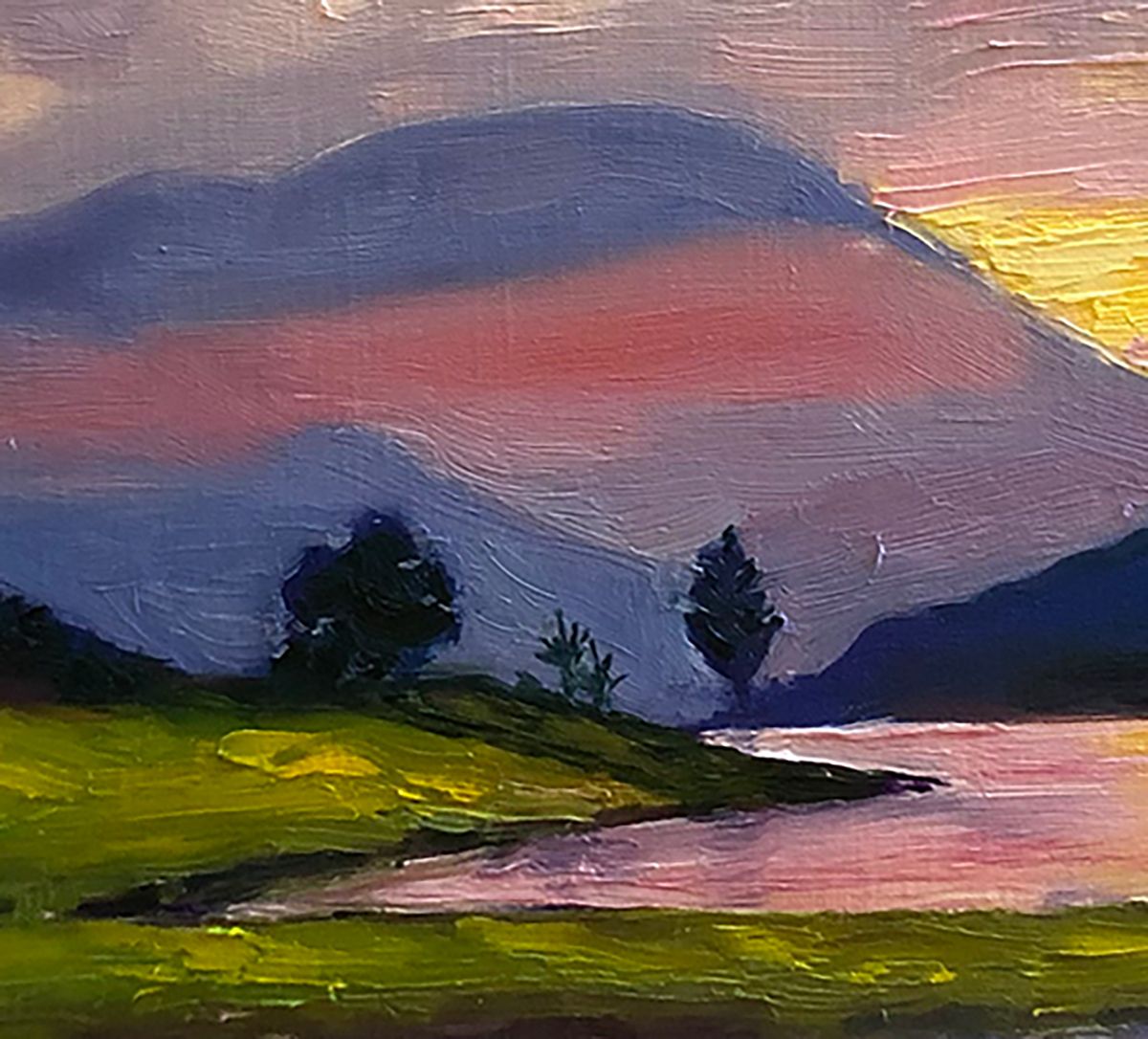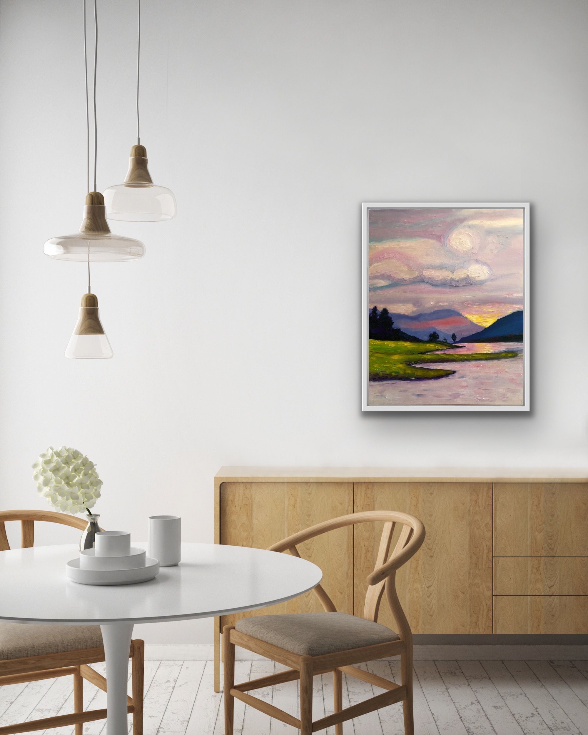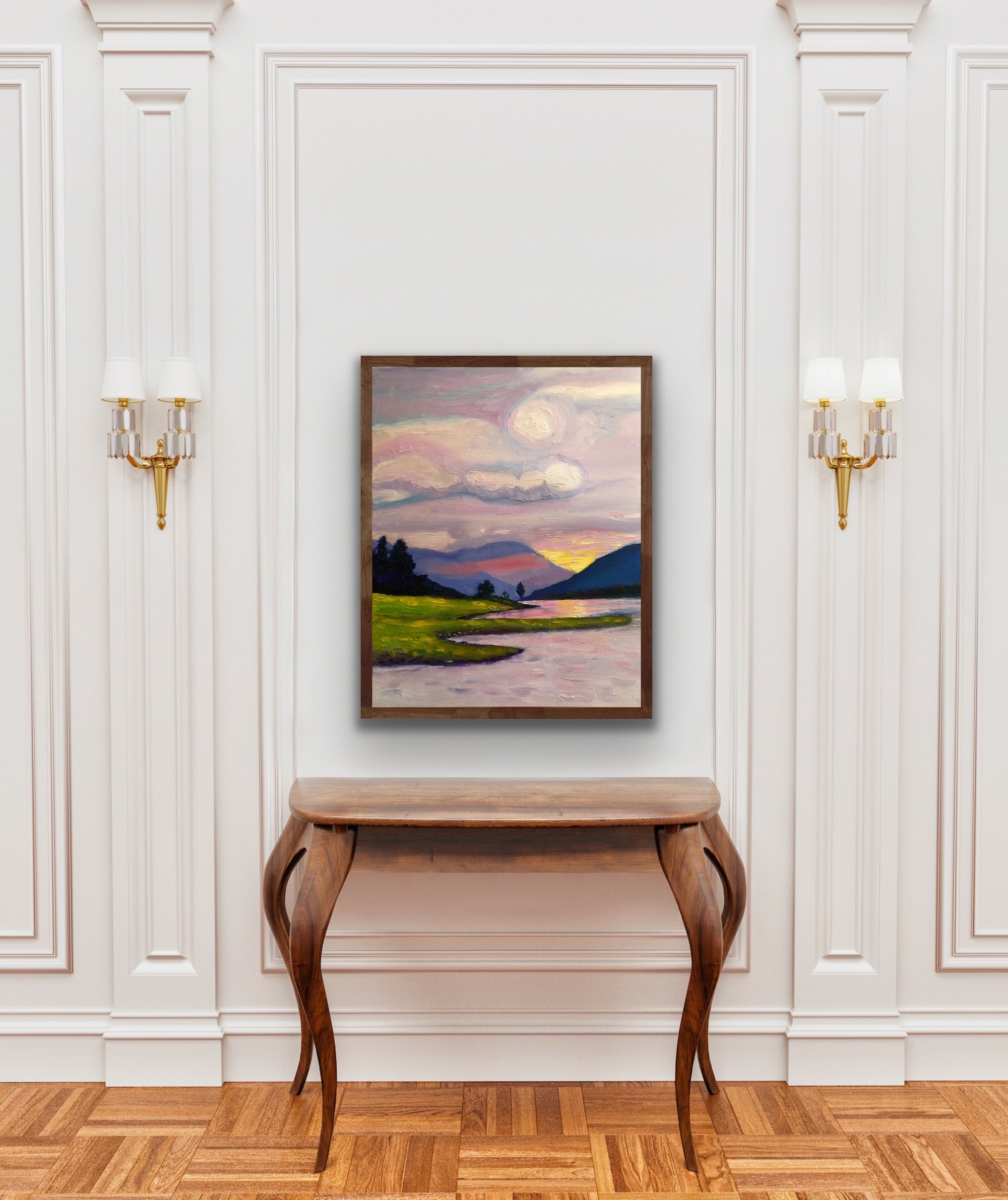 Glencoe Sunset is an Original Painting by Eleanor Woolley. Inspired by the most wonderful sunsets of Glencoe. Looking up the River Coe towards Loch Levan with Binnein Mor and the beginnings of Ben Nevis in the background. The light has a dreamlike quality, the lilacs of the sky are extremely calming.