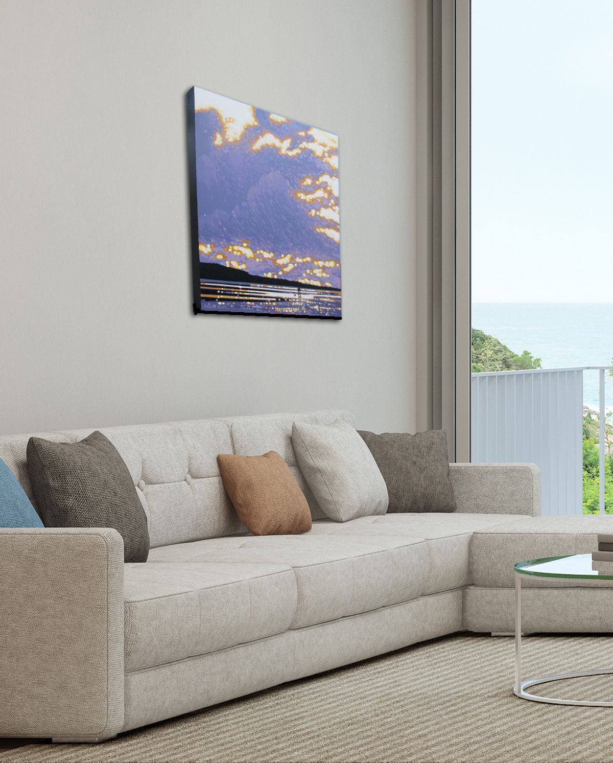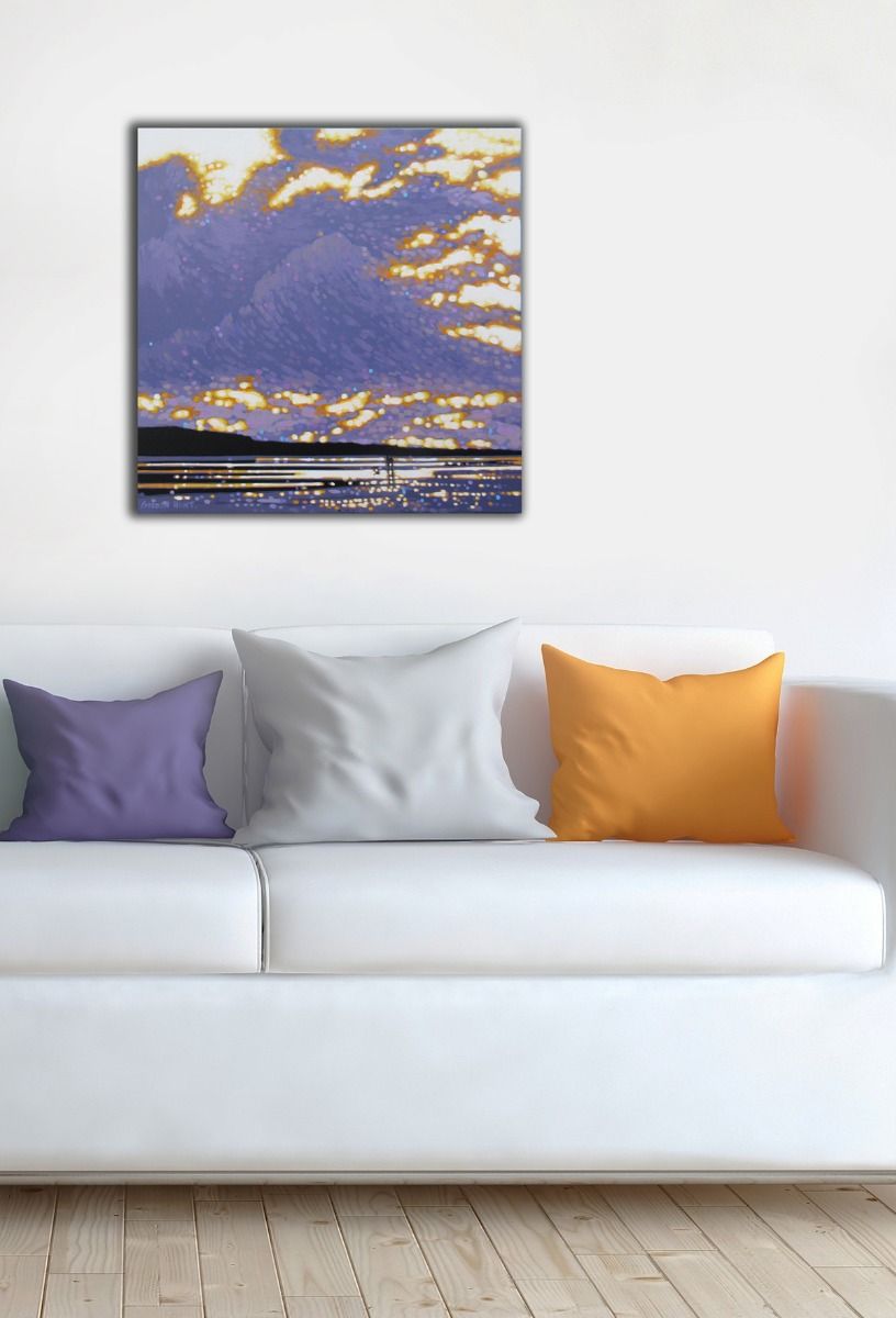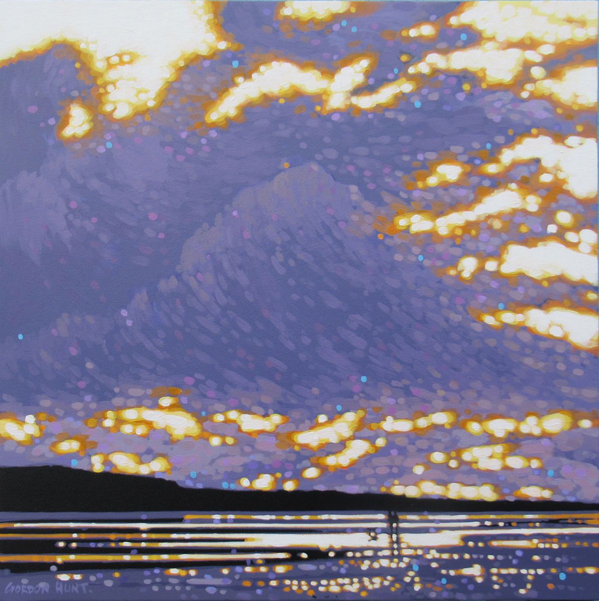 'As the sun breaks through' - is an original paintings in acrylic by Gordon Hunt. Painted on deep edge canvas, ready to hang for a popular, clean, contemporary look. A couple walk on the beach. It's an autumn evening, late afternoon. Waves of clouds sweep across the beach as the