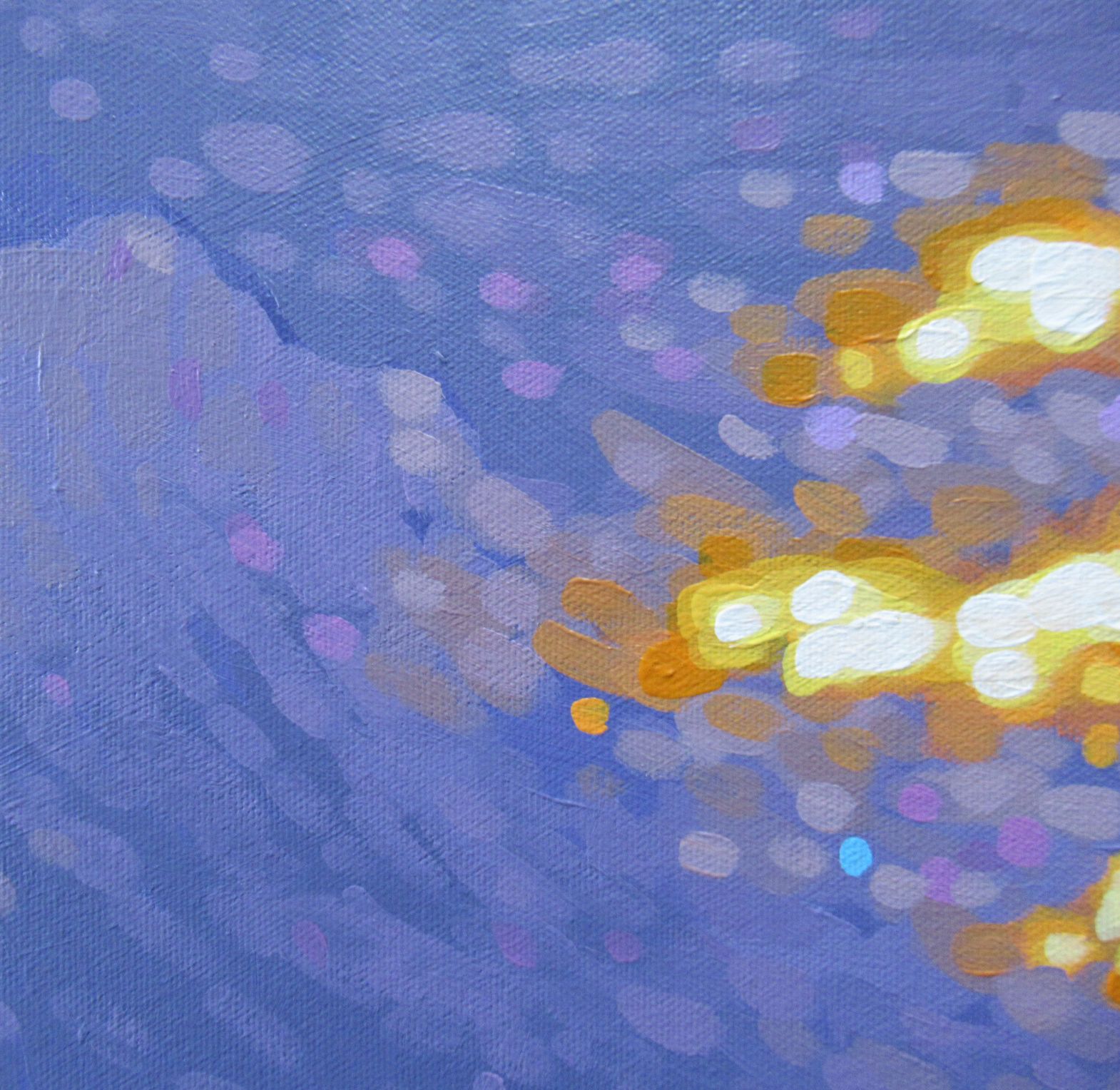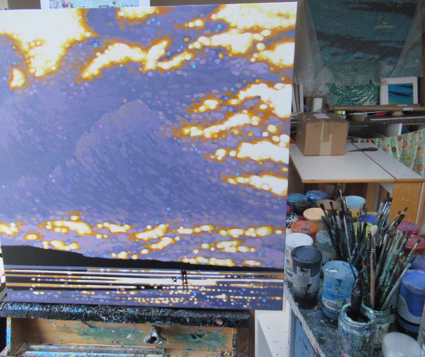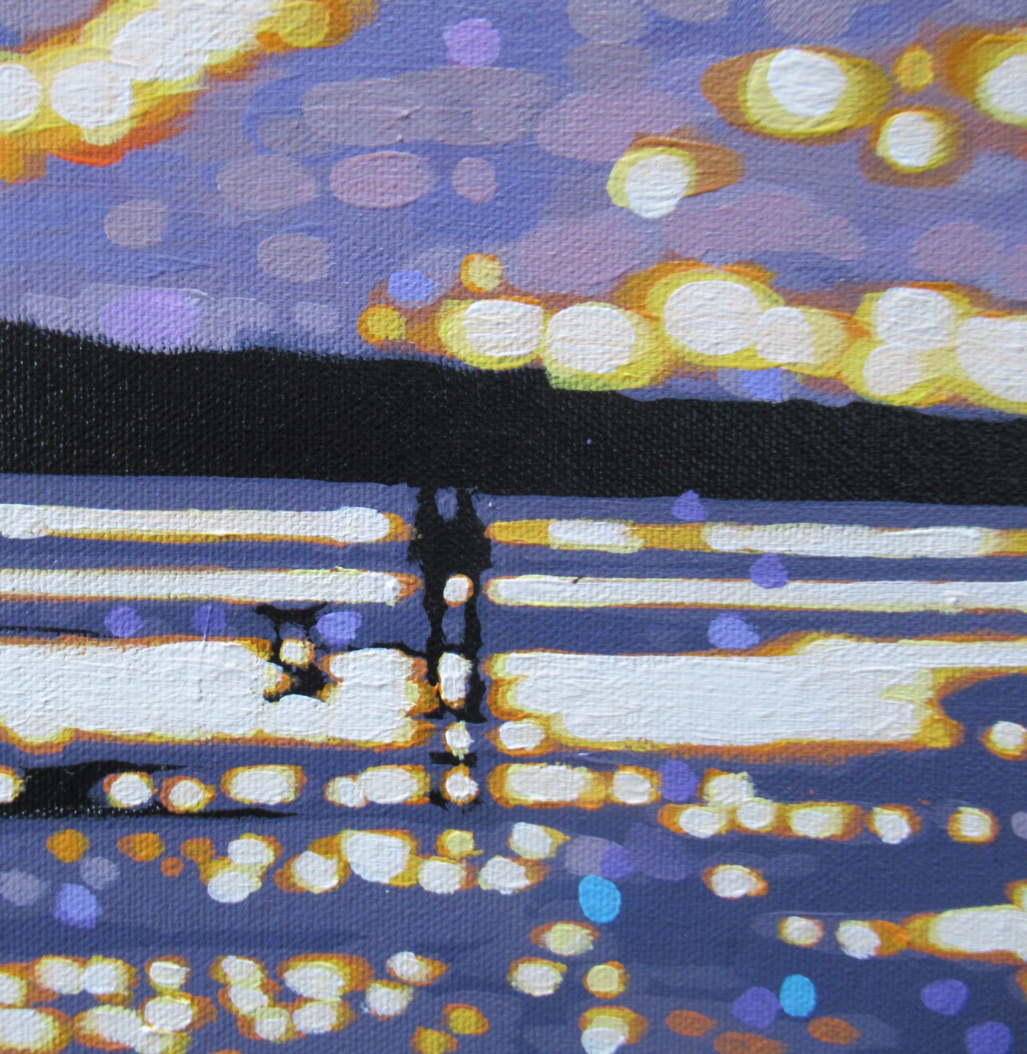 'As the sun breaks through' - is an original paintings in acrylic by Gordon Hunt. Painted on deep edge canvas, ready to hang for a popular, clean, contemporary look. A couple walk on the beach. It's an autumn evening, late afternoon. Waves of clouds sweep across the beach as the
