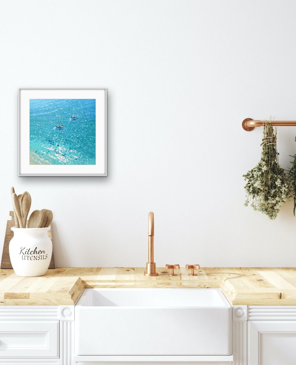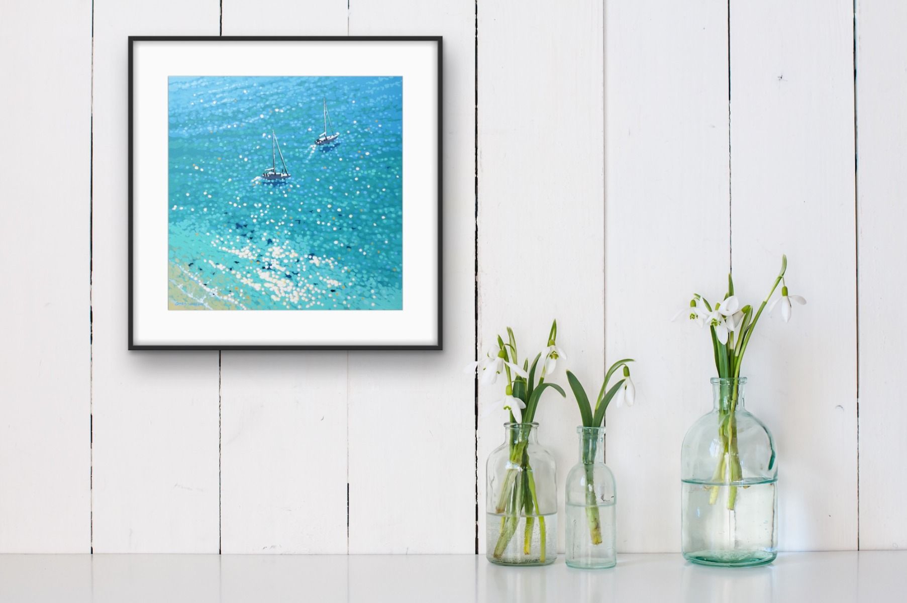 Lantic Lunch is a limited edition sailing print by Gordon Hunt. The impressionist style and bright turquoise waters of Fowey, Cornwall make for a delightful piece. Clear sparkling turquoise waters, golden sand, seascape and sunshine. ADDITIONAL INFORMATION Gordon Hunt Lantic Lunch Giclée Print on Paper Edition of 120 40 H x 40 W x 0.1
