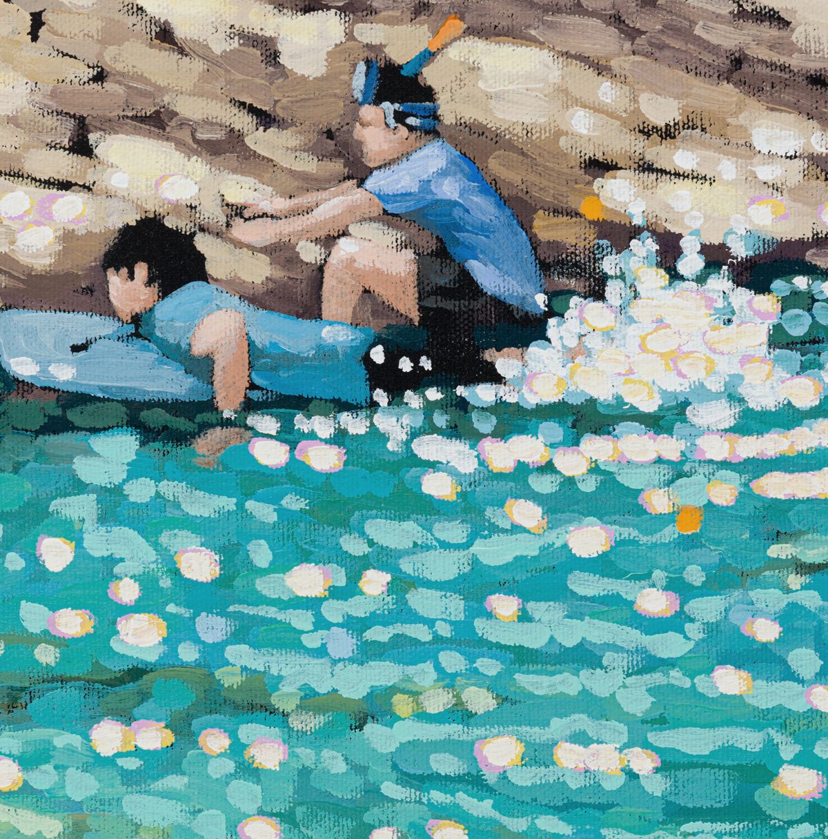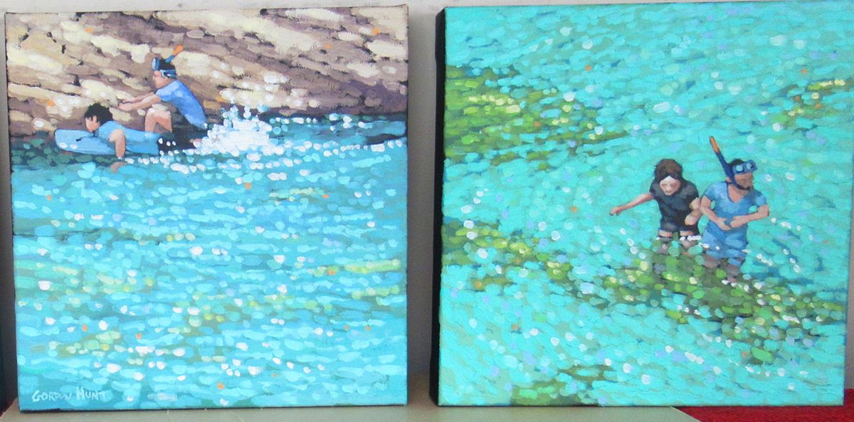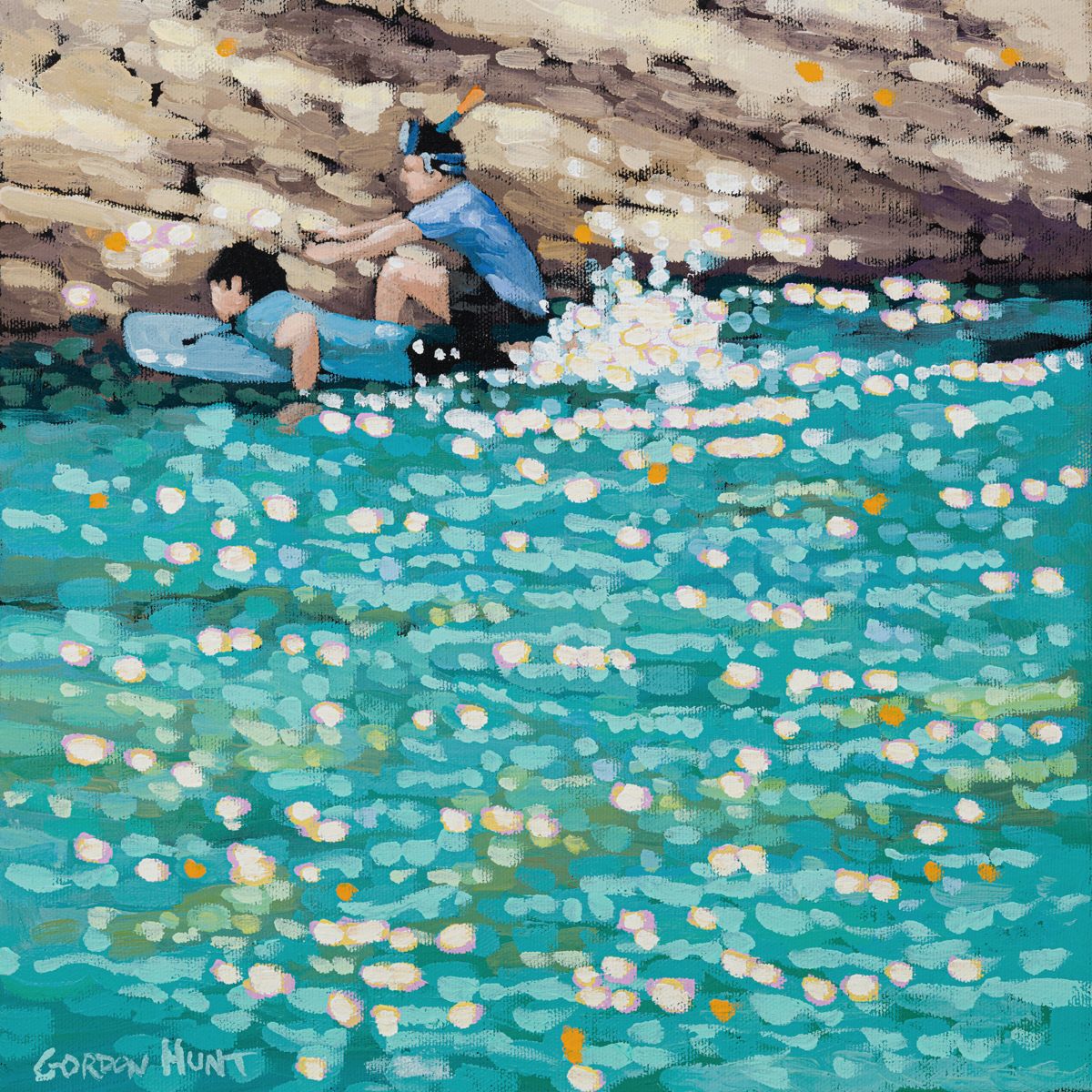 'Onto the rocks' is an original seascape painting by Gordon Hunt. Two children enjoying their holiday are climbing onto the rocks. They are having a great time playing in the clear sparkling waters on a Cornish beach. Gordon Hunt paints beautiful, colourful and relaxing paintings. Gordon works from his home