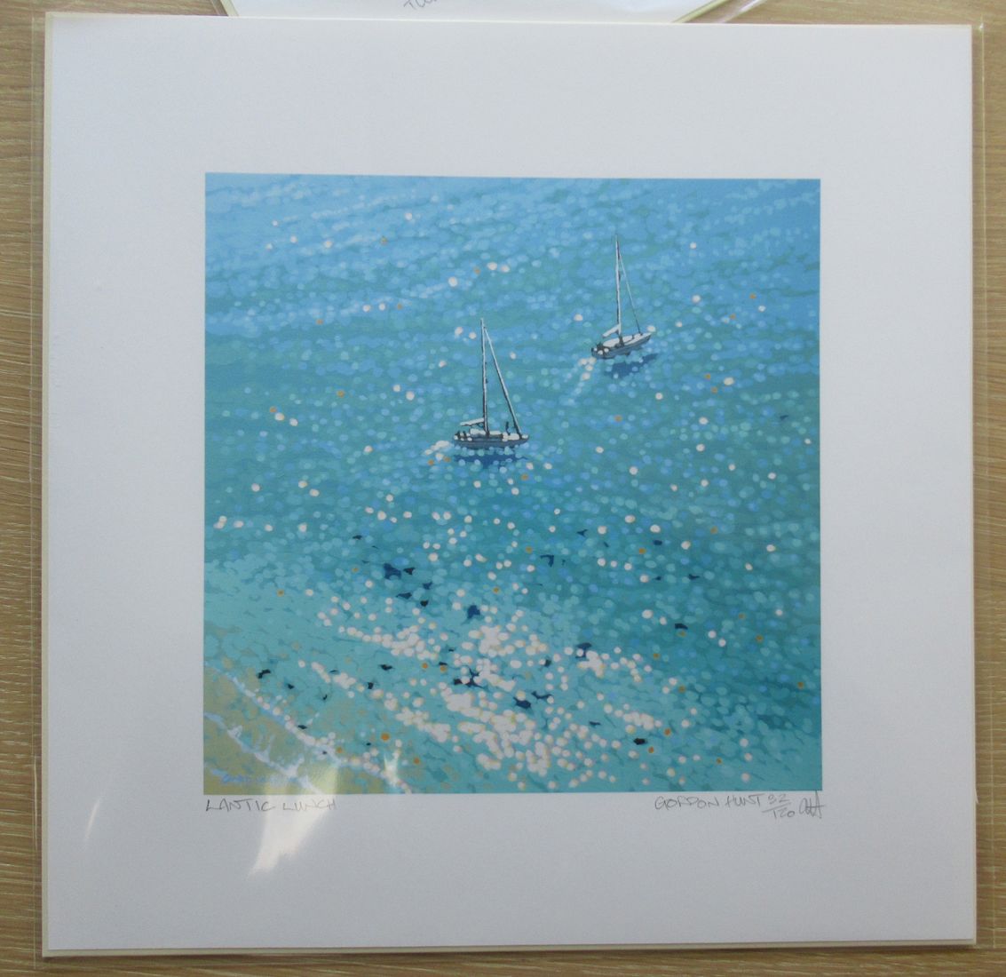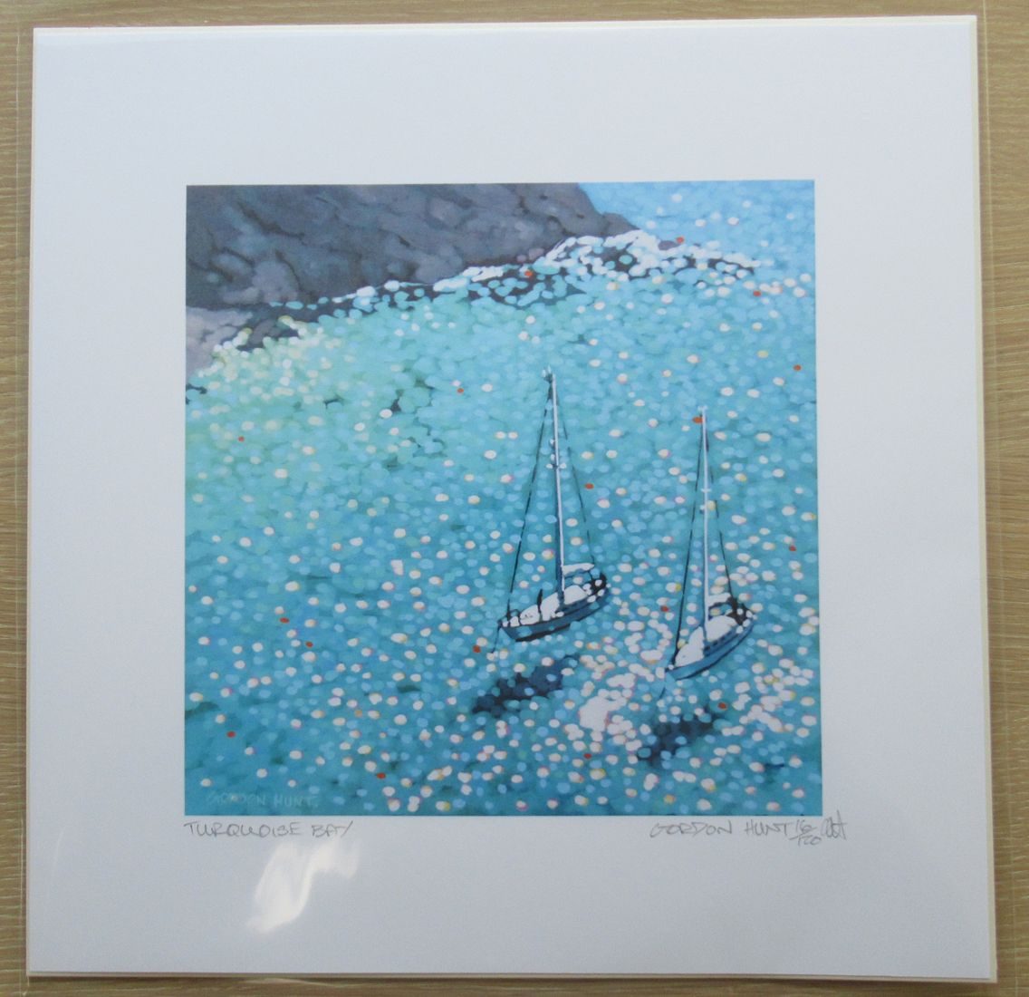 Gordon Hunt Turquoise bay Limited Edition print Giclee Print Limited edition of 120 Images Size: H 20cm x W 20cm Sheet Size: H30cm x W 30cm x D 0.1cm Other sizes available from the same limited edition of prints Sold Unframed Turquoise Bay is a limited edition sailing print by Gordon Hunt. The impressionist style and bright turquoise