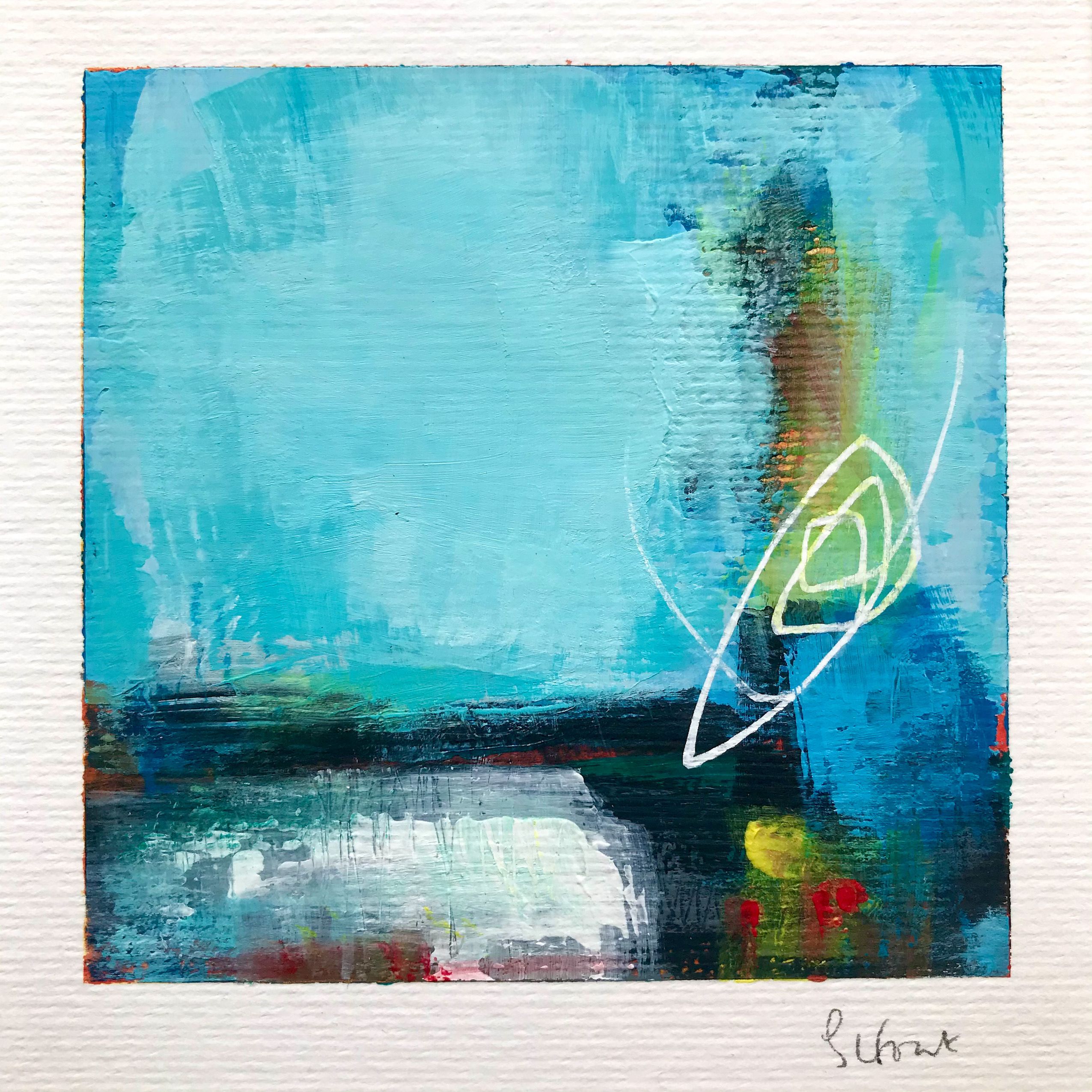 An original abstract painting by Sarah Foat. The painting is a 10x10cm square featuring a variety of mark-making techniques in contrasting colours inspired by graffiti. The layering of acrylic shapes and forms reveal intricate levels of detail. Fascinated by the interaction of paint layers over time, Sarah uses colourful gestures