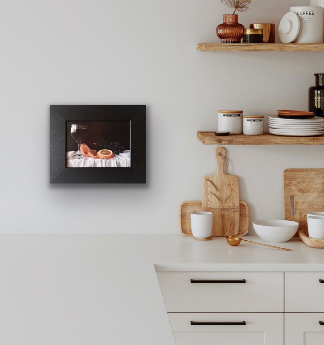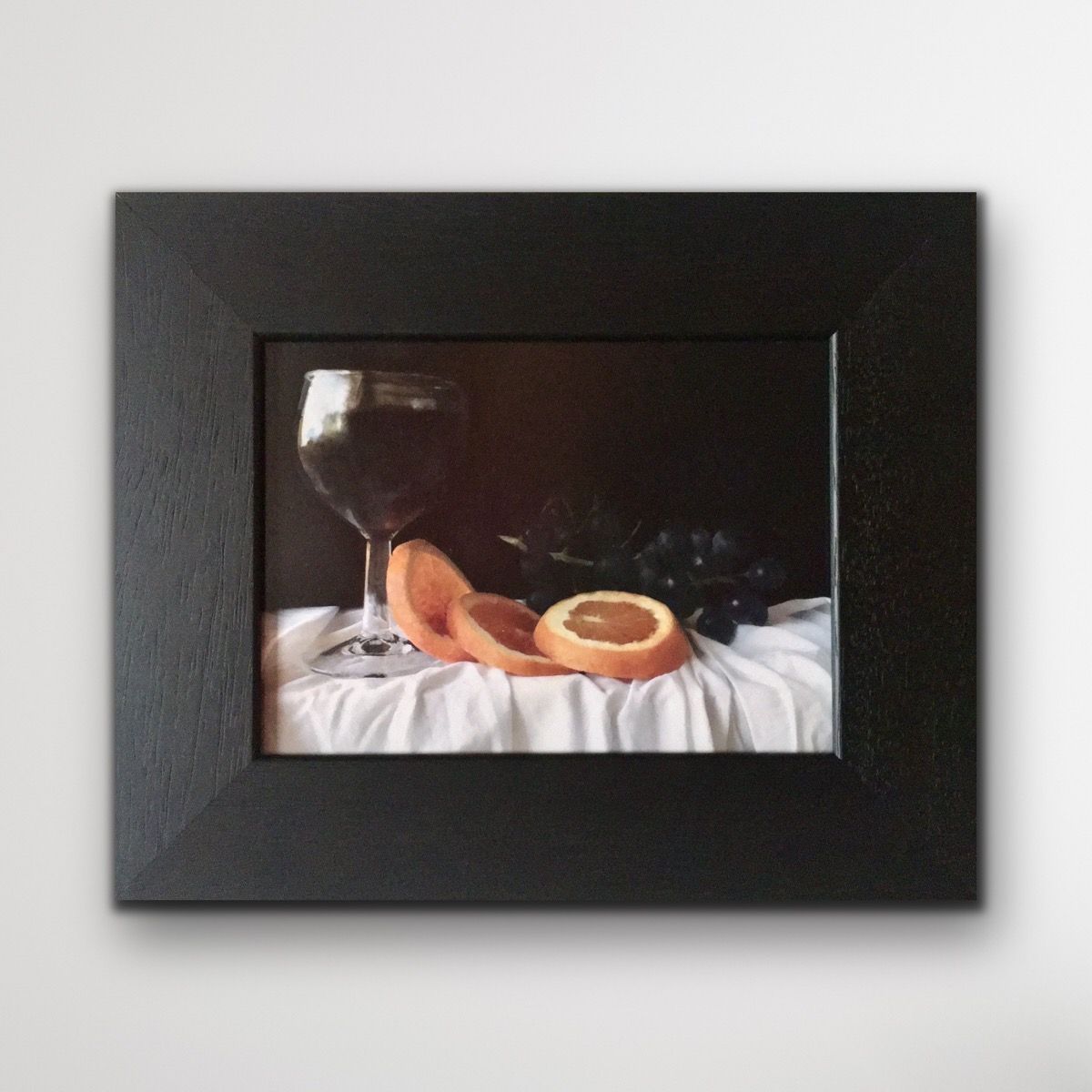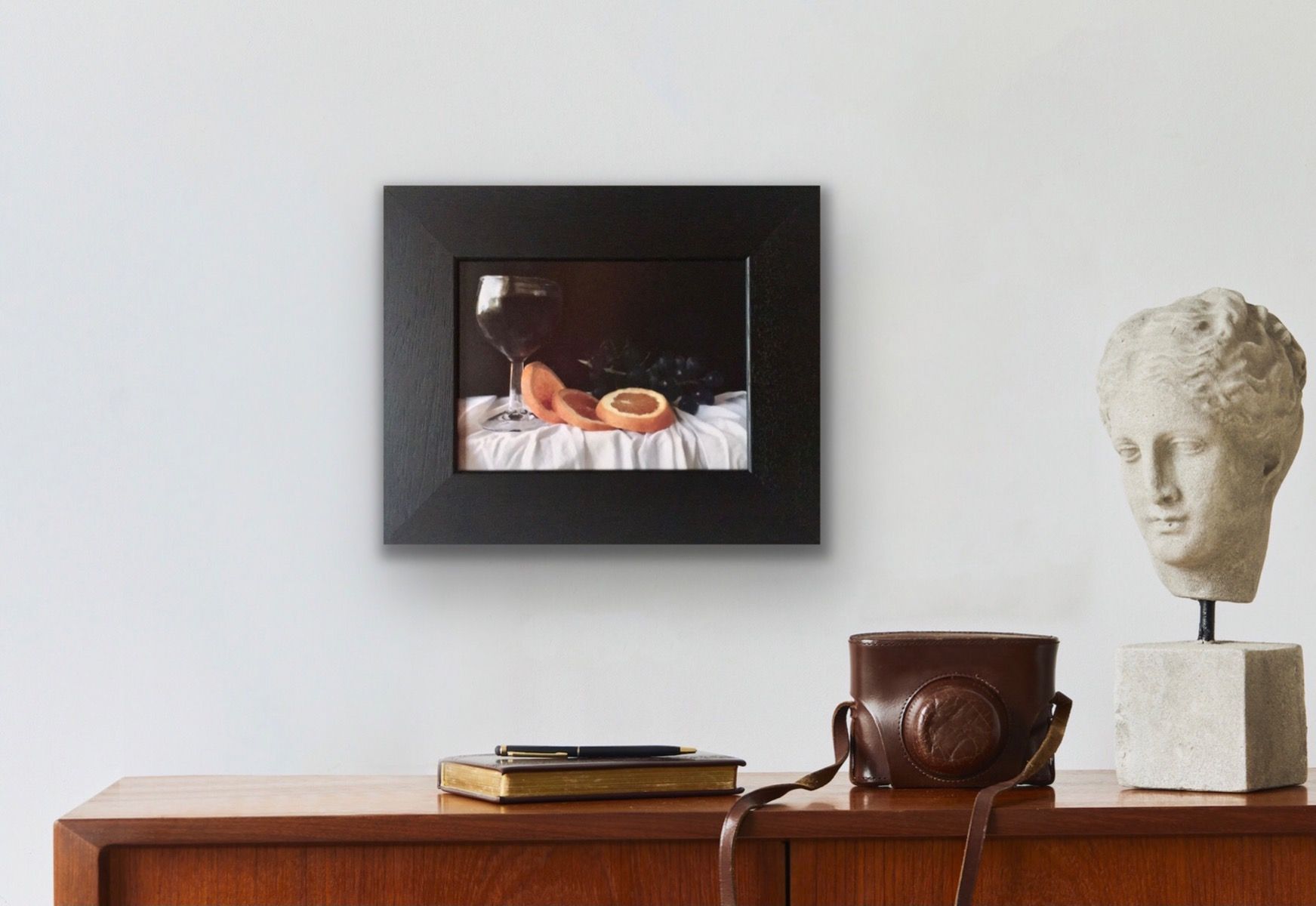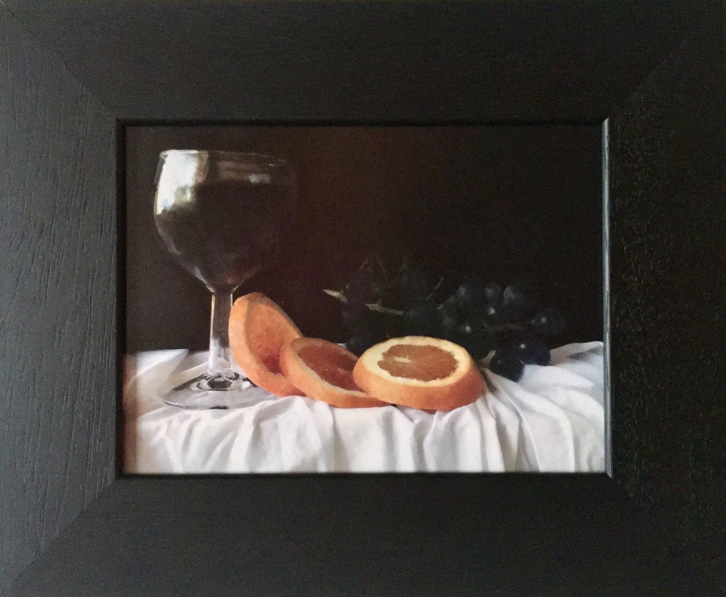 Grapes, wine with blood orange and white bowl is an original oil painting by Kate Verrion. Kate’s photographic style gives her work an intricacy rarely found. ADDITIONAL INFORMATION:Grapes, wine with blood orange and white bowl by Kate Verrion [2024]Original paintingOil Paint on paper on boardComplete size of framed work: 23.5 H