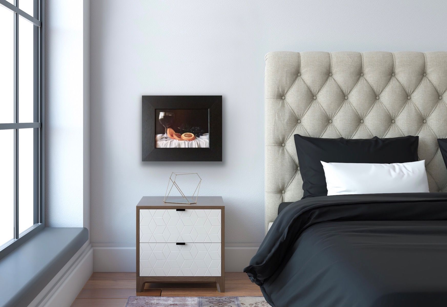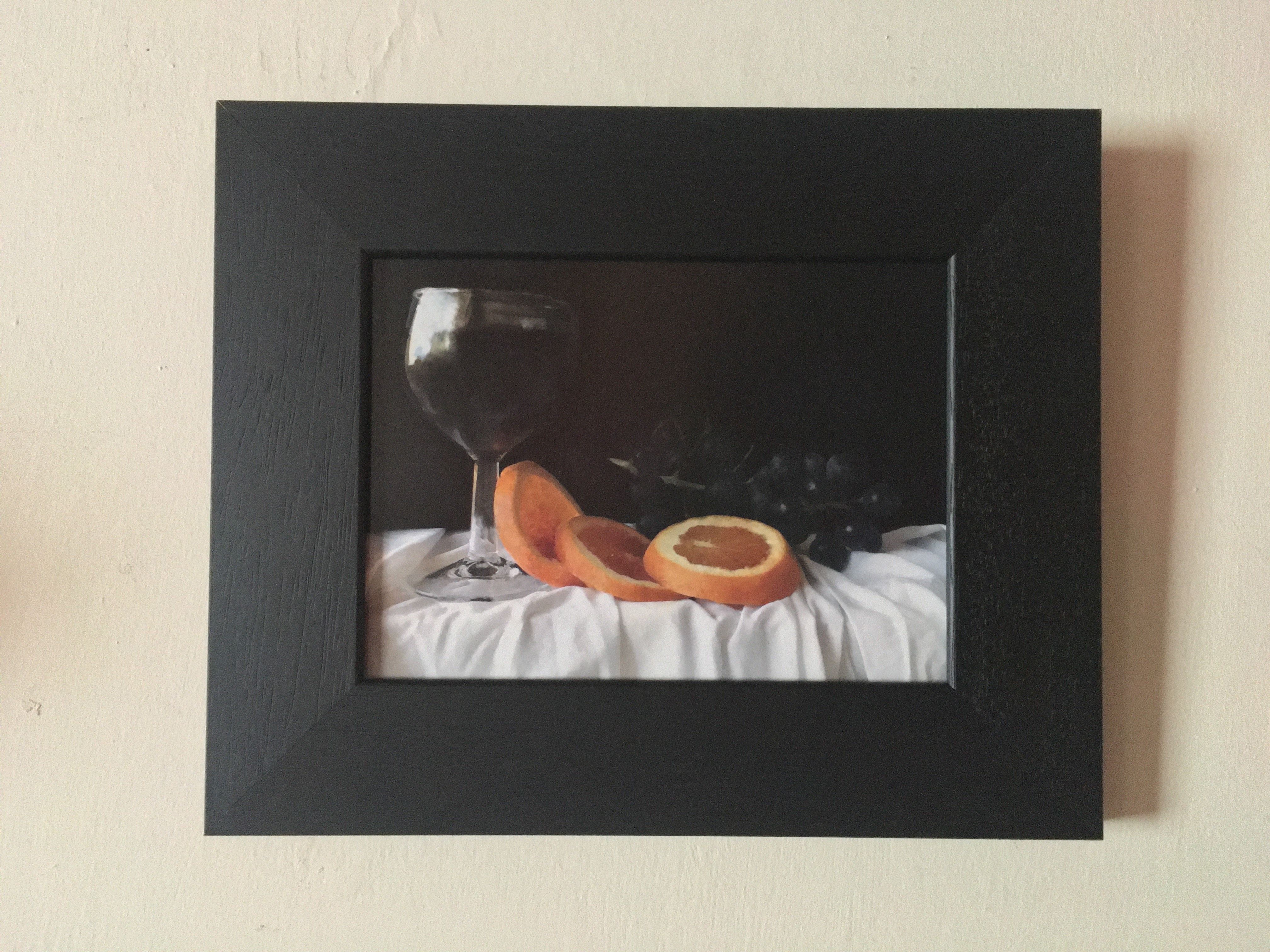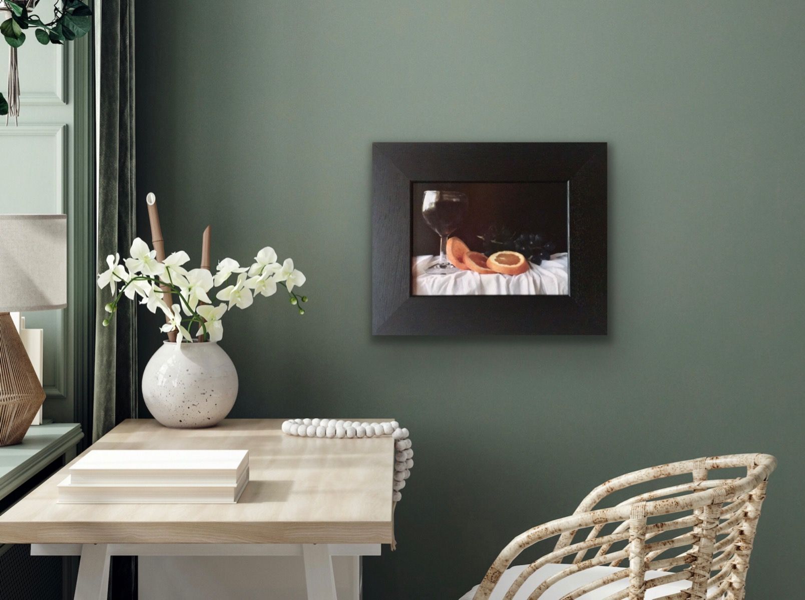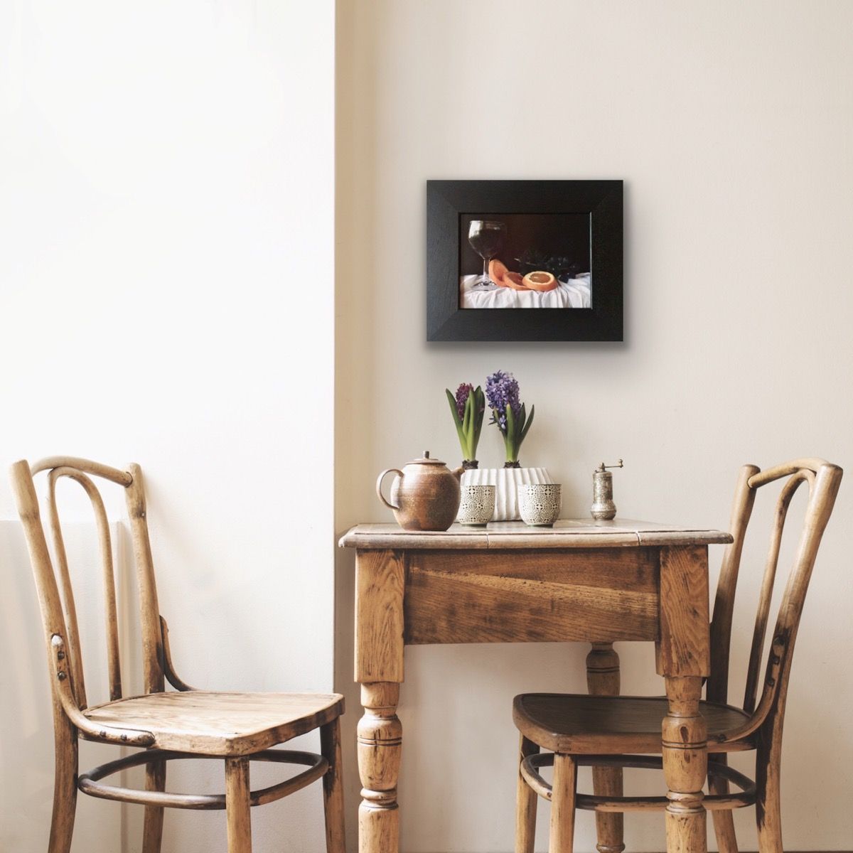 Grapes, wine with blood orange and white bowl is an original oil painting by Kate Verrion. Kate’s photographic style gives her work an intricacy rarely found. ADDITIONAL INFORMATION:Grapes, wine with blood orange and white bowl by Kate Verrion [2024]Original paintingOil Paint on paper on boardComplete size of framed work: 23.5 H