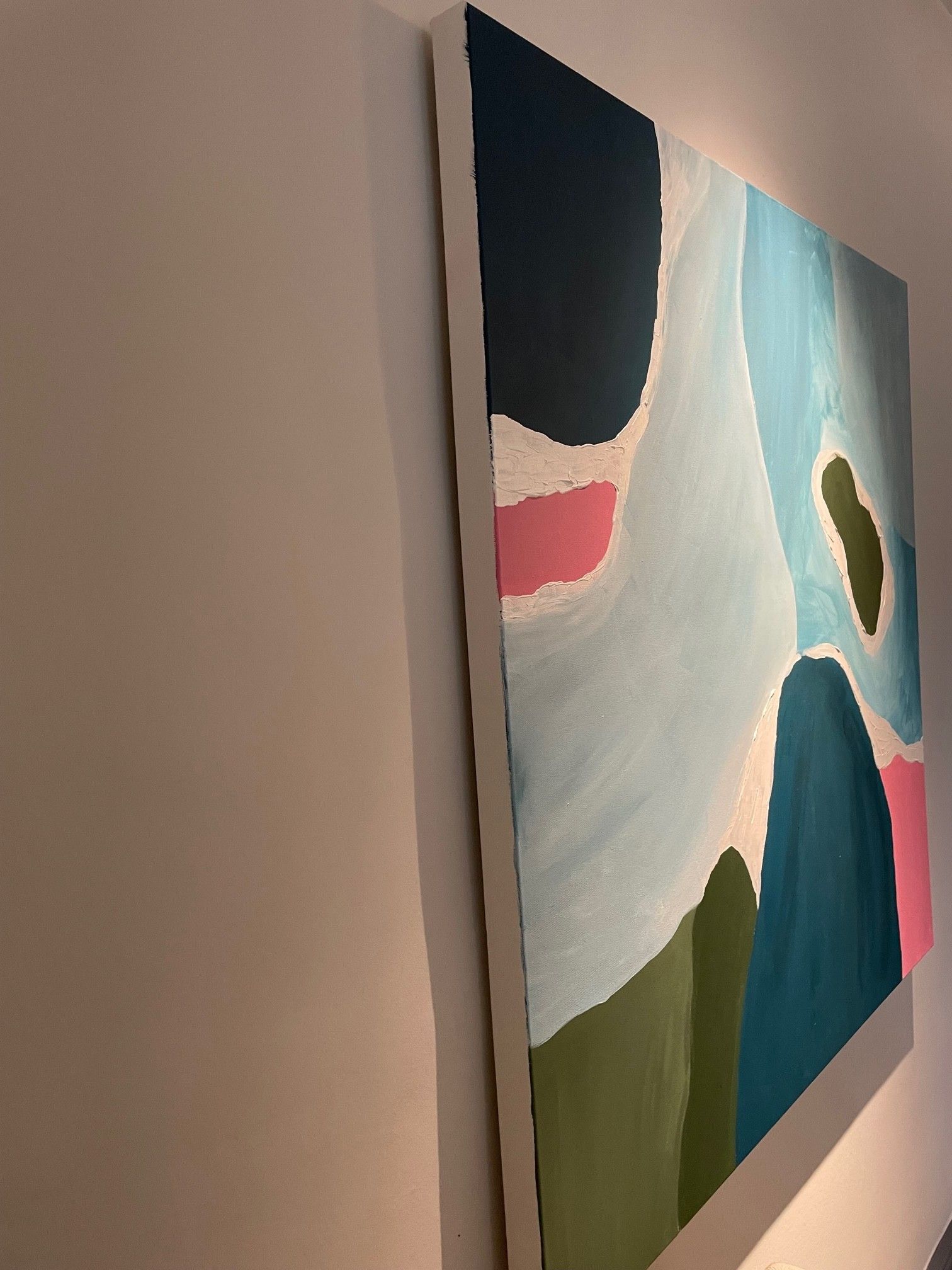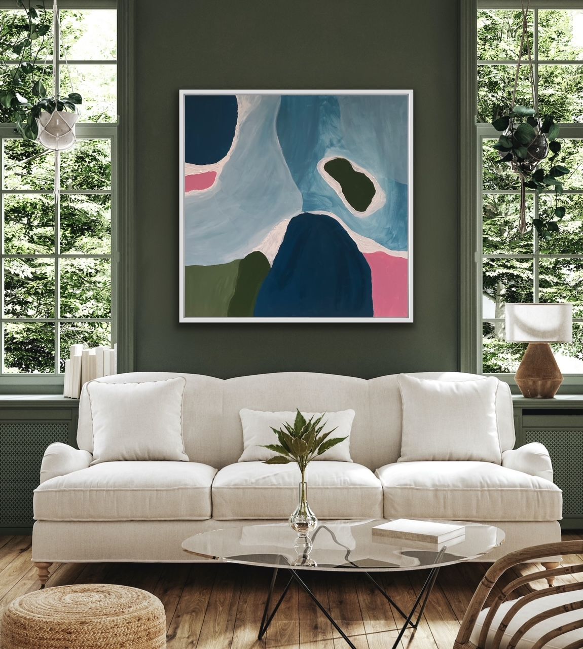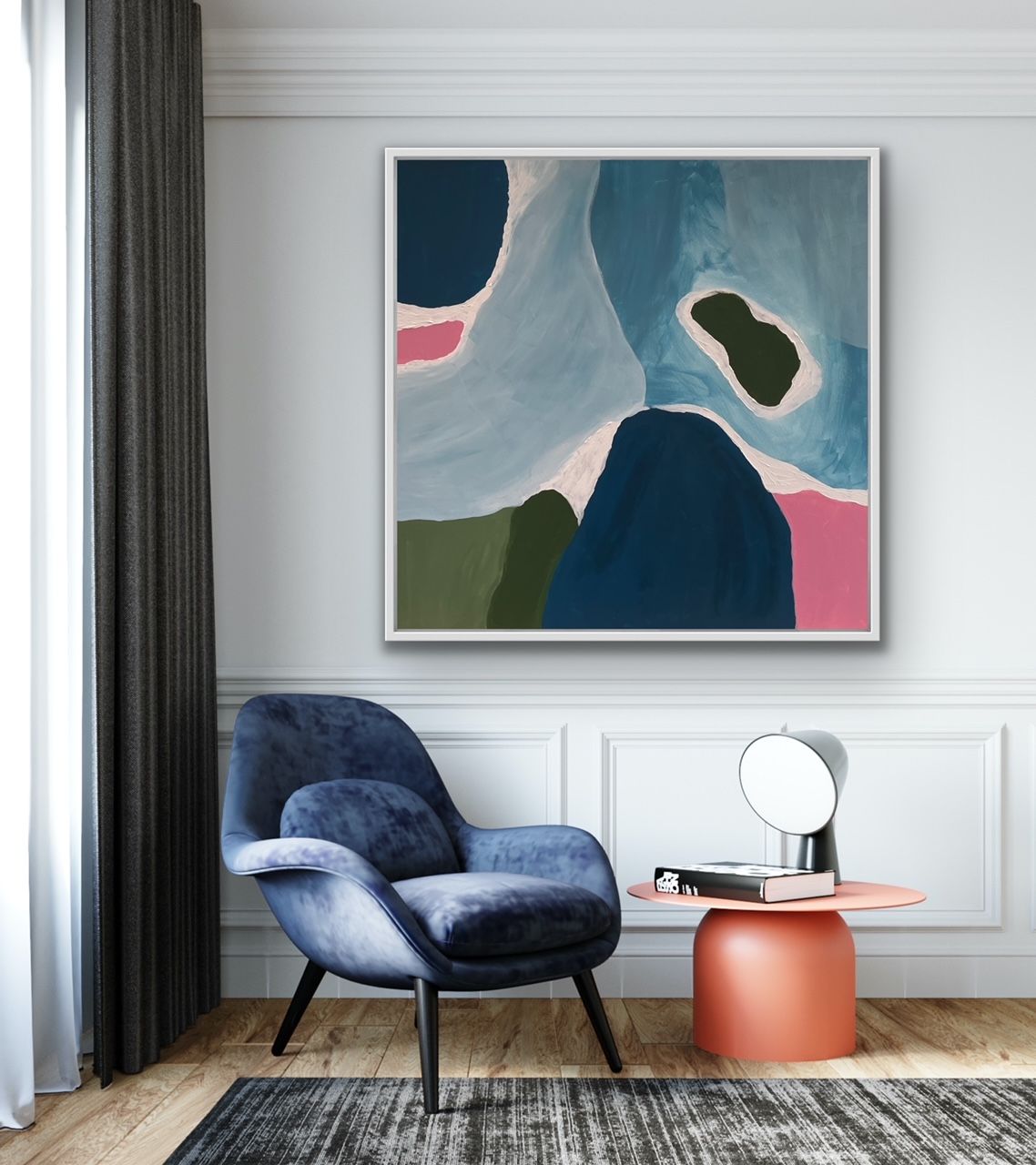 Original contemporary abstract painting by Fleur Park. Green, Pink and Blue Formation features her signature monochromatic palette, exploring the relationship between spaces, form and colour in a geometric abstract way. In this piece the black circular formations appear to be moving through the square picture plane and present the sense