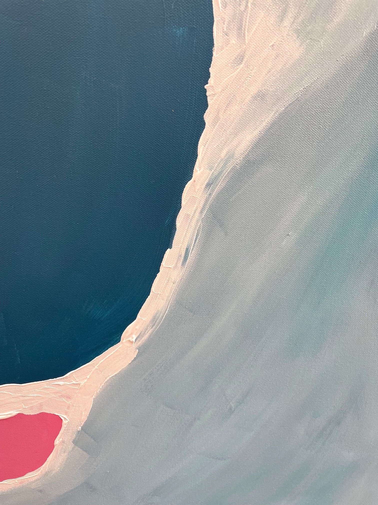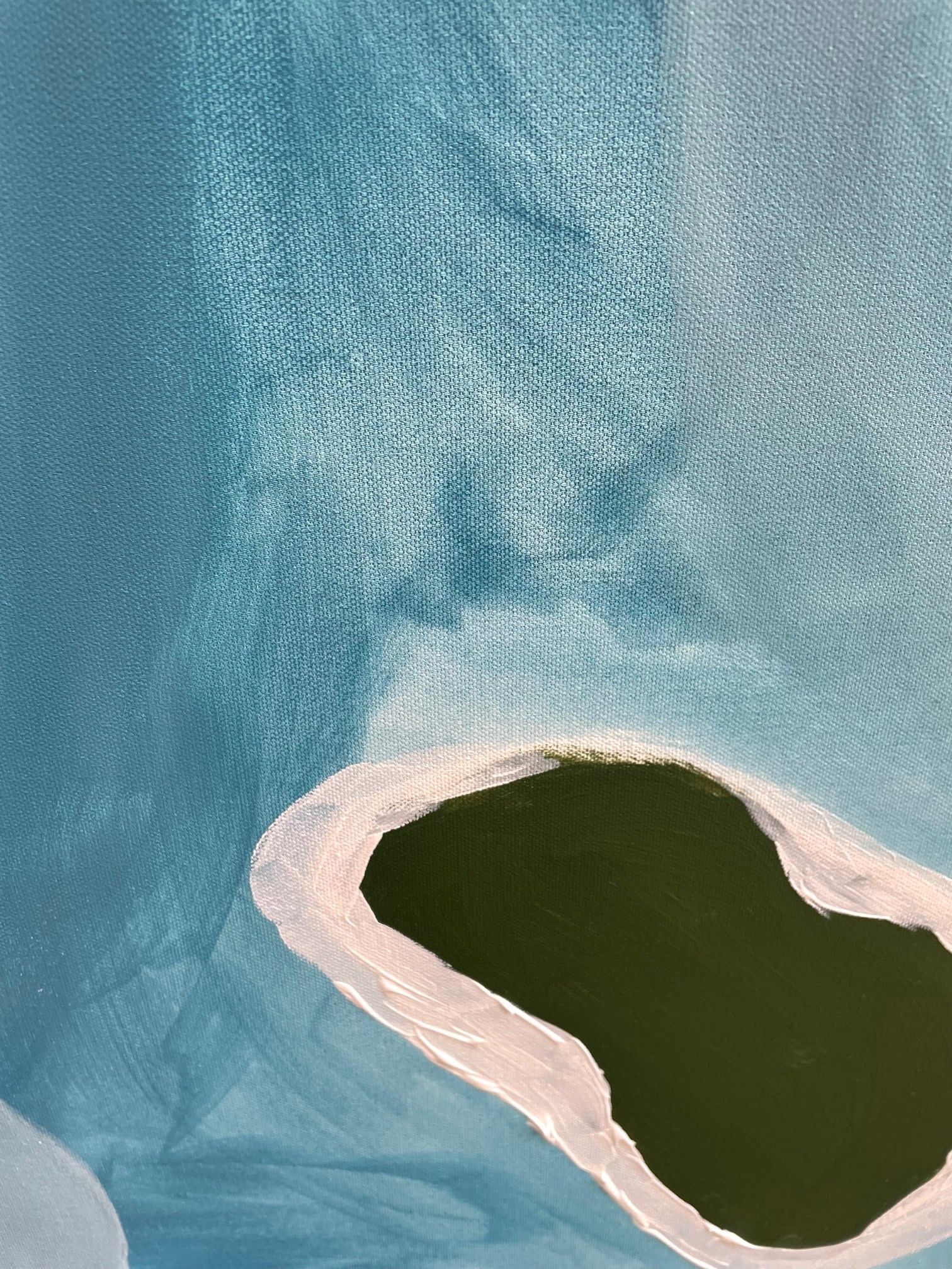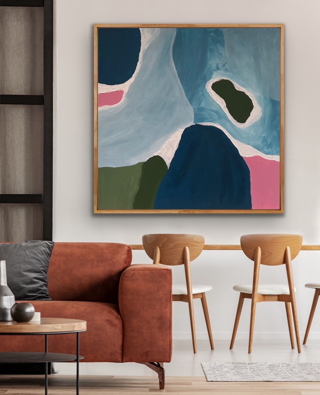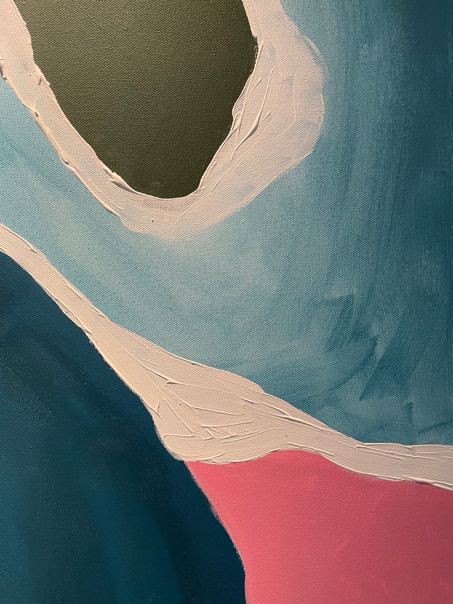 Original contemporary abstract painting by Fleur Park. Green, Pink and Blue Formation features her signature monochromatic palette, exploring the relationship between spaces, form and colour in a geometric abstract way. In this piece the black circular formations appear to be moving through the square picture plane and present the sense