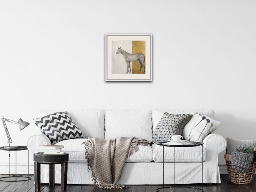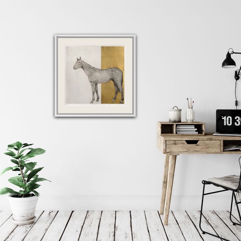 Guy Allen Equine Gold Etching, Aquatint and Hand Finished Gold Leaf Edition Size: 75 Year Completed: 2019 Image Size: H 60cm x W 60cm Sold Unframed (Please note that in situ images are purely an indication of how a piece may look) Equine Gold is an original etching, engraved onto a copper plate, from which Guy Allen creates an