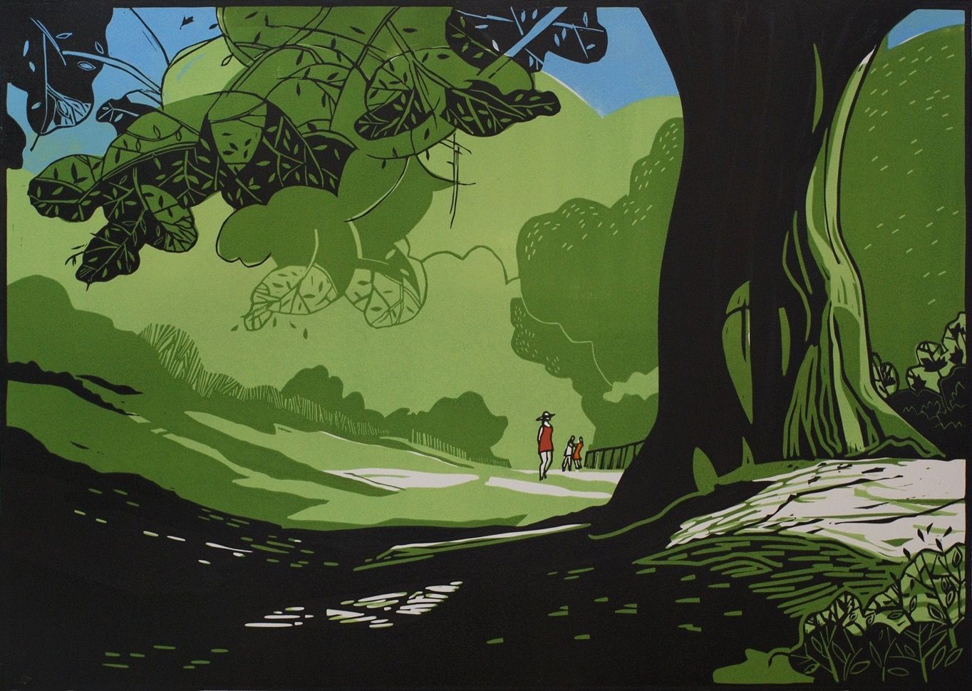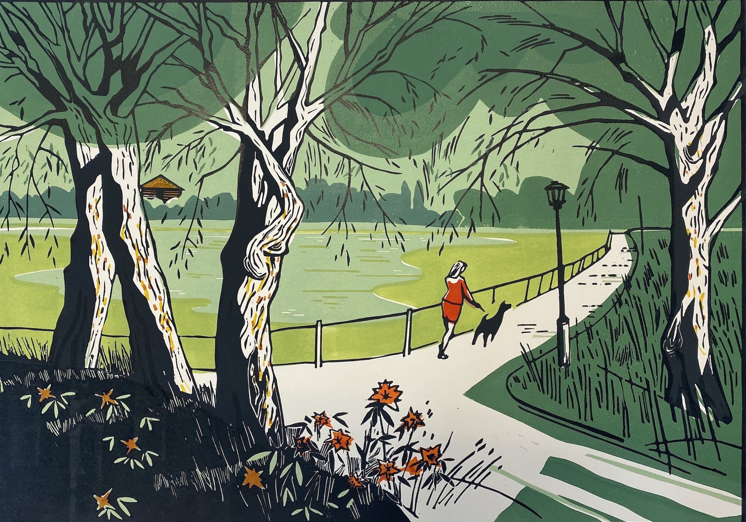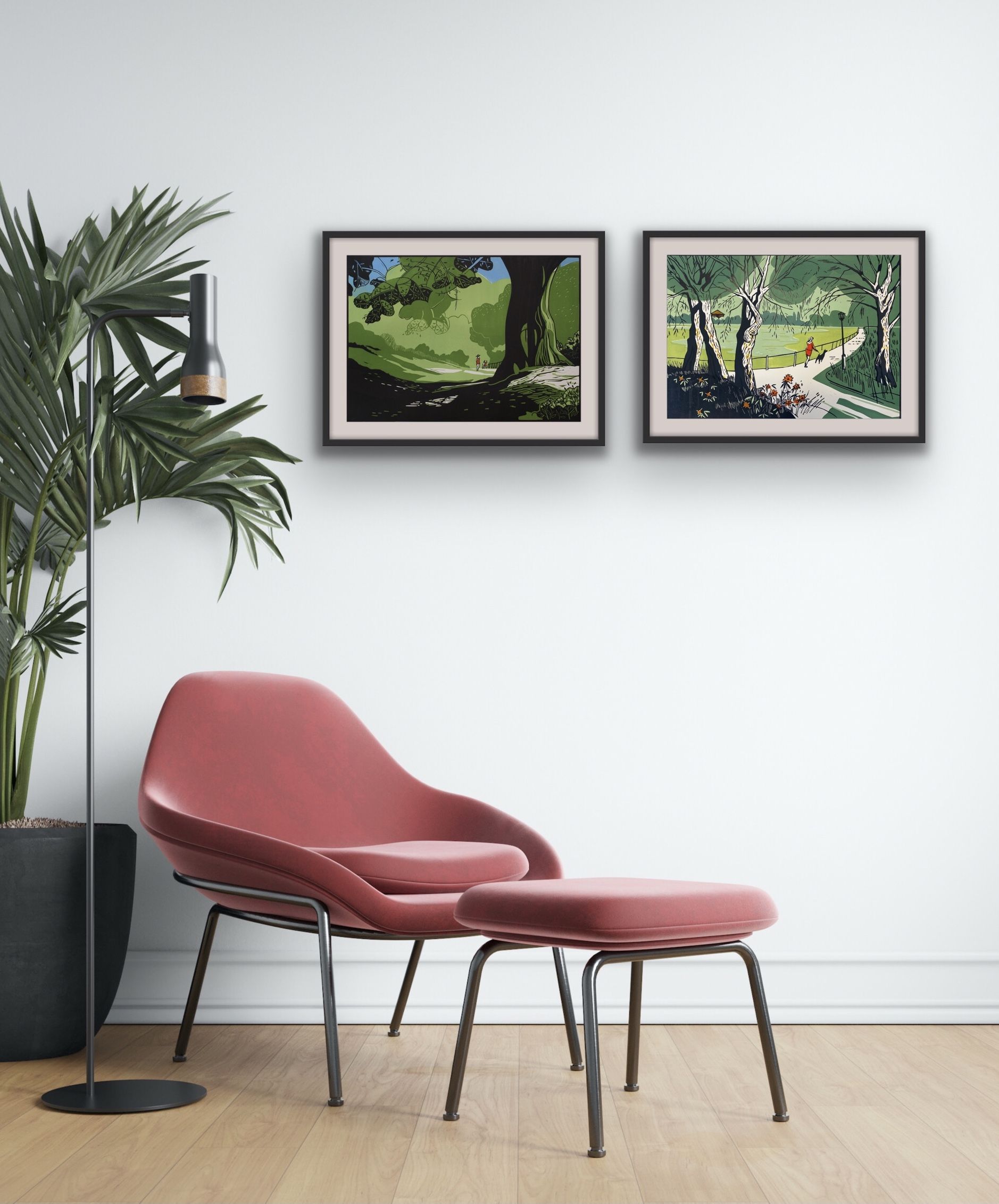 Hampstead Heath Summer and Hampstead Pond Diptych Overall size cm : H102 x W134 Colin Moore Hampstead Heath Summer Limited Edition Linocut Print Edition 100 Sheet Size: H 51cm x W 67cm x D 0.1cm Sold Unframed Hampstead Heath in Summer is a limited edition print on London by Colin Moore. The vibrant green scene is broken up