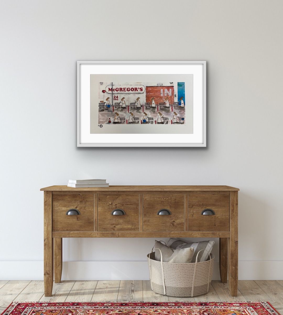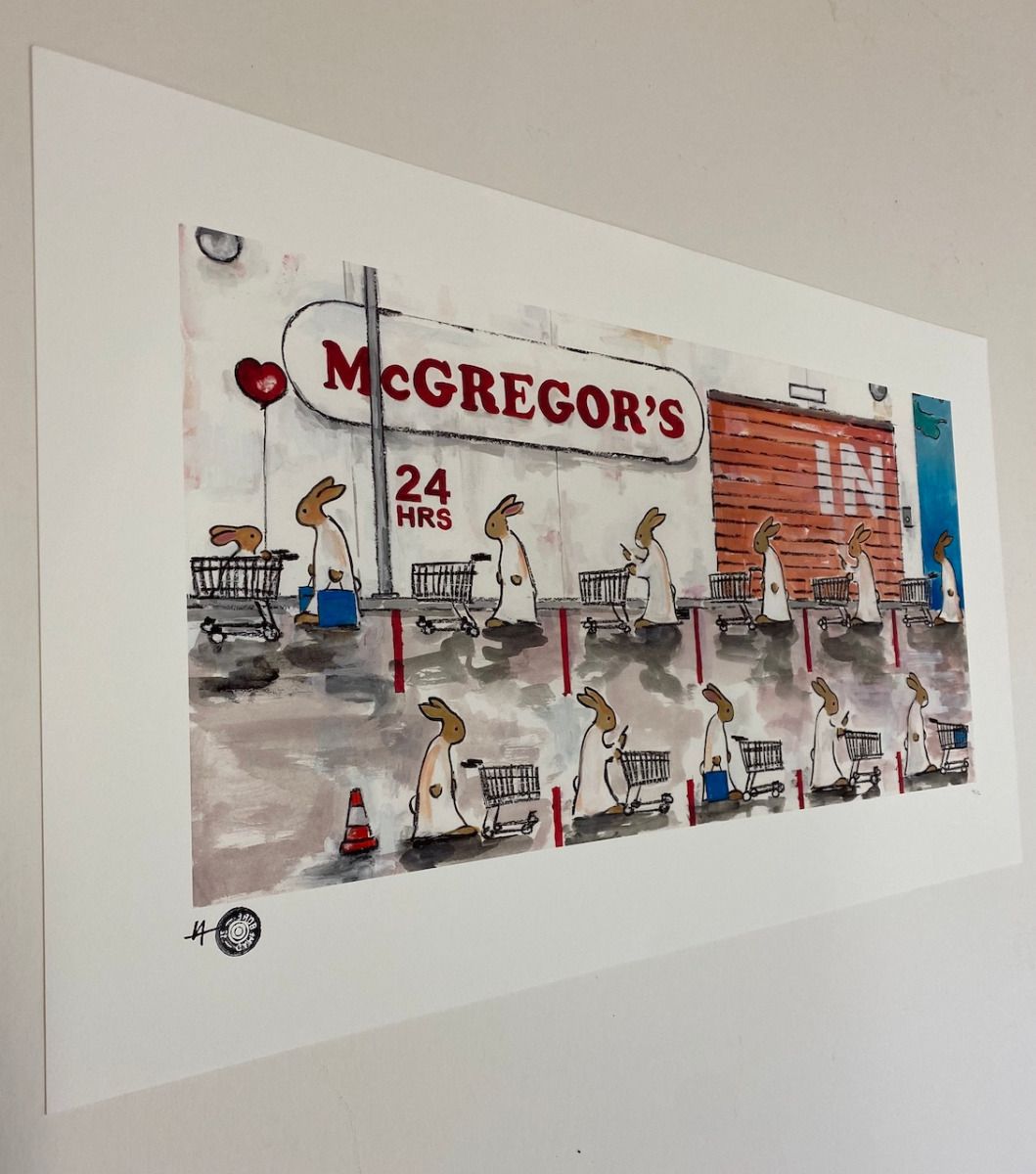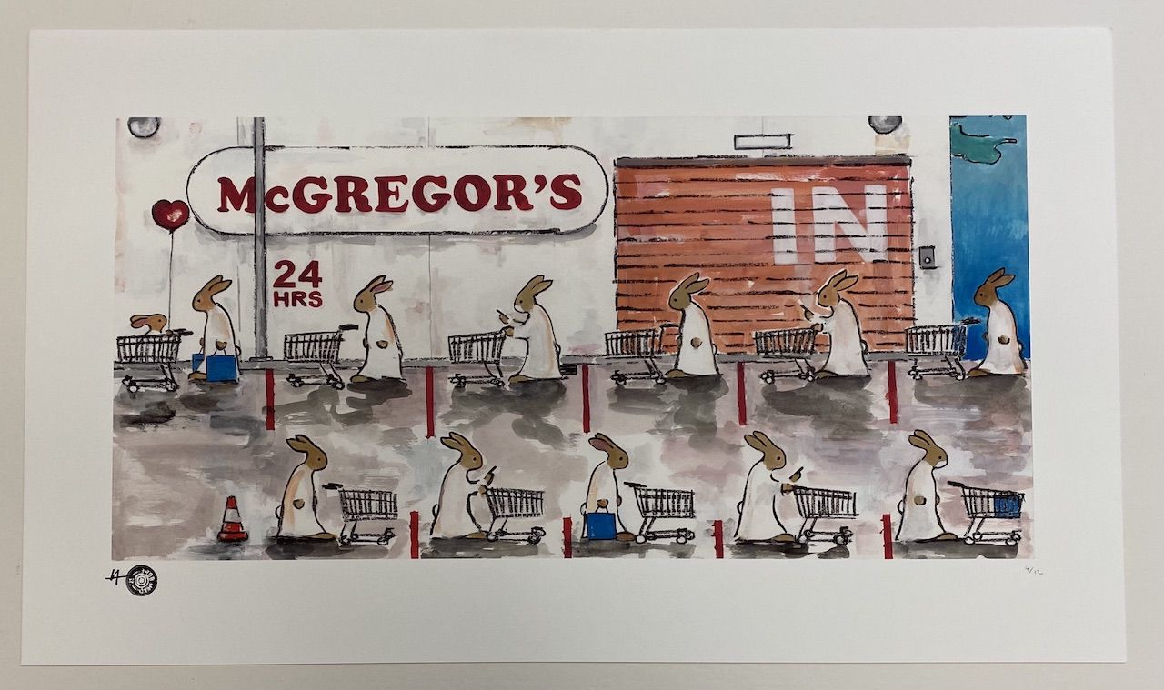 Big Day Out is a limited edition print by Harry Box. This work depicts a satirical scene of rabbits queuing and waiting to get into the supermarket. Please note that the complete size of unframed work is the sheet size of the paper.