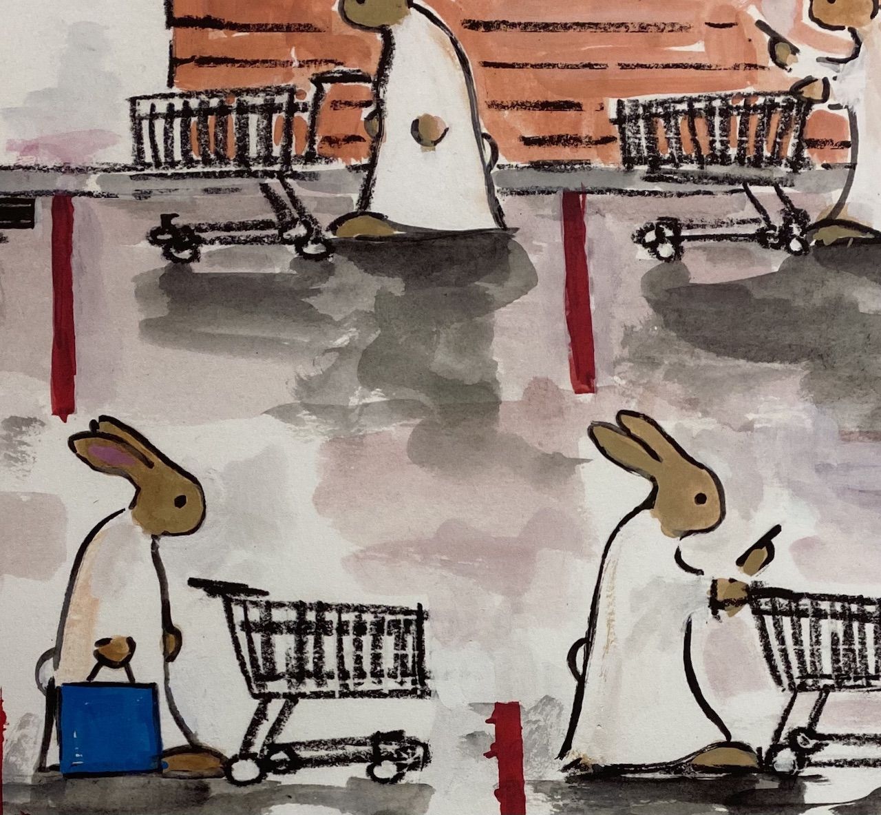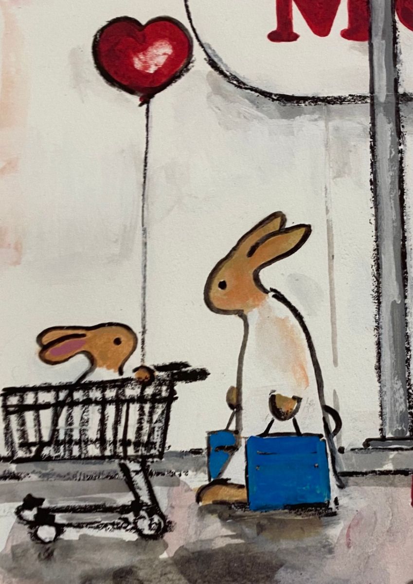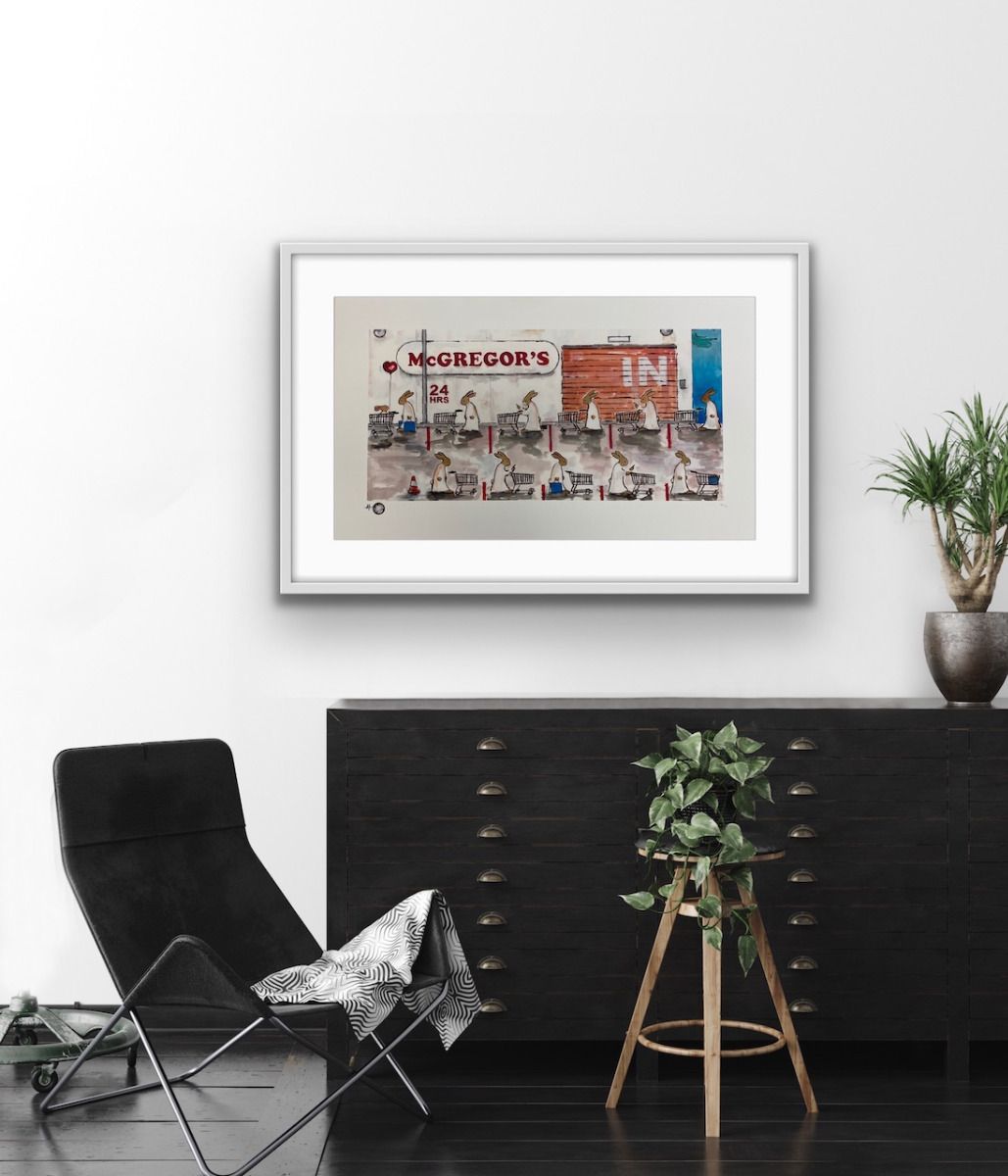 Big Day Out is a limited edition print by Harry Box. This work depicts a satirical scene of rabbits queuing and waiting to get into the supermarket. Please note that the complete size of unframed work is the sheet size of the paper.