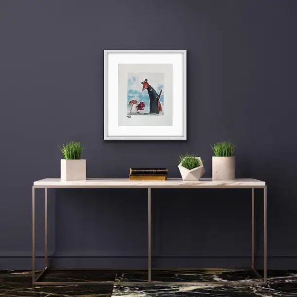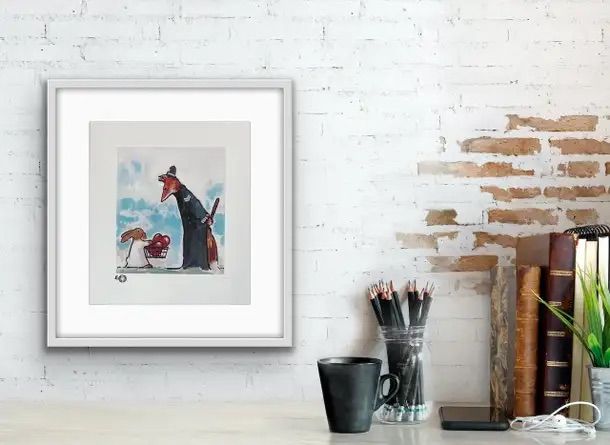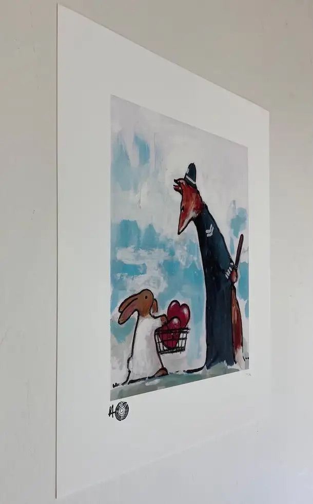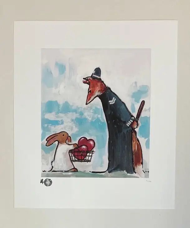 Essential Items is a limited edition print by Harry Bunce. This work in Harry's usual style uses the characters of the rabbit and fox to create a satirical scene related to the current lockdown restrictions. Please note that the complete size of unframed work is the sheet size of the