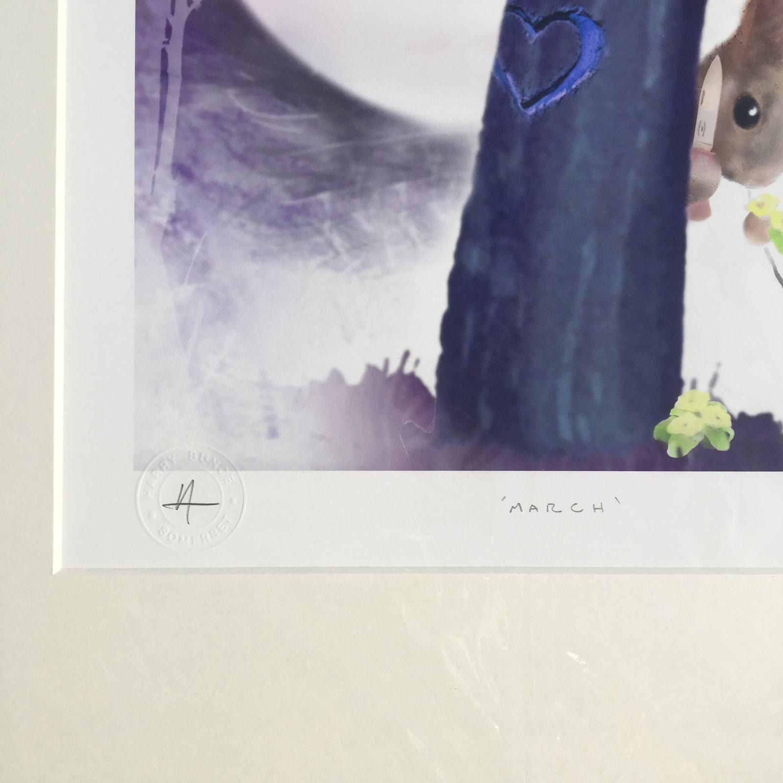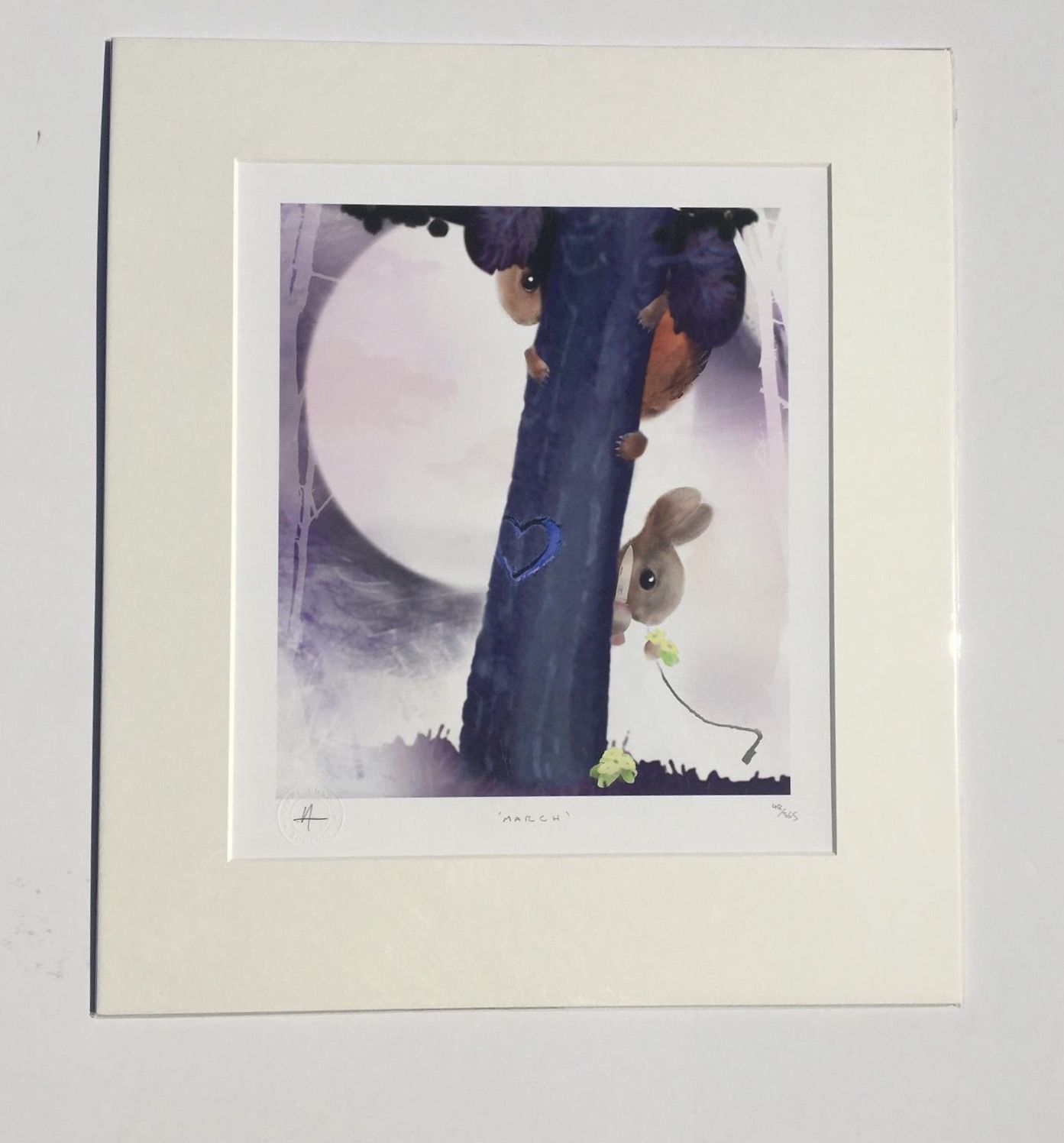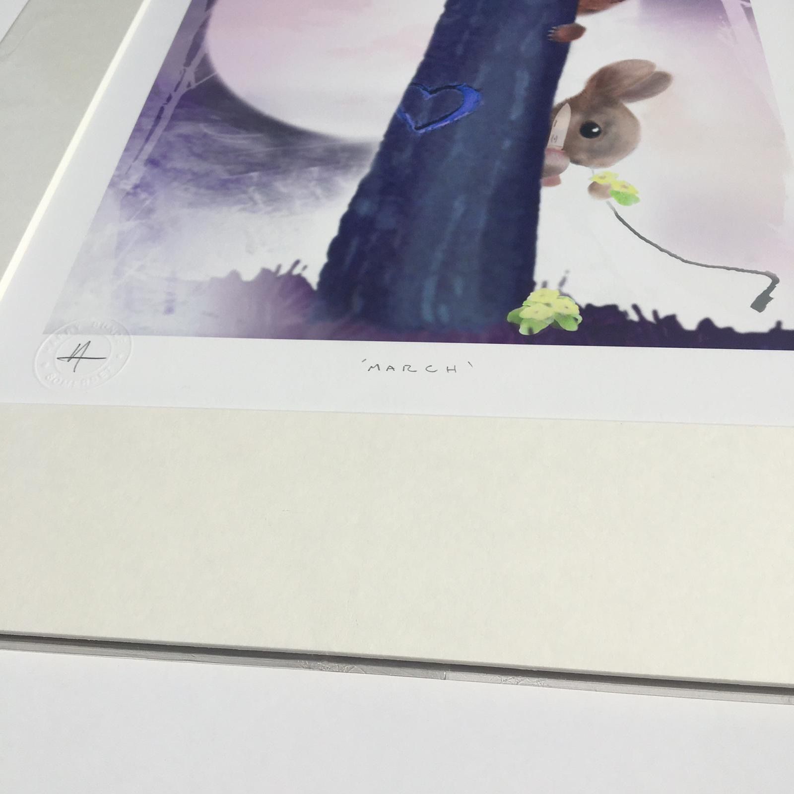 March is a limited edition silkscreen print by Harry Bunce. This work is part of The Happy Year Series, the animals brandish survival equipment, as seen here with the rabbit holding a pen knife. These details are evocative of Harry's keen interest in animal conservation - a theme that runs