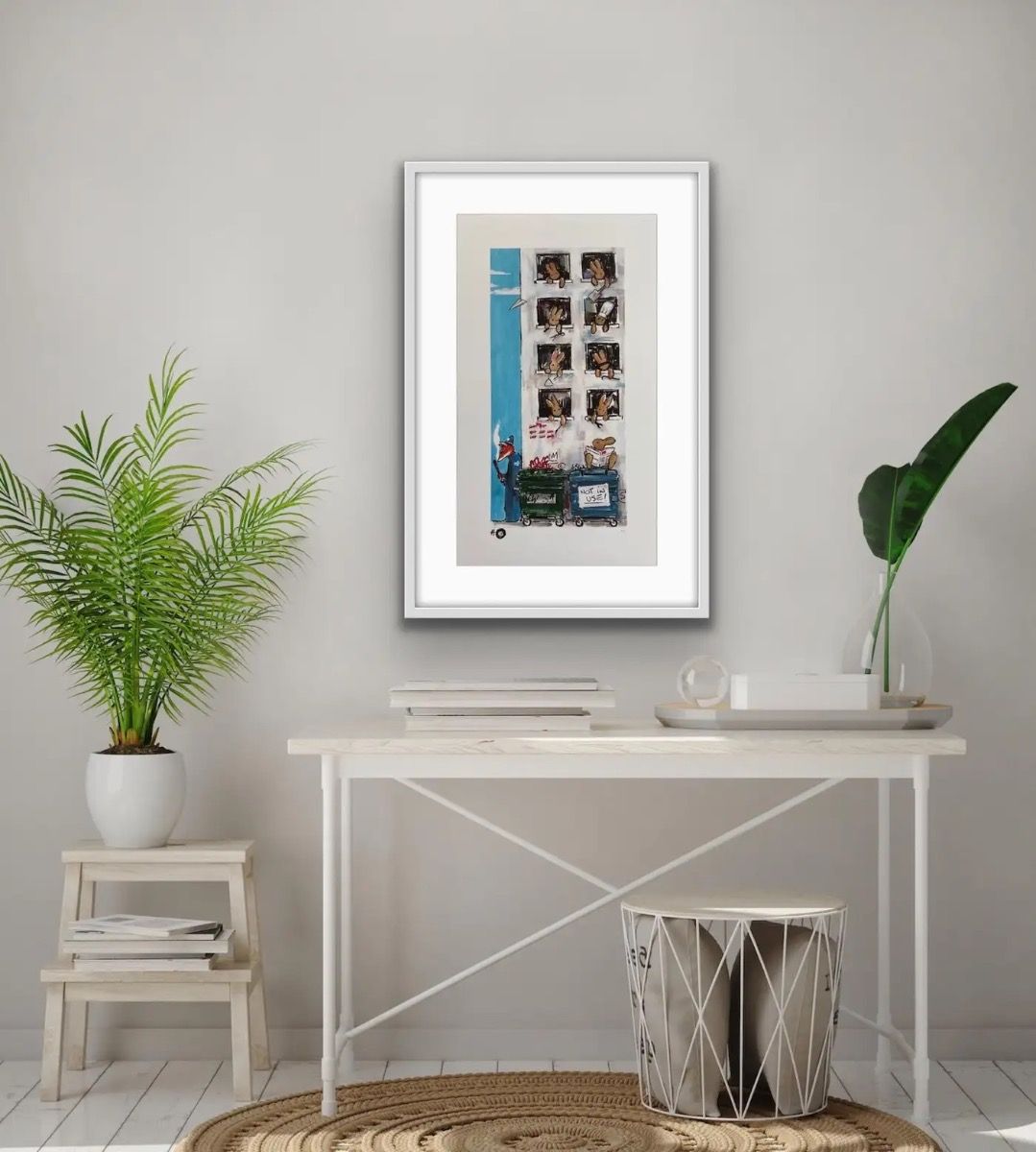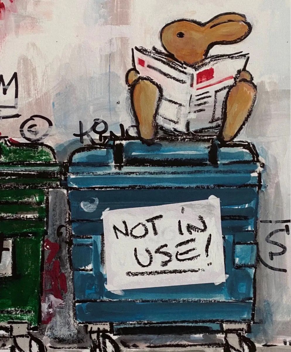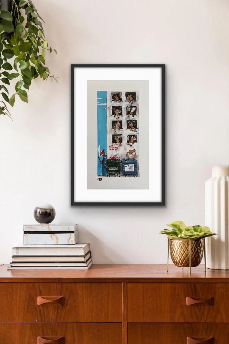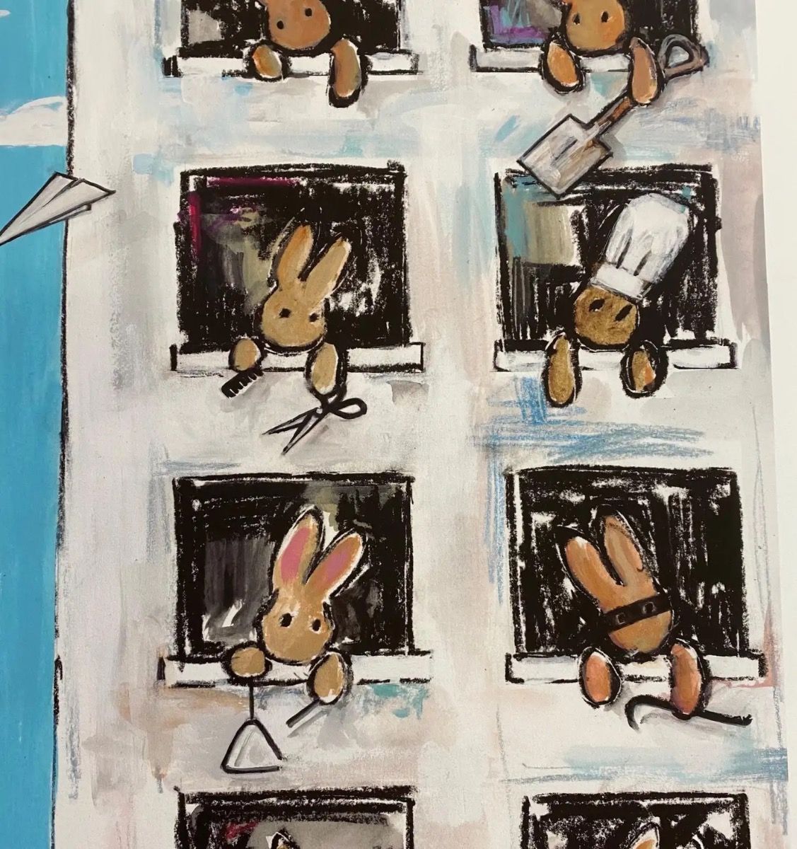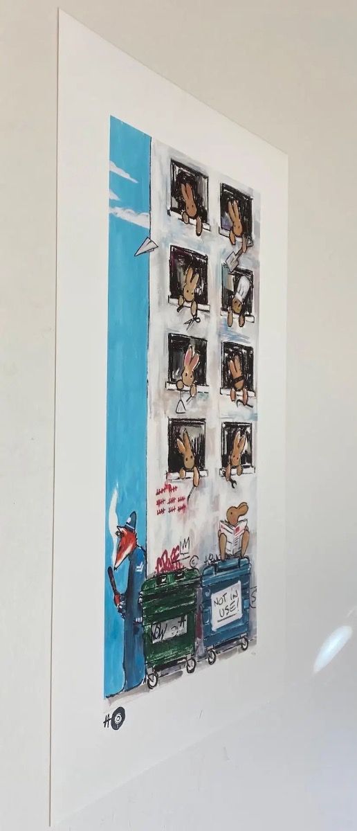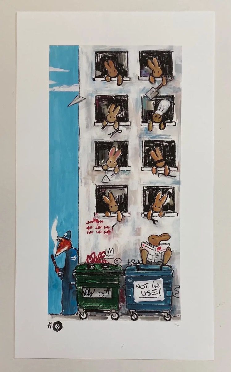Not in Use By Harry Bunce [2020] Not in Use is a limited edition print by Harry Bunce. It depicts a humorous scene of rabbits hanging out of building windows each one behaving mischievously. Please note that the complete size of unframed work is the sheet size of the paper. Additional Information:limited_editionArchival