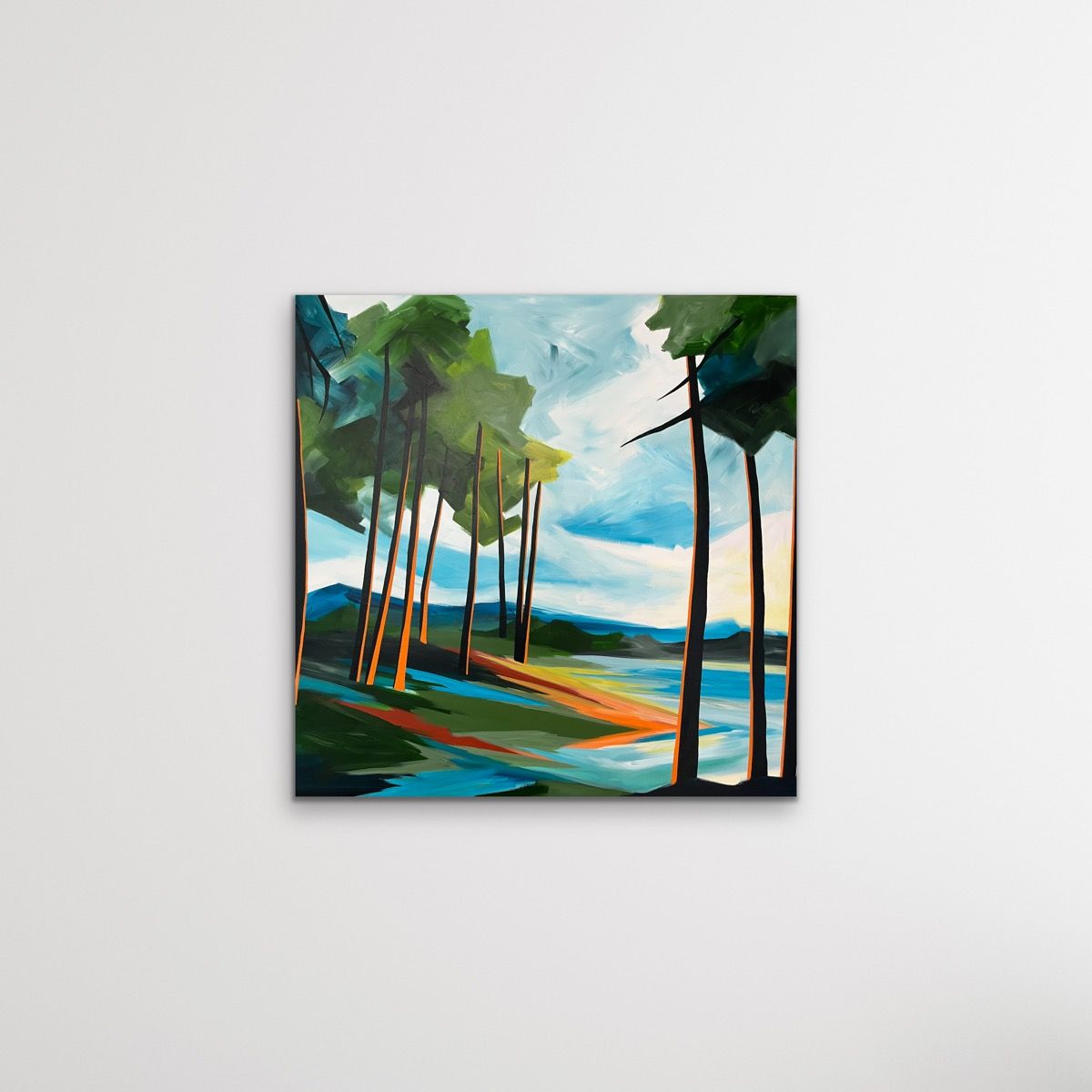This piece reminds me of summer evenings and the setting sun at the end of a hot Sunday. Sitting on the heath and sketching in Surrey these colours are the result of sitting on the heath with tingly, slightly over-exposed skin! The hot orange against the cool teal