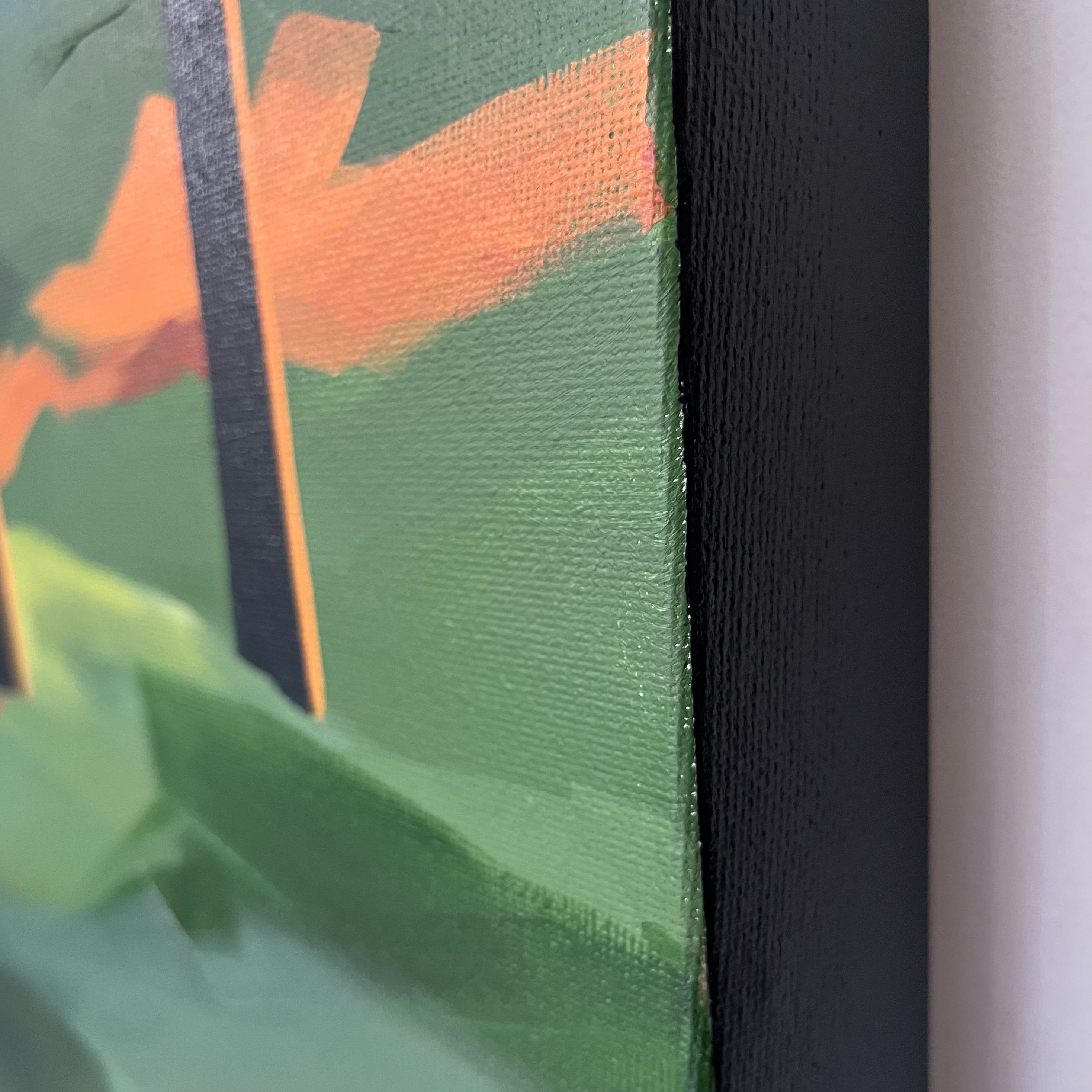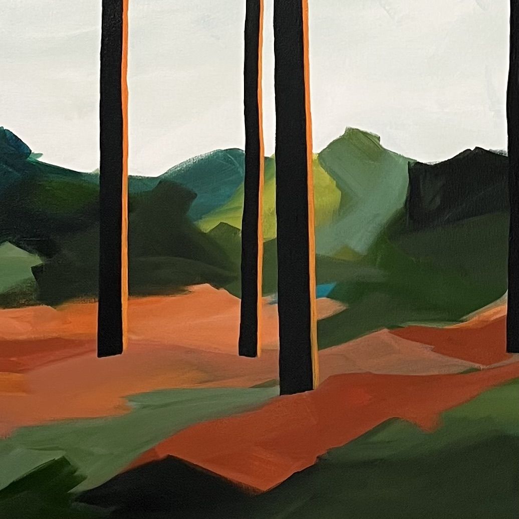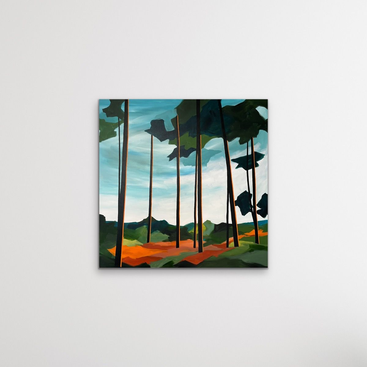 Heath is loosely based on Frensham Common in Surrey. Designed initially on the iPad, breaking the scenes down into shapes and experimenting with the colour palette. Then comes the fun with paint and blending the tones on the canvas. The geometric nature of the trees brings some