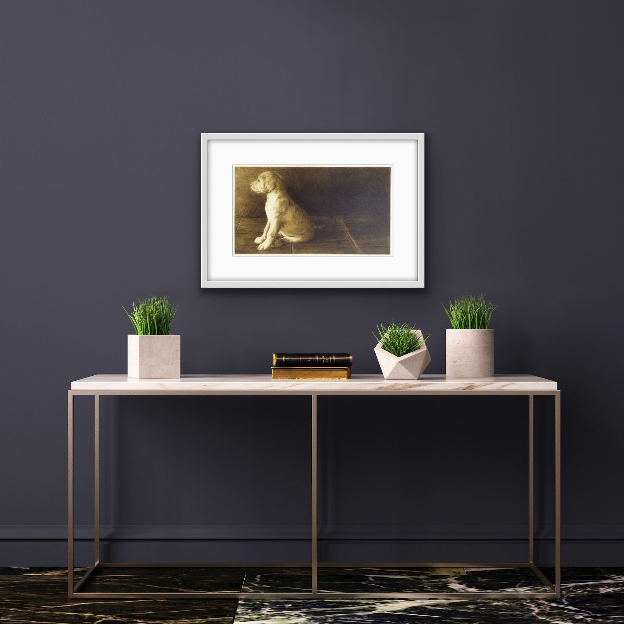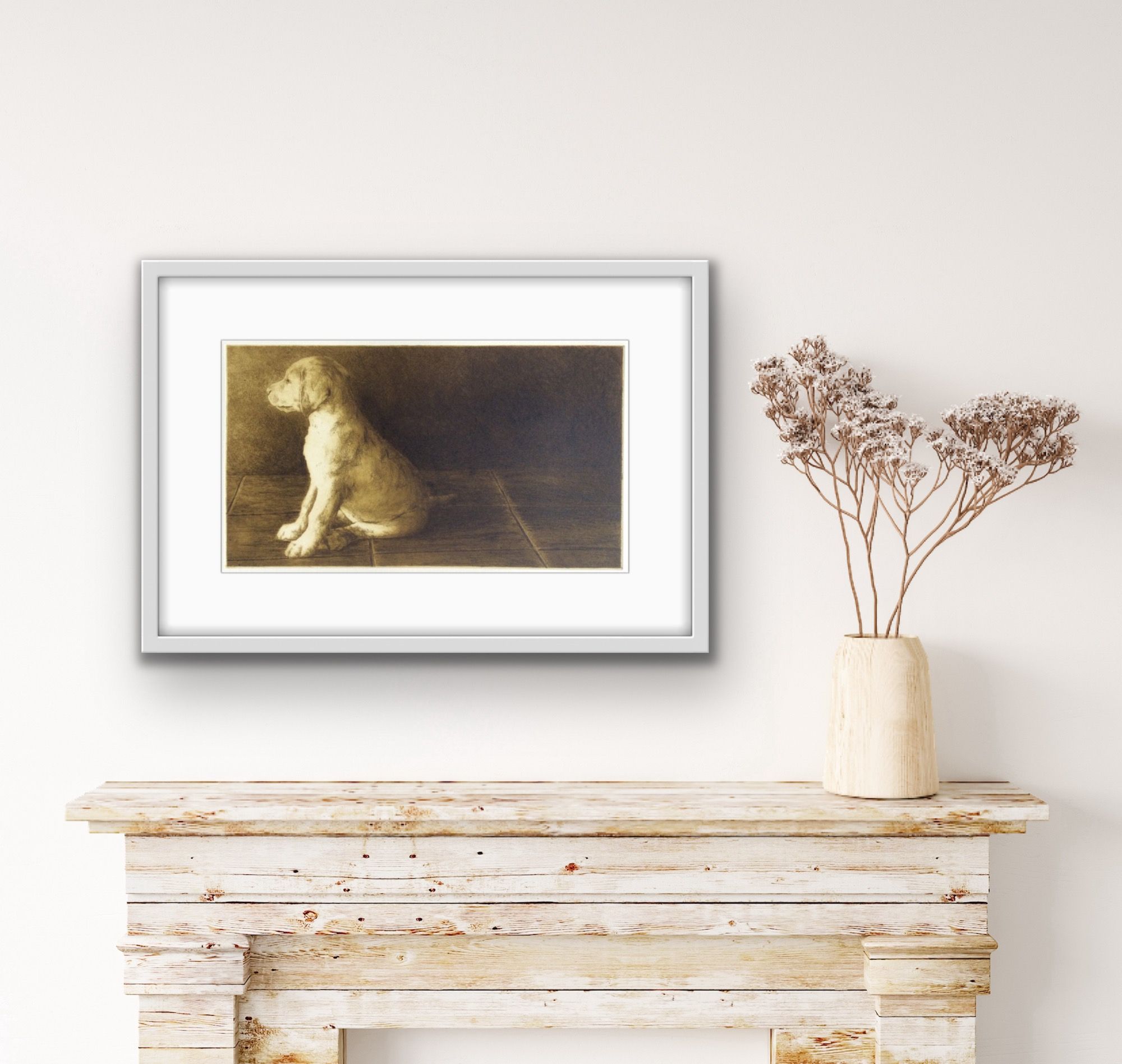 N.B. This is an original print. Etching of a glorious, lion like Golden Labrador puppy who is now a massive softy. He's sitting on a tiled floor, watching everything around him. His full tummy and huge paws catching the light.