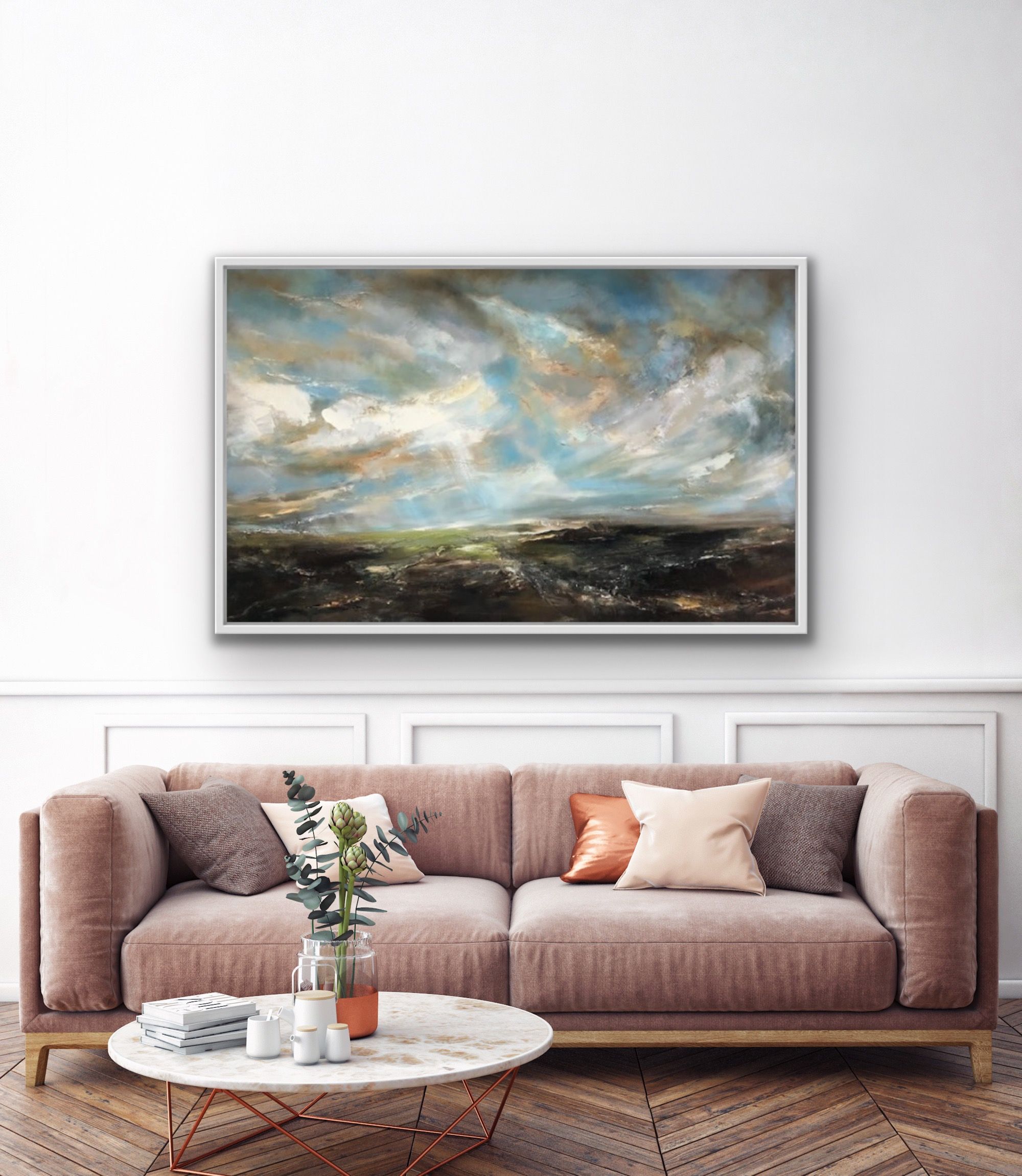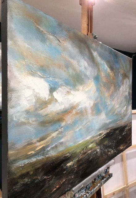Dreaming of the Mountains is an original landscape painting by Helen Howells. Dreaming of the mountains is the artists yearning to walk in valleys, and mountains in her beloved South Wales, after lockdown restrictions are over. In the studio the emotional journey begins. Combining my love of painting, I have