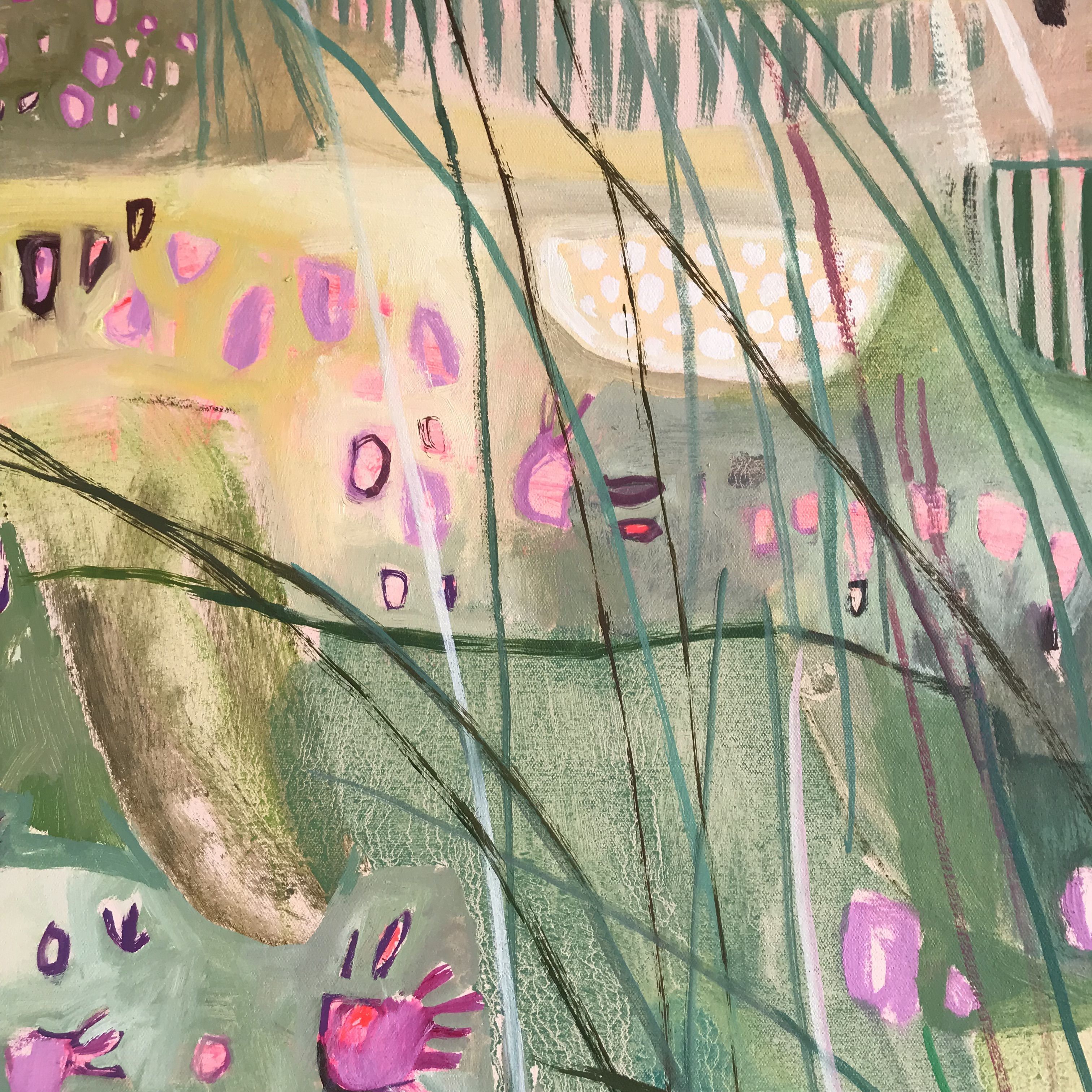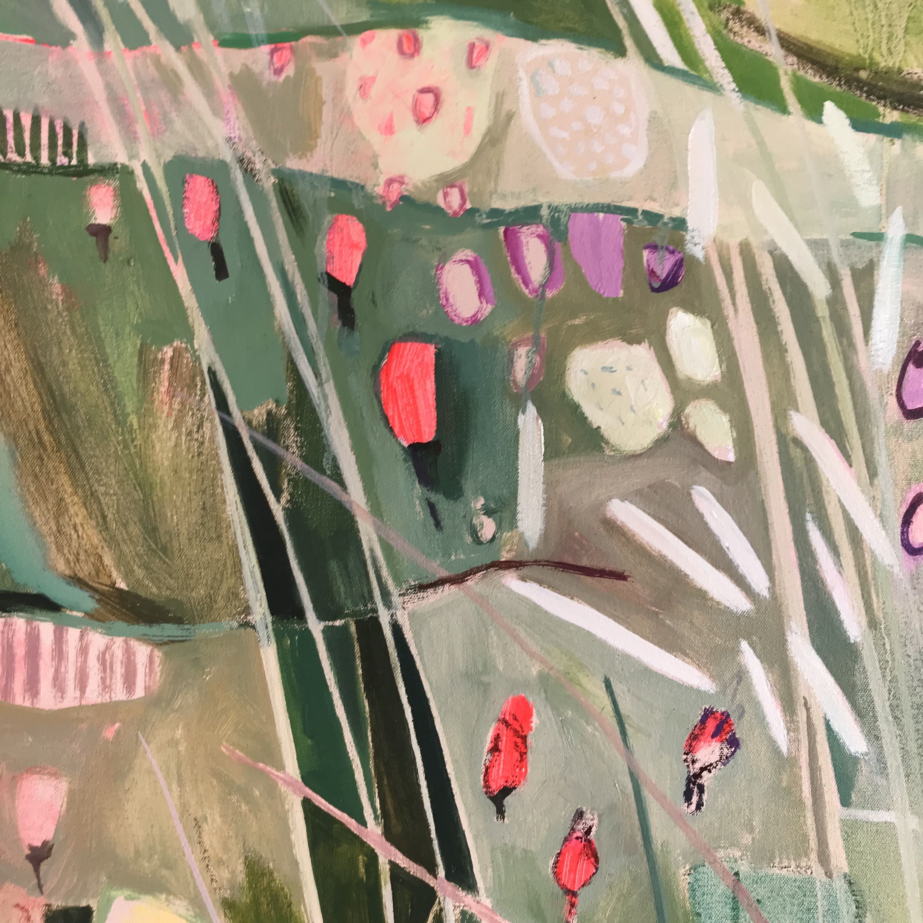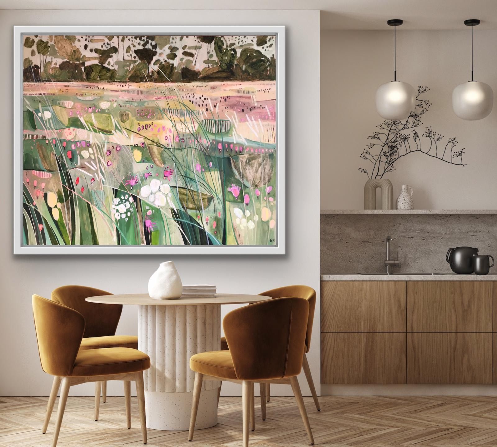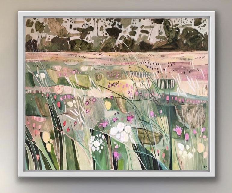 An interpretation of a wild flower meadow, in the height of summer. This is an ancient floodplain meadow with all the typical wildflowers of this habitat. This work captures the colours of purple knapweed, pink clover, yellow ladies bedstraw, creamy white meadow sweet and many others amongst the soft green