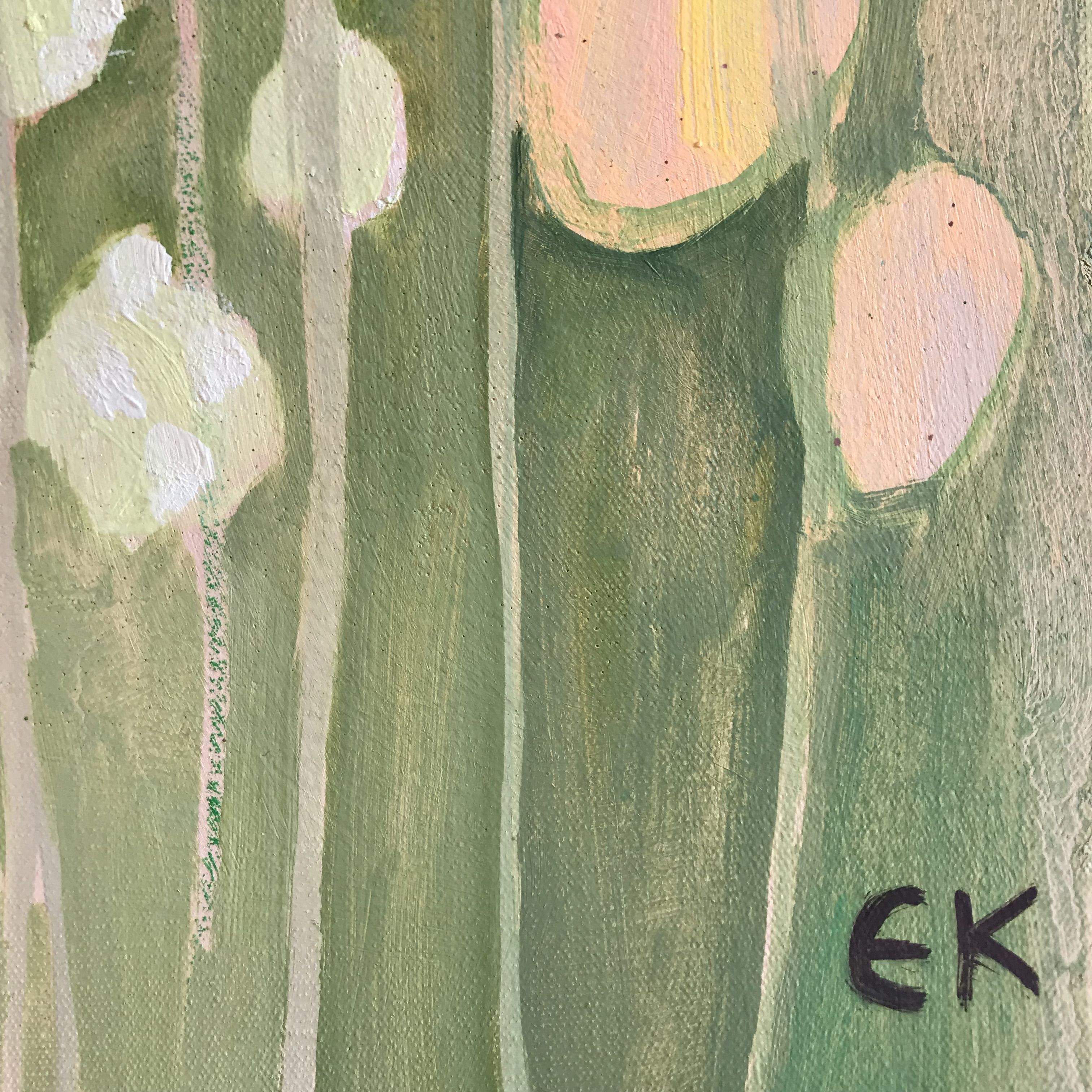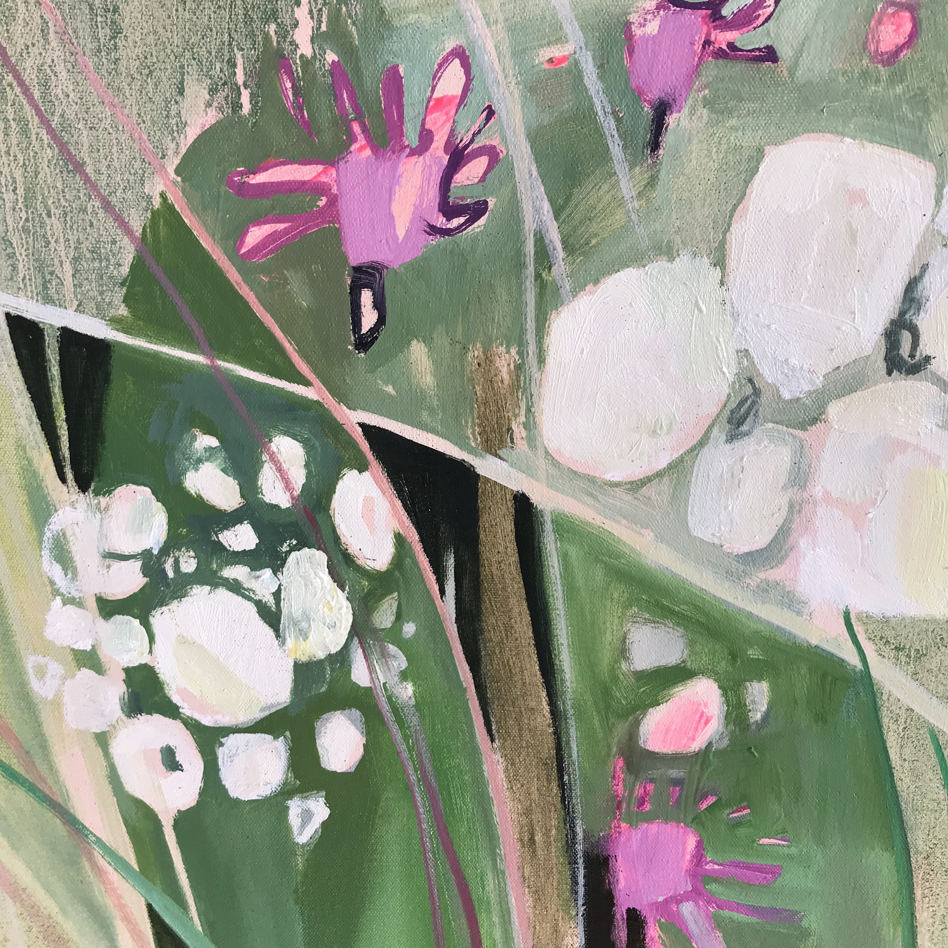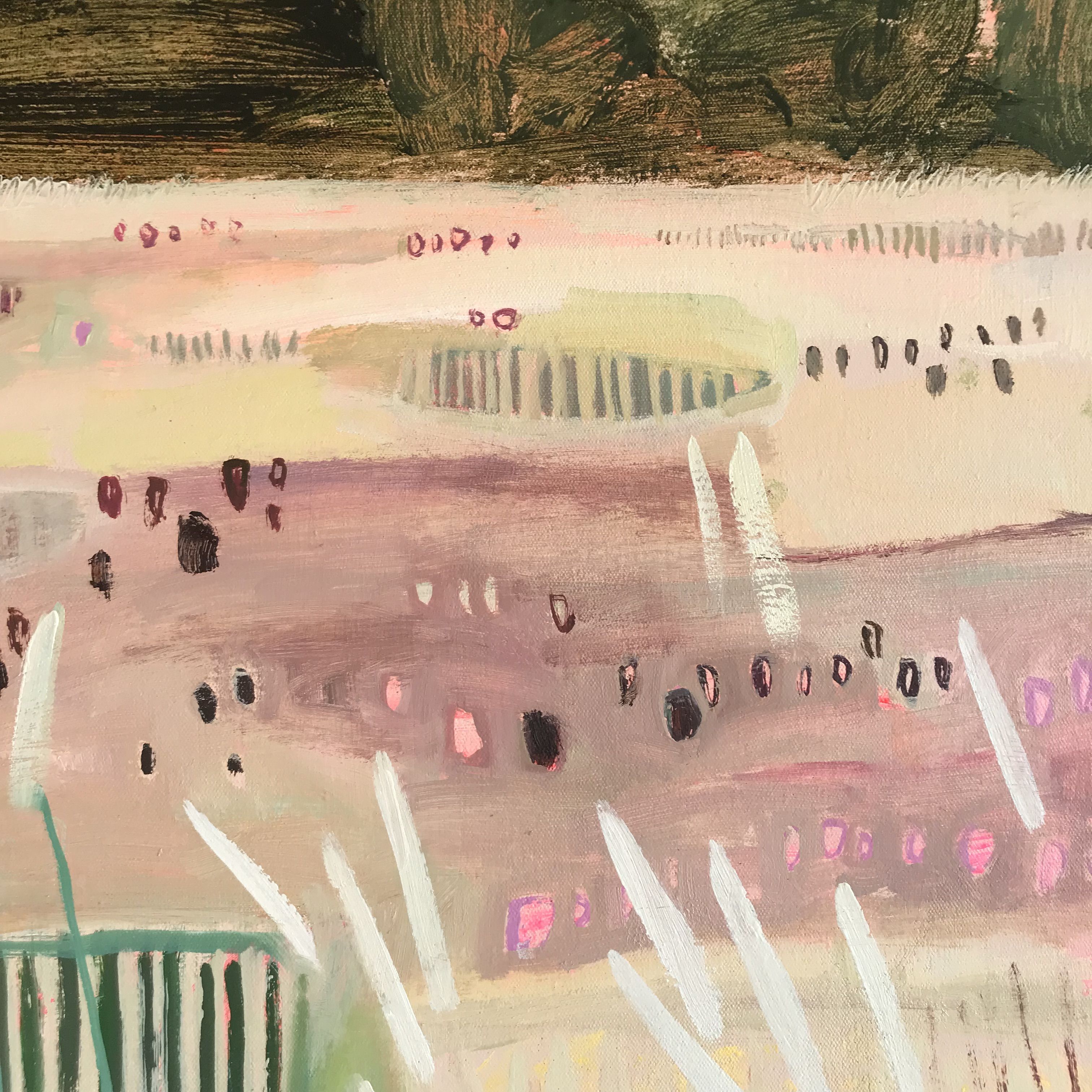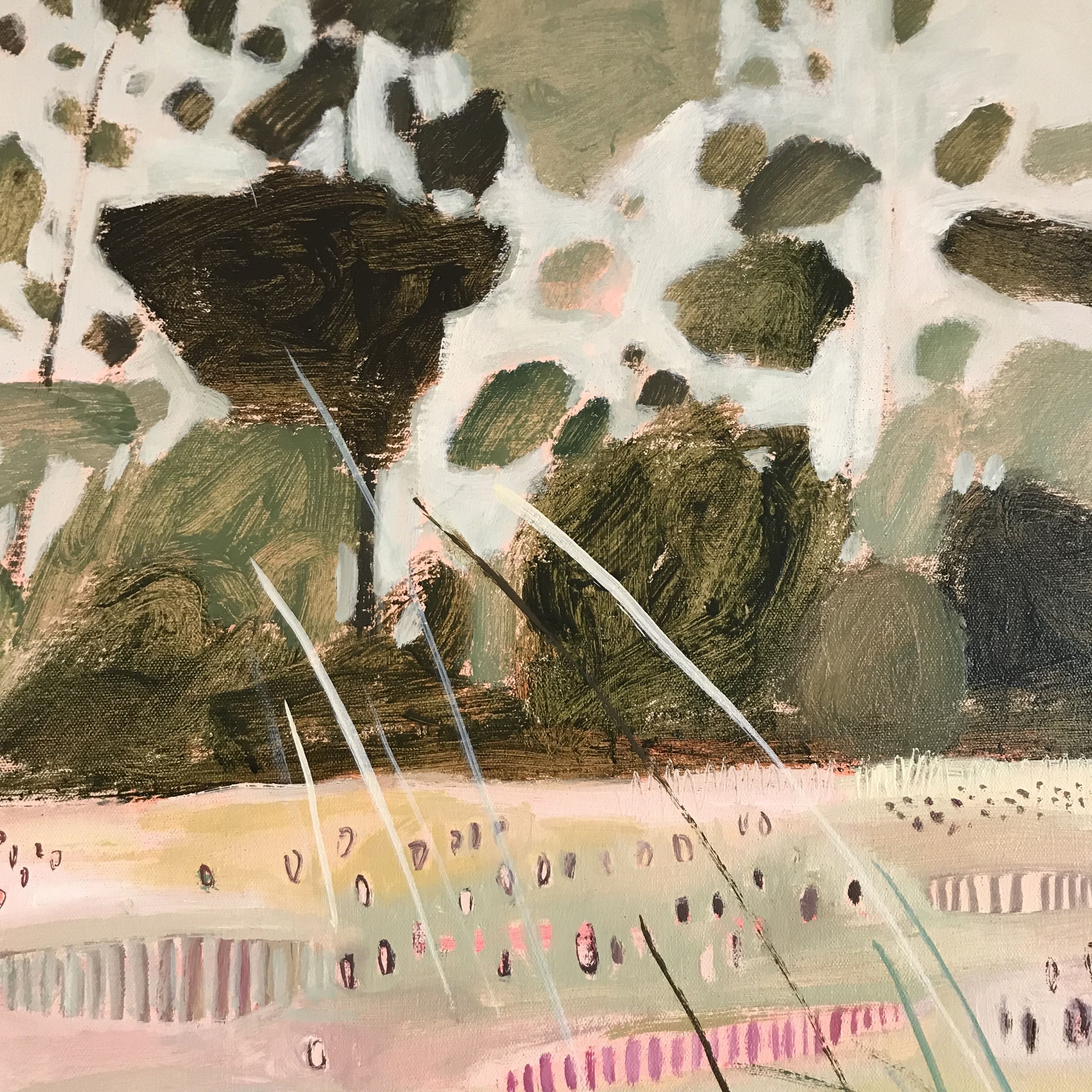 An interpretation of a wild flower meadow, in the height of summer. This is an ancient floodplain meadow with all the typical wildflowers of this habitat. This work captures the colours of purple knapweed, pink clover, yellow ladies bedstraw, creamy white meadow sweet and many others amongst the soft green