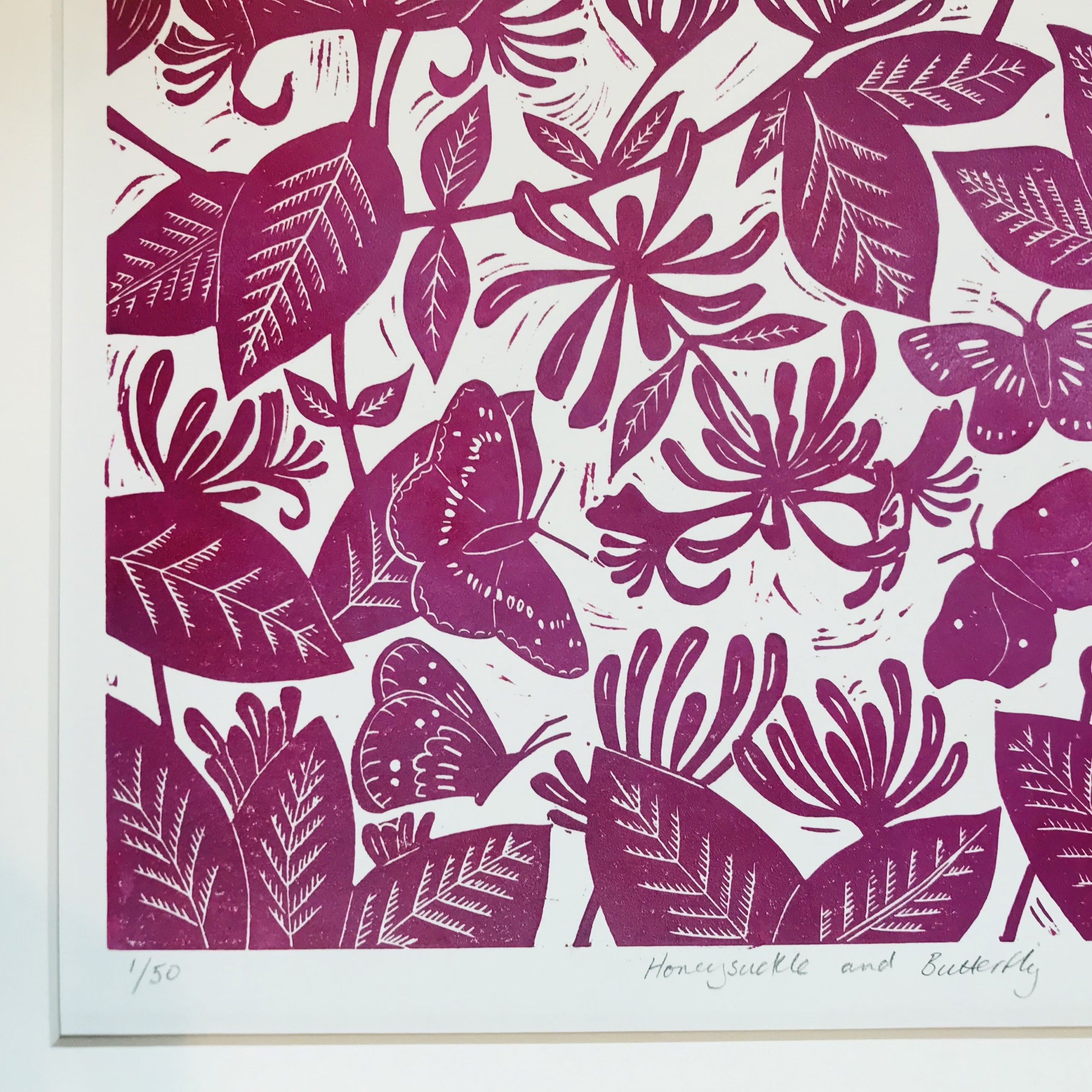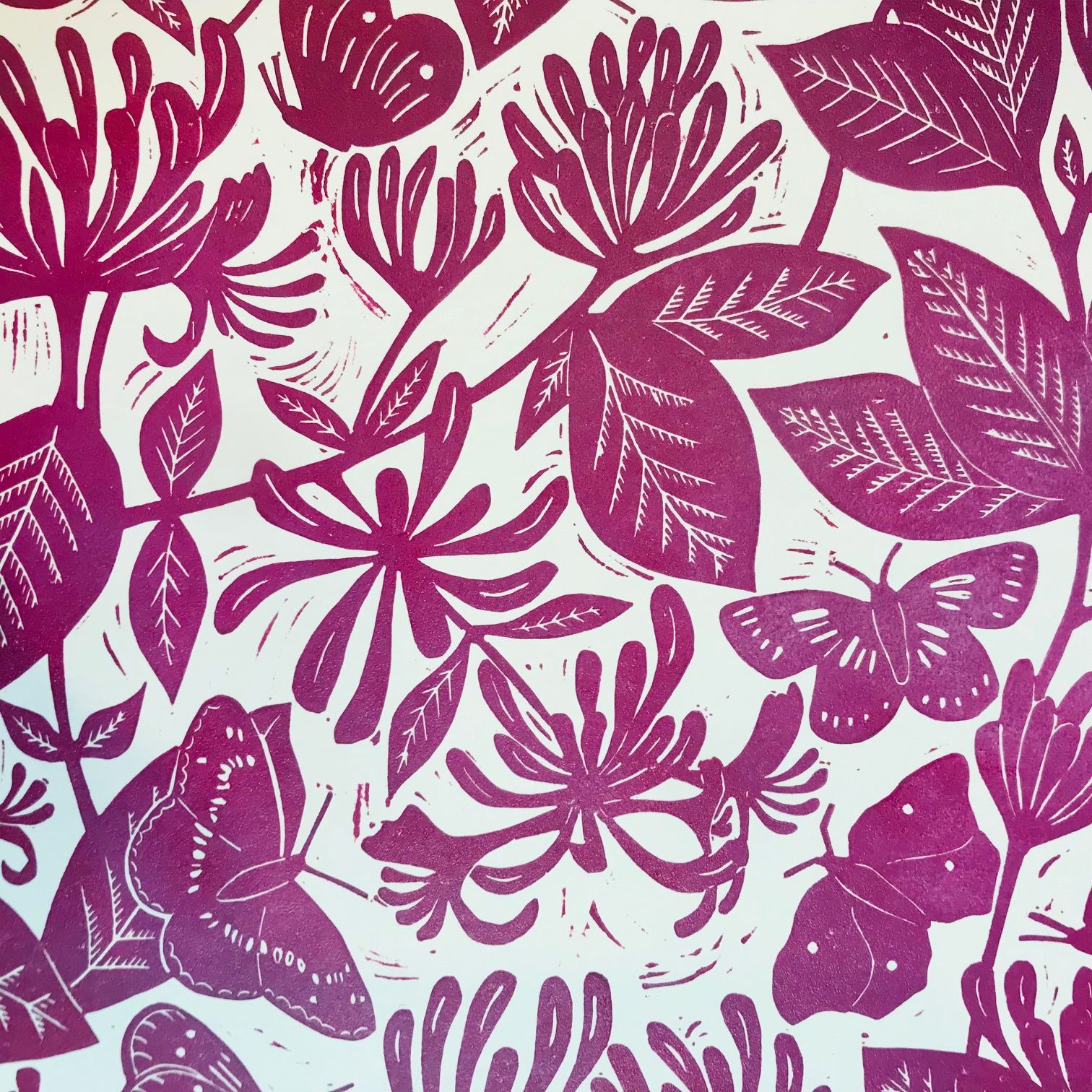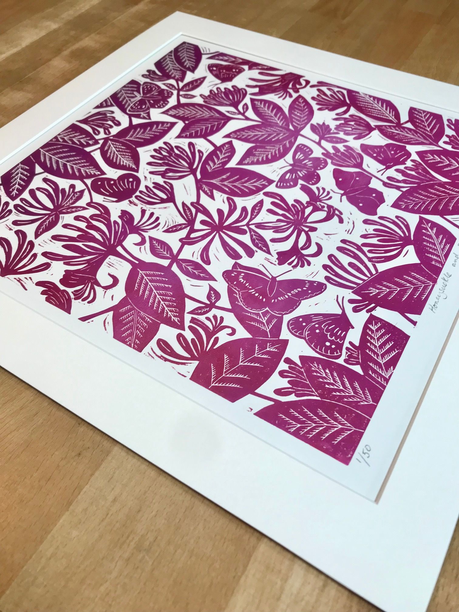 Honeysuckle and Butterfly is a limited edition linocut print. Climbing Honeysuckle leaves, flowers and buds intertwine with butterflies, creating a striking print with lots of movement. This is a variable edition as the lino block is hand rolled with different shades of light and dark burgundy for each linocut print. Each