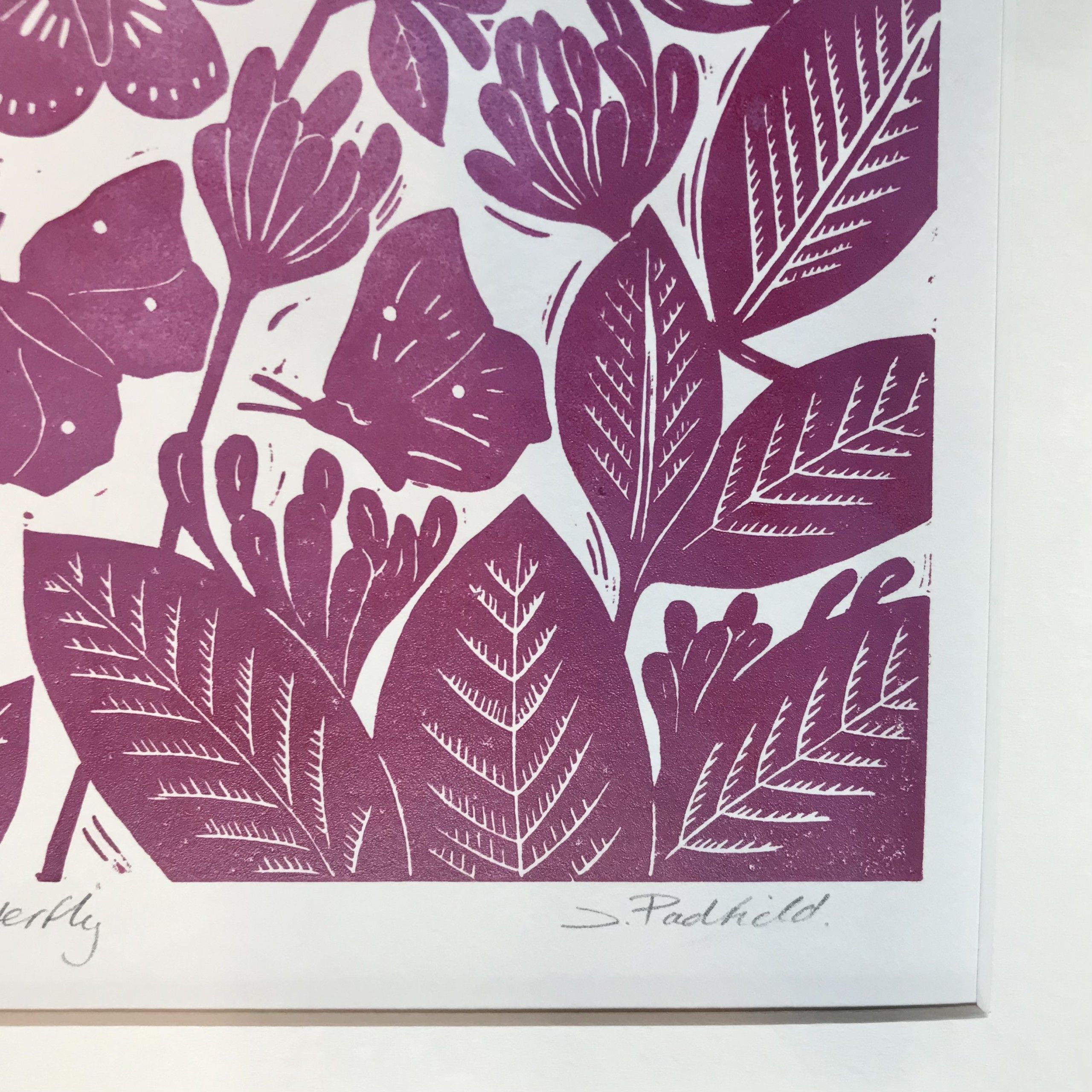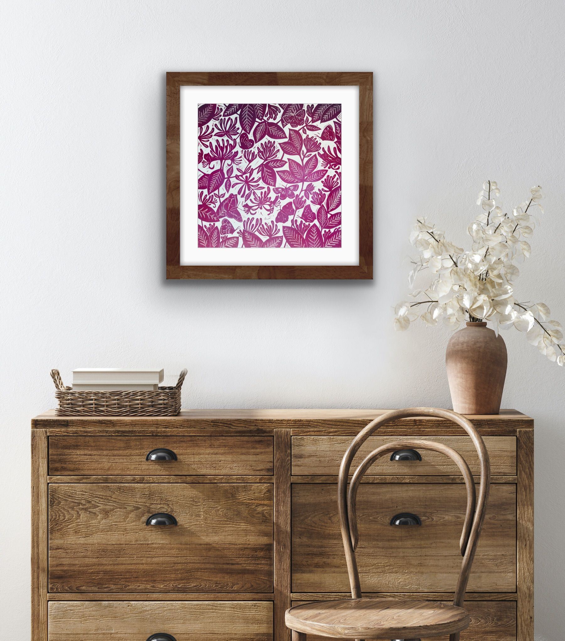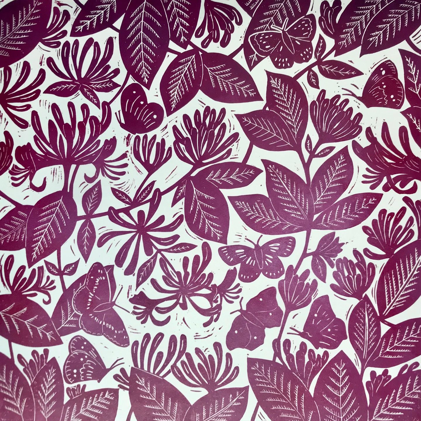 Honeysuckle and Butterfly is a limited edition linocut print. Climbing Honeysuckle leaves, flowers and buds intertwine with butterflies, creating a striking print with lots of movement. This is a variable edition as the lino block is hand rolled with different shades of light and dark burgundy for each linocut print. Each