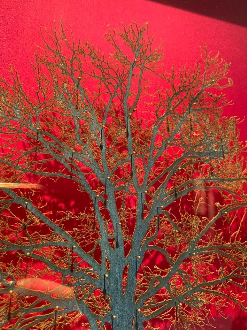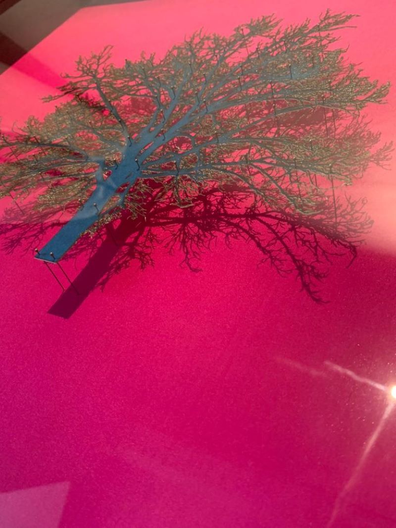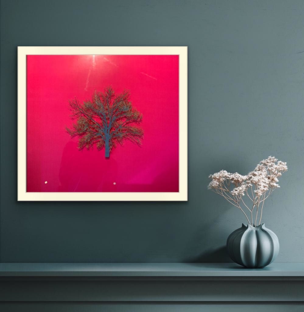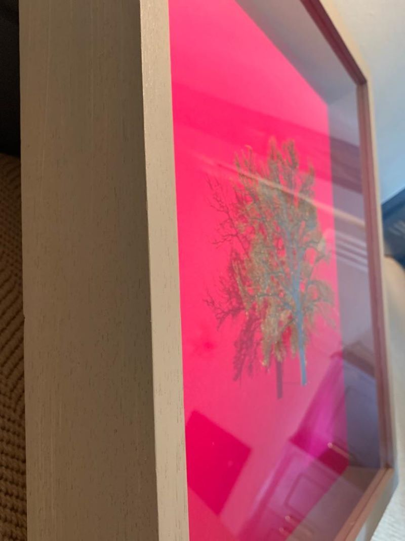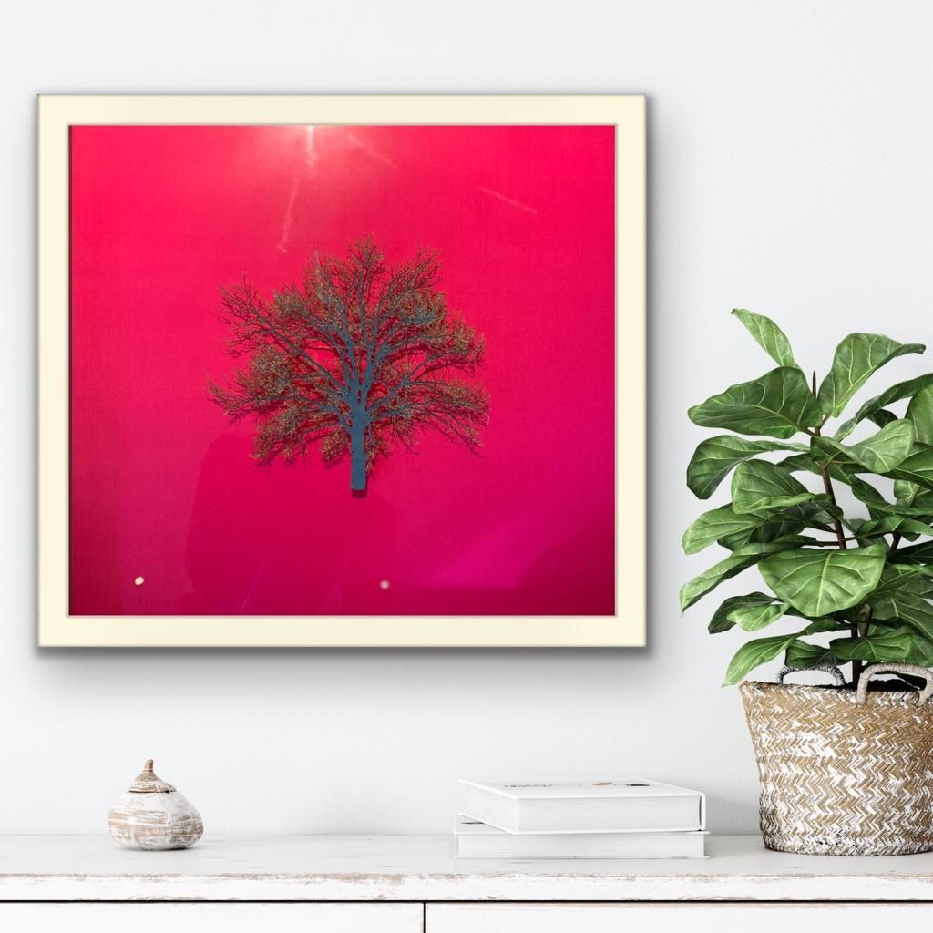 Original work by Emma Levine, 'Hot Oak.' A bright, colourful hot pink silk background with a laser cut paper oak tree attached with pins. 53cm x 53cm - Framed Silk, paper, entomology pins Creation Year: 2016