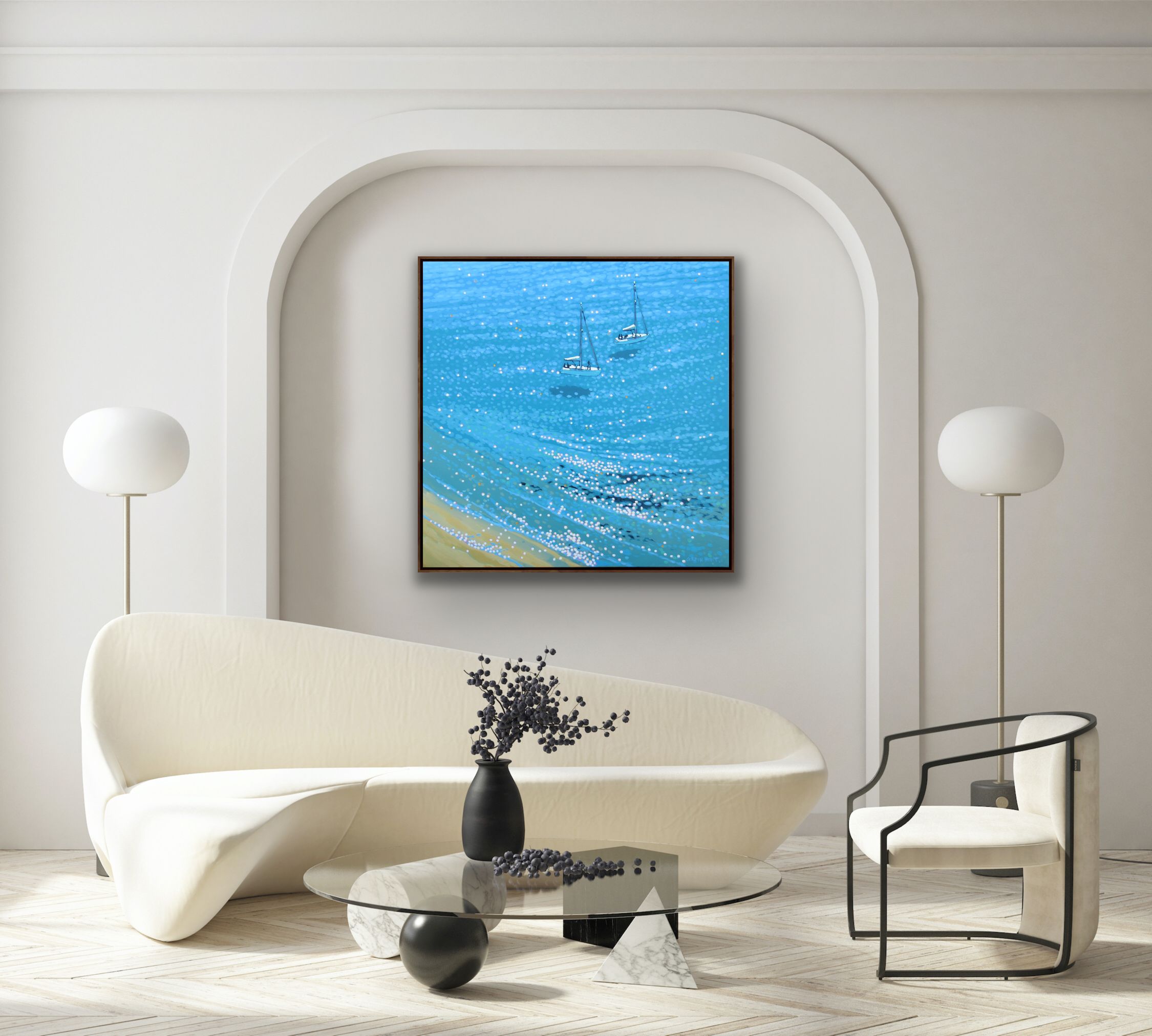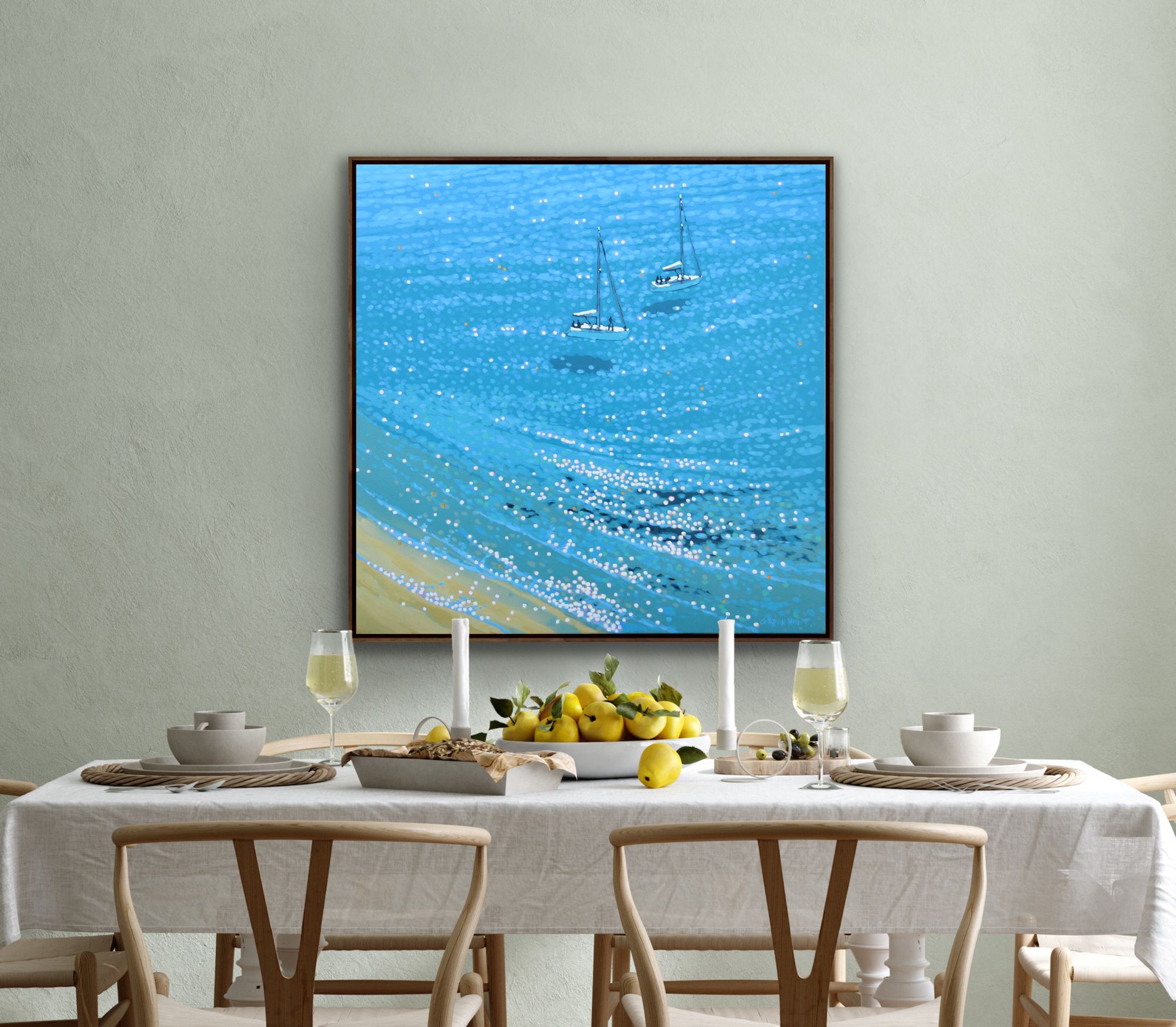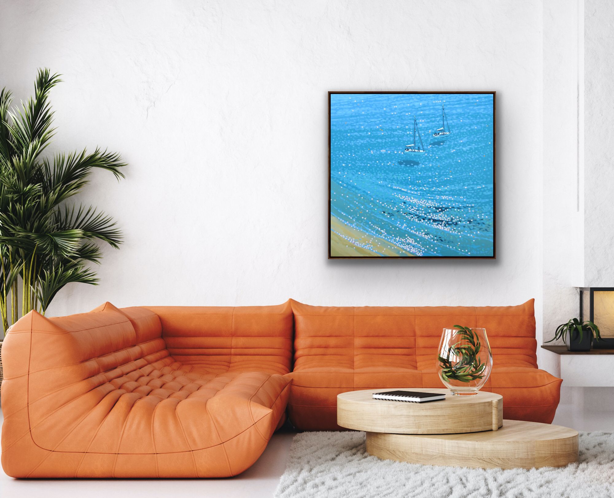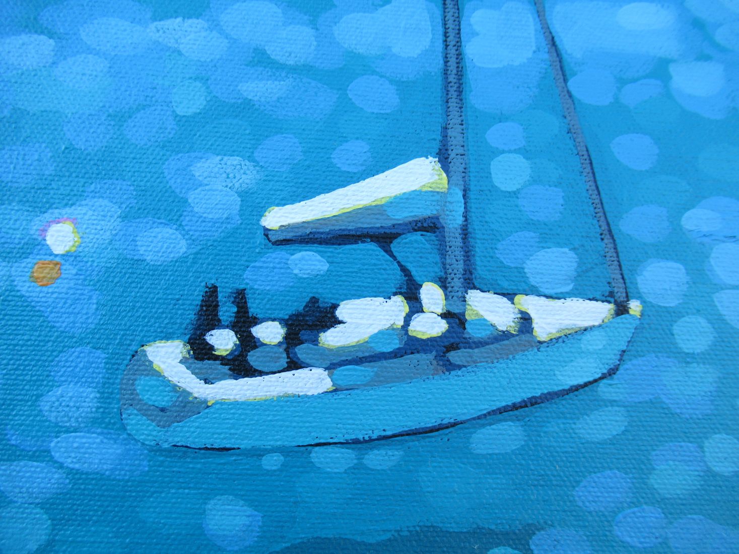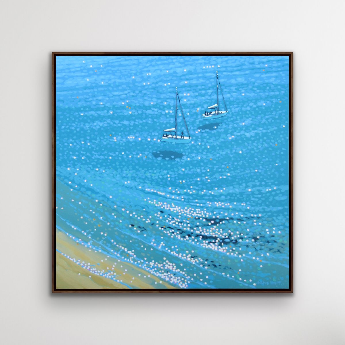 Turquoise bay is an original painting in acrylic by Gordon Hunt. Two yachts sailing away from a sandy beach, after being anchored up for a while. Everything is very peaceful, quiet and tranquil. Why not commission your own painting of this subject? - with your own friends/yachts/colours in the