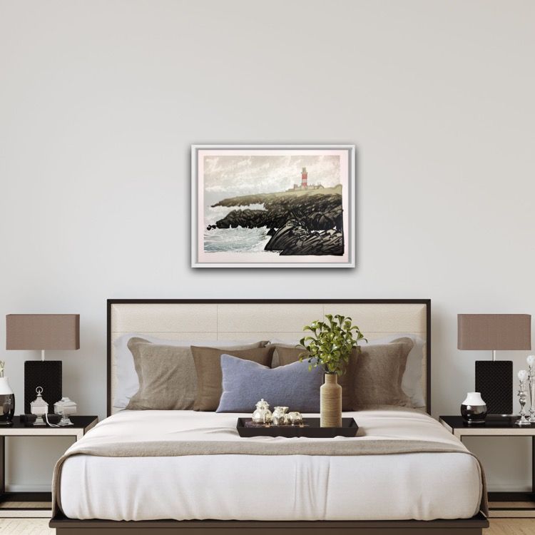 Ian Phillips Lighthouse Limited Edition Linocut Print on Paper Edition of 12 Image Size: H 56cm x W 76cm x D 0.01cm Sold Unframed Free Shipping Please note that in situ images are purely an indication of how a piece may look. Lighthouse is a limited edition seascape print by Ian Phillips. The light colours palette and bold style