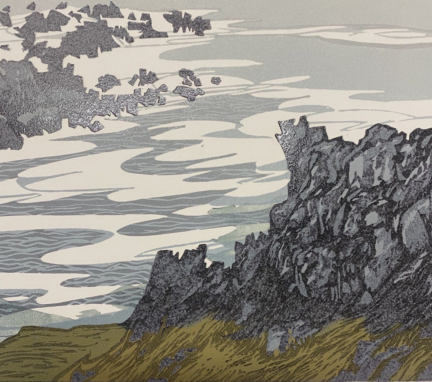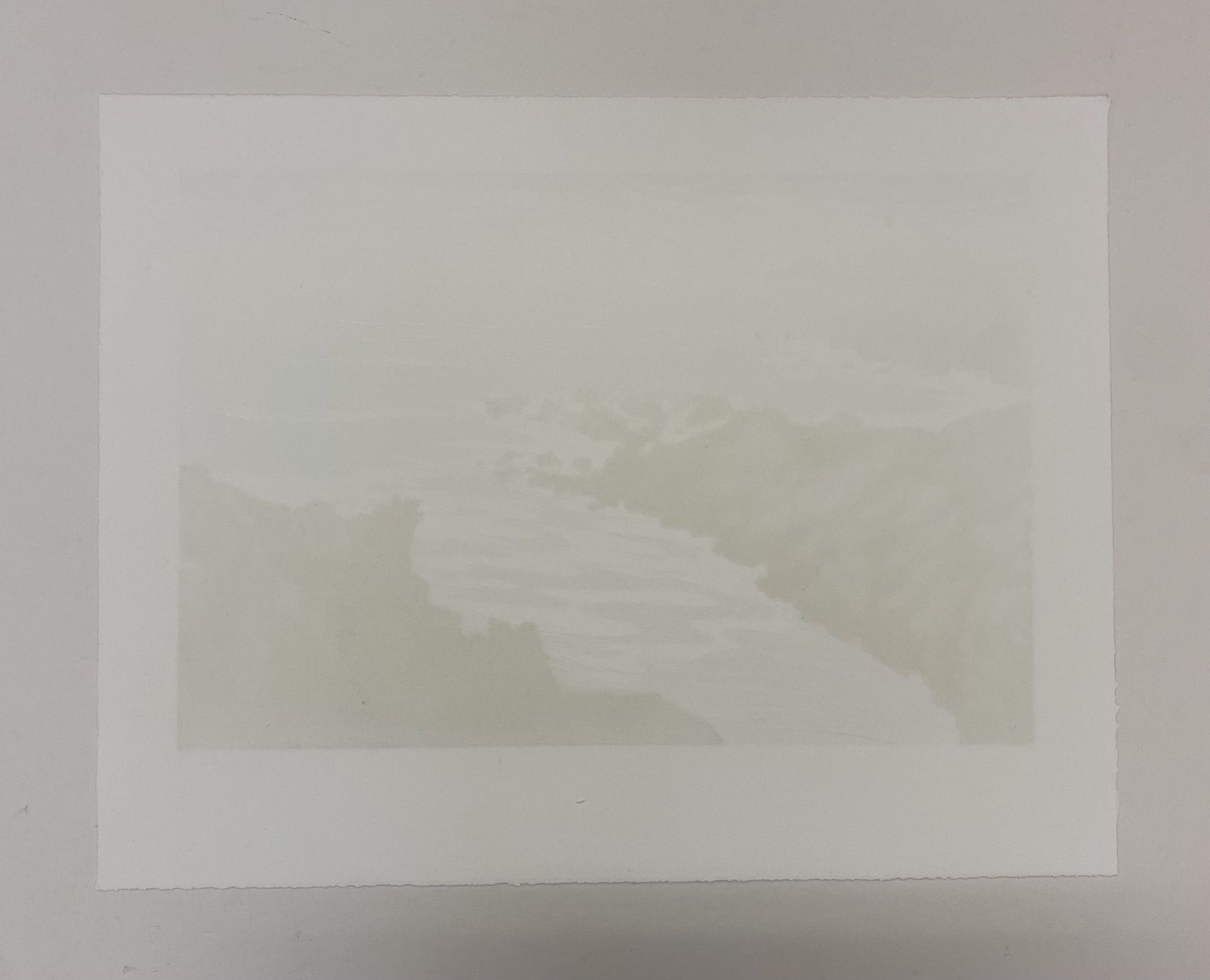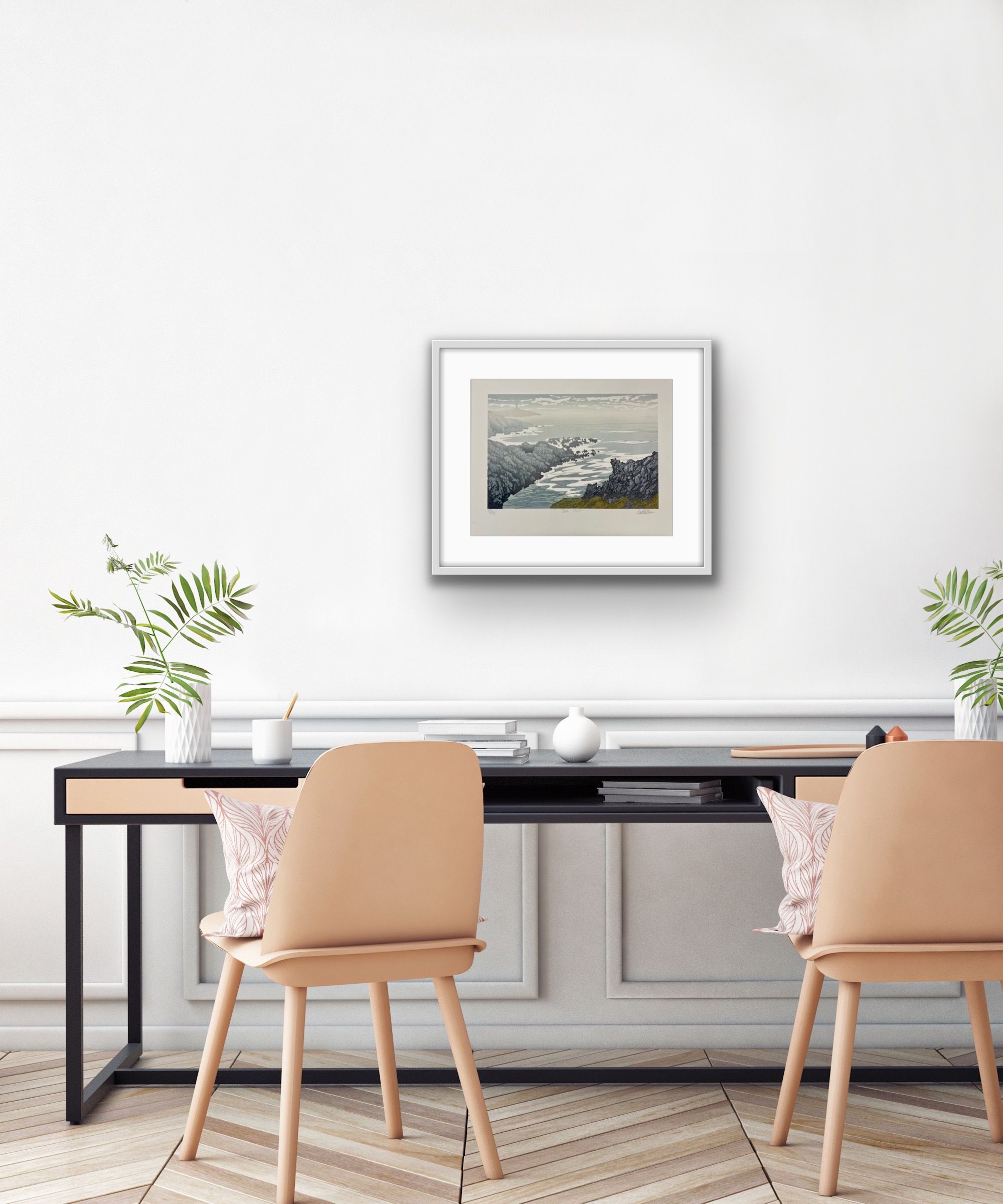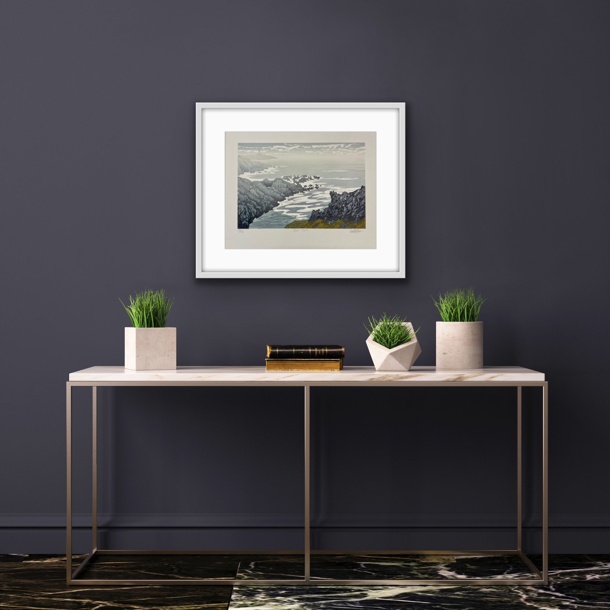Sea Mist is a limited edition print by Ian Phillips. It features a coastal scene with cliff edges around the sea.