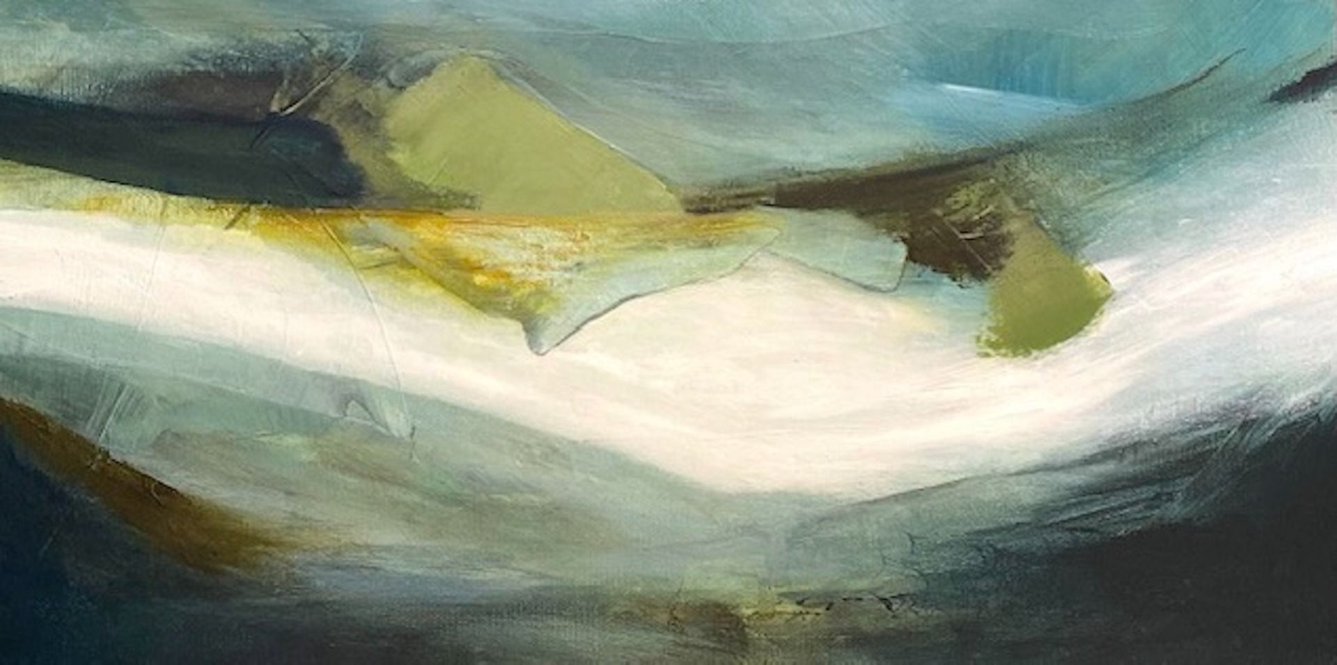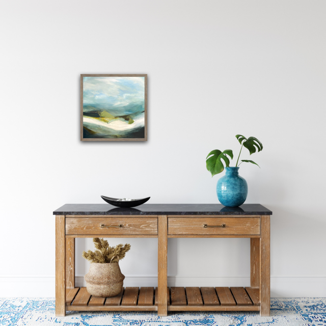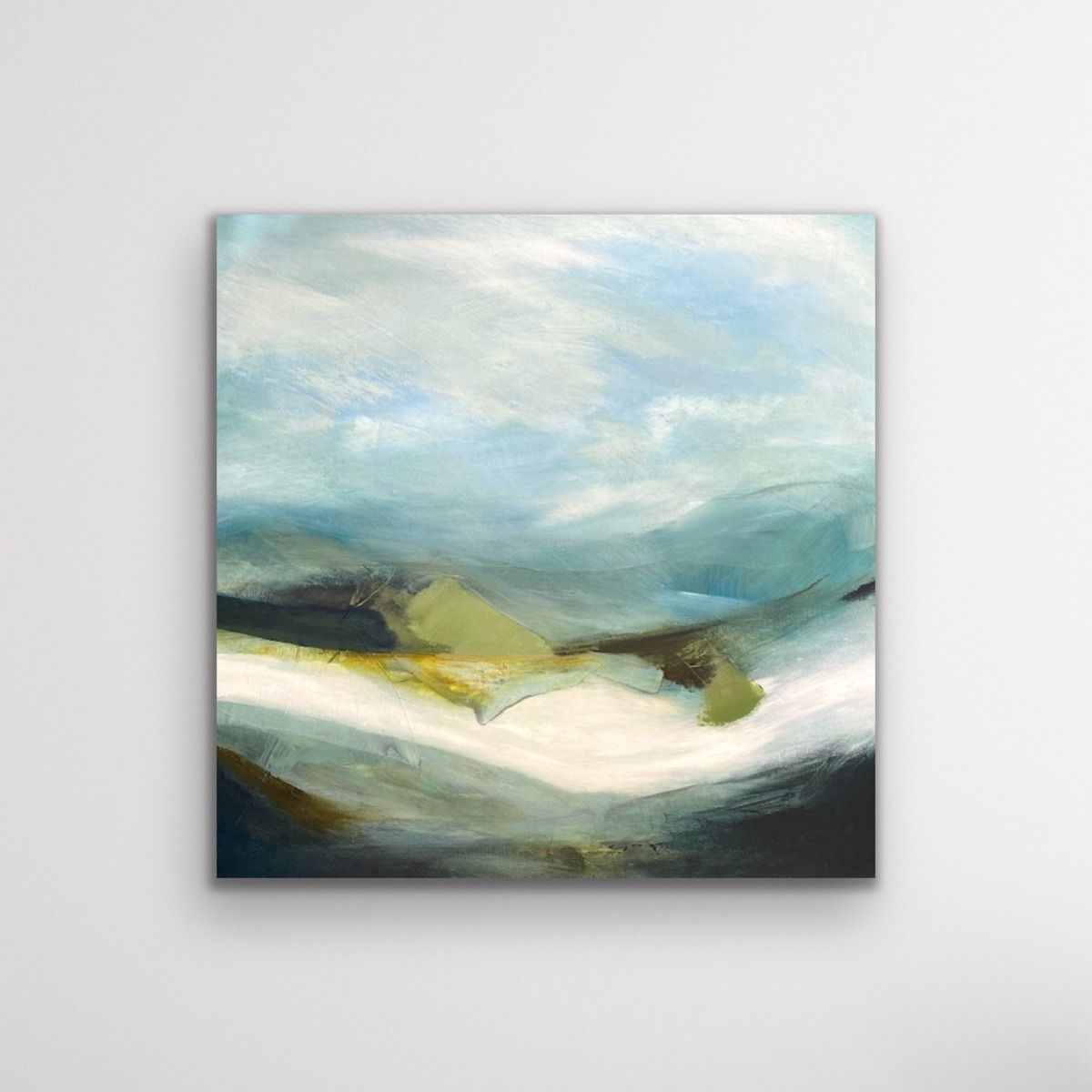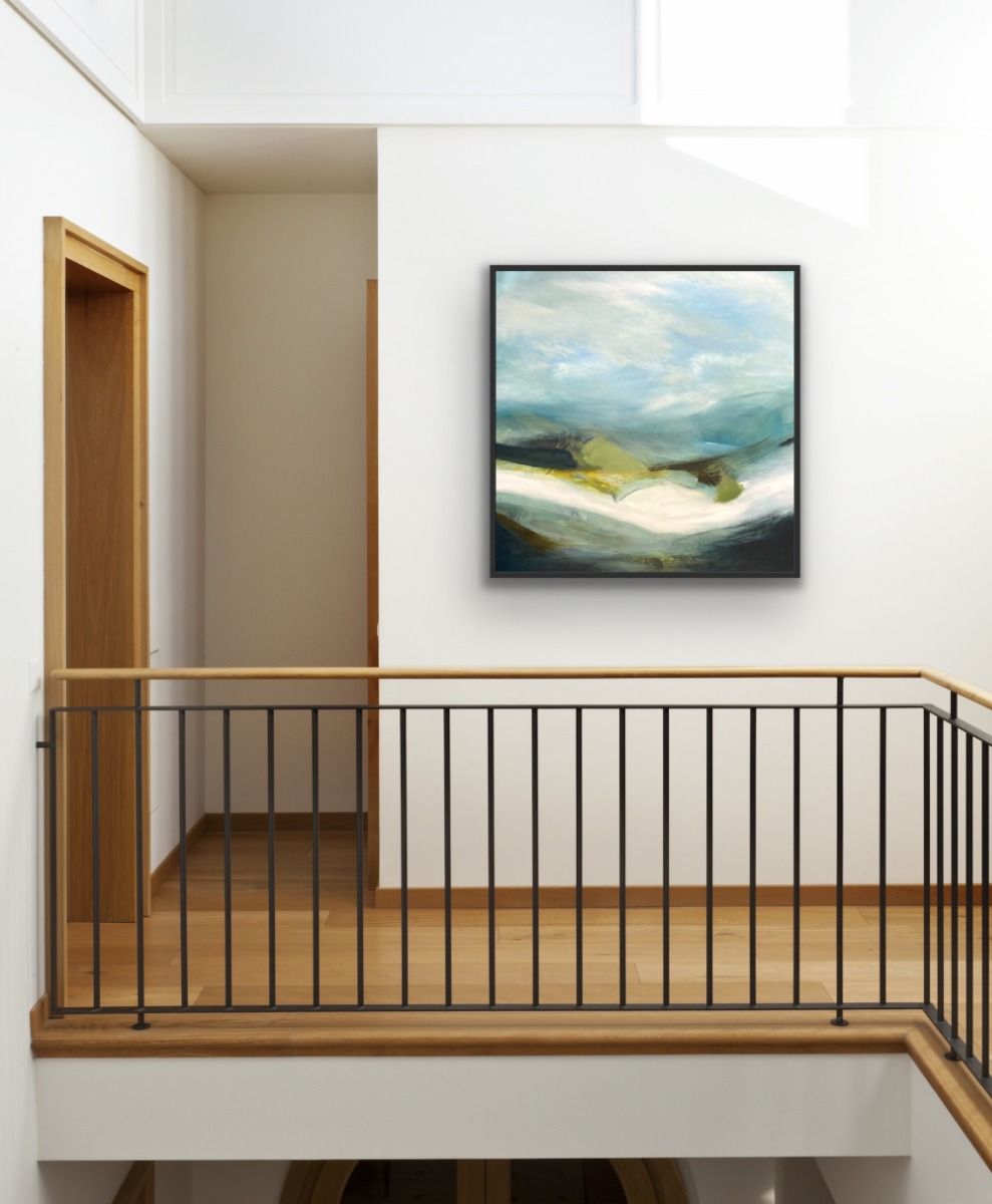 Icefall is a painting that was inspired by the Cuillins of Skye and the patches of snow that are left long after Winter has departed. The brightness and reflective quality give it such an otherworldly feeling. The painting is on a deep edge canvas with a harmonising blue shade on