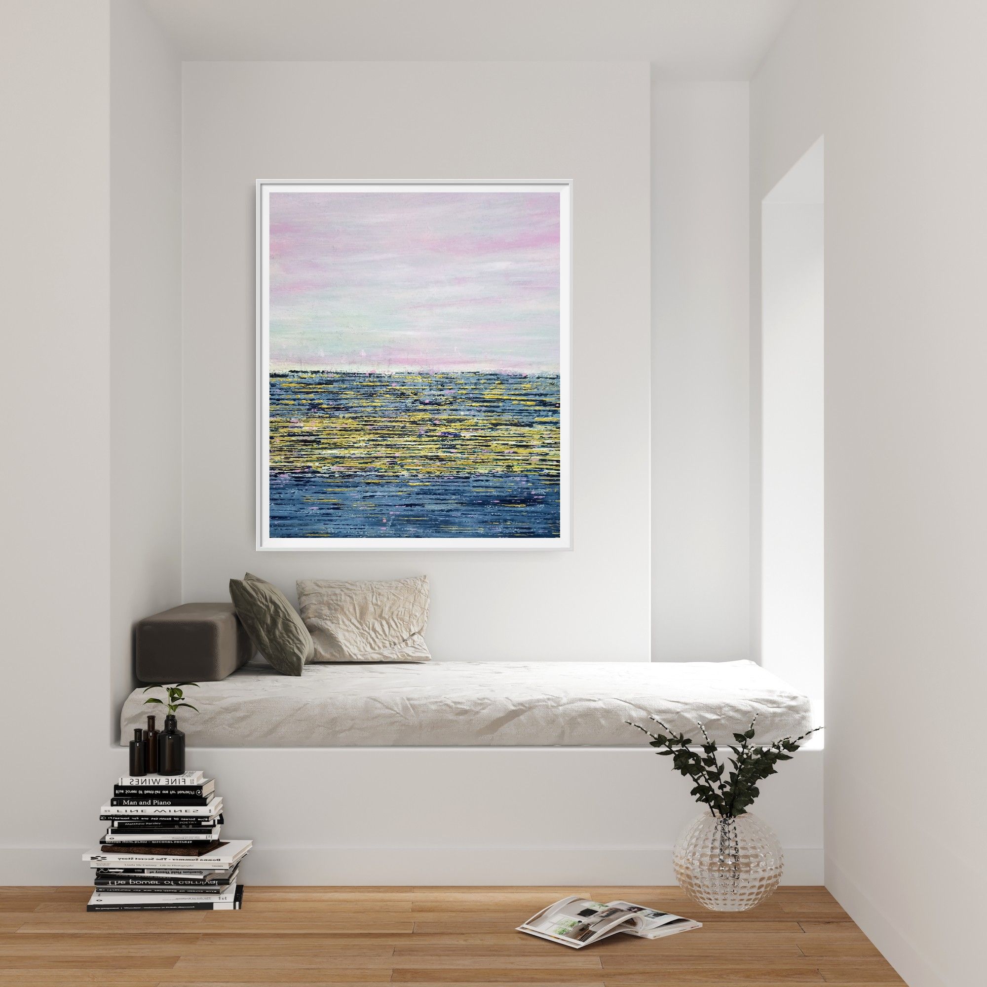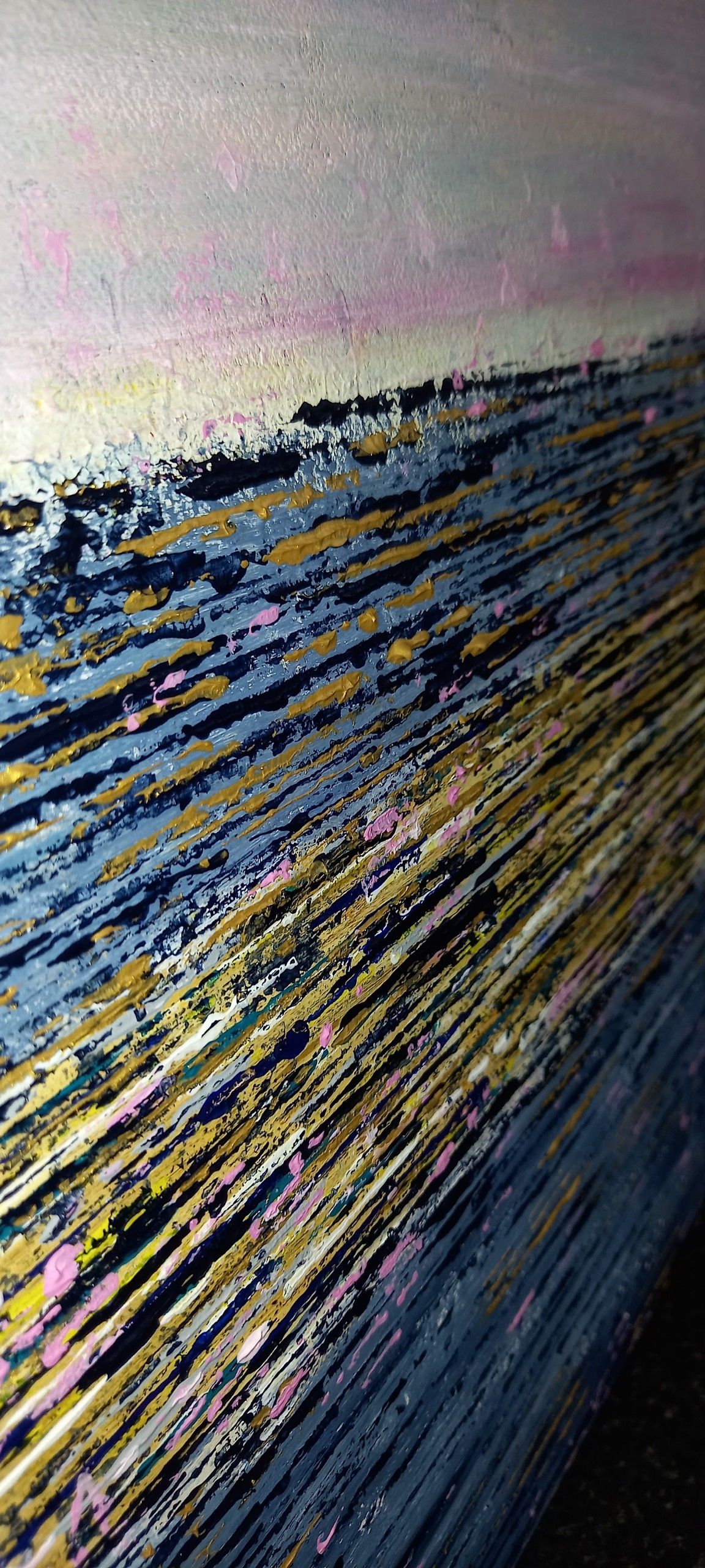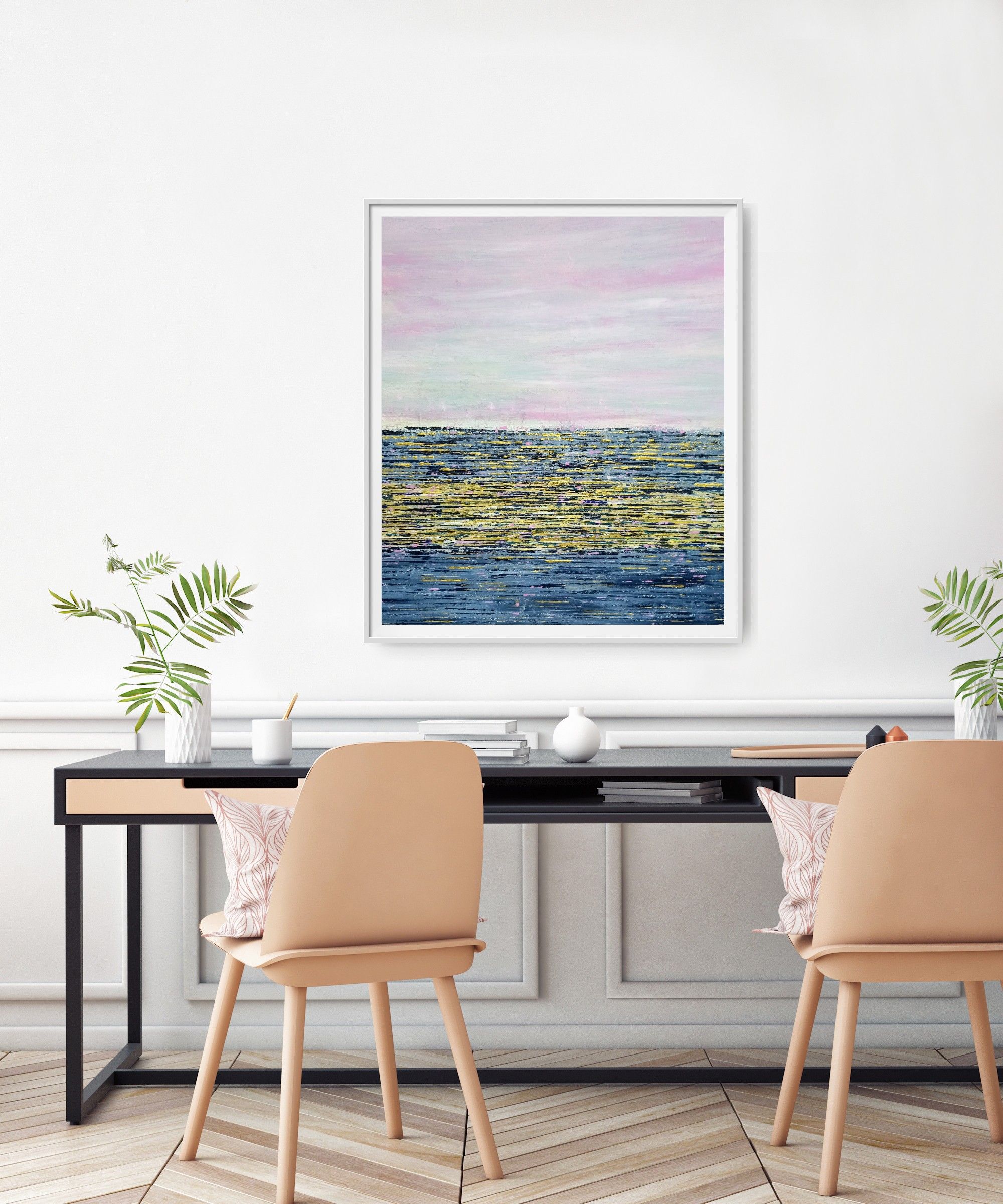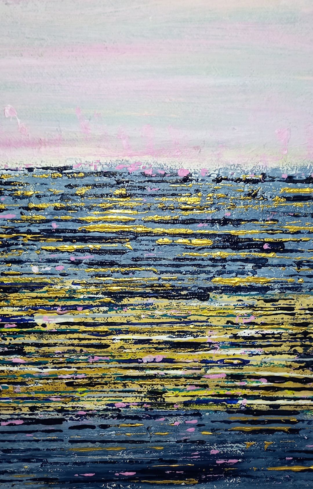 The pinks give a calm, serene feel to this piece. The dazzling sea is conjured up by the pop of gold and pink. A joy on any wall.