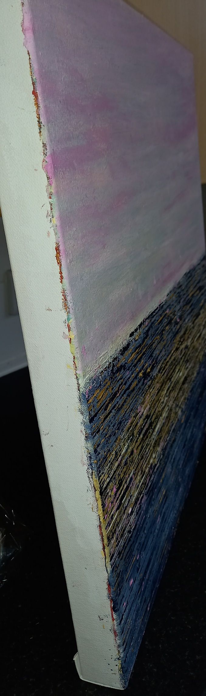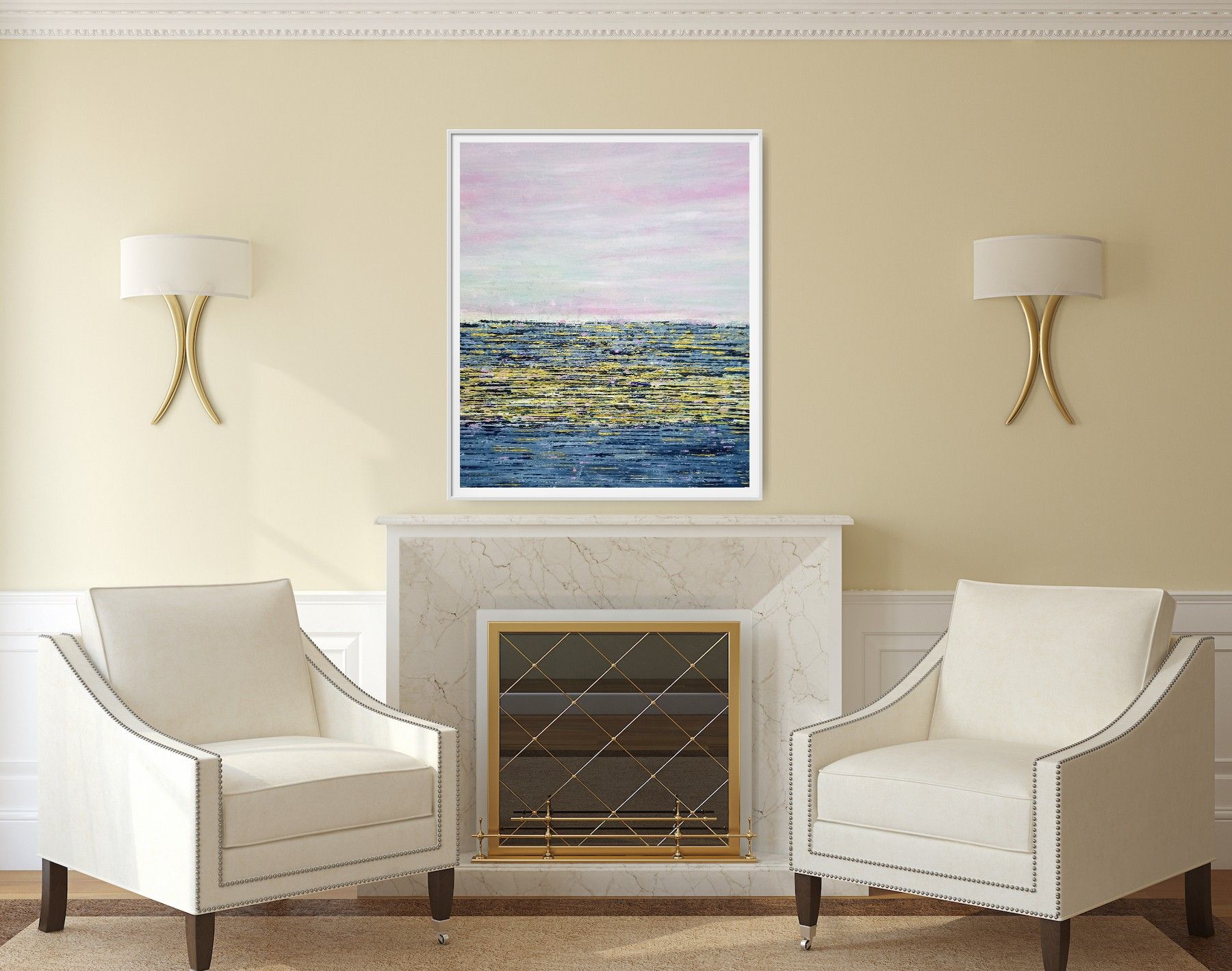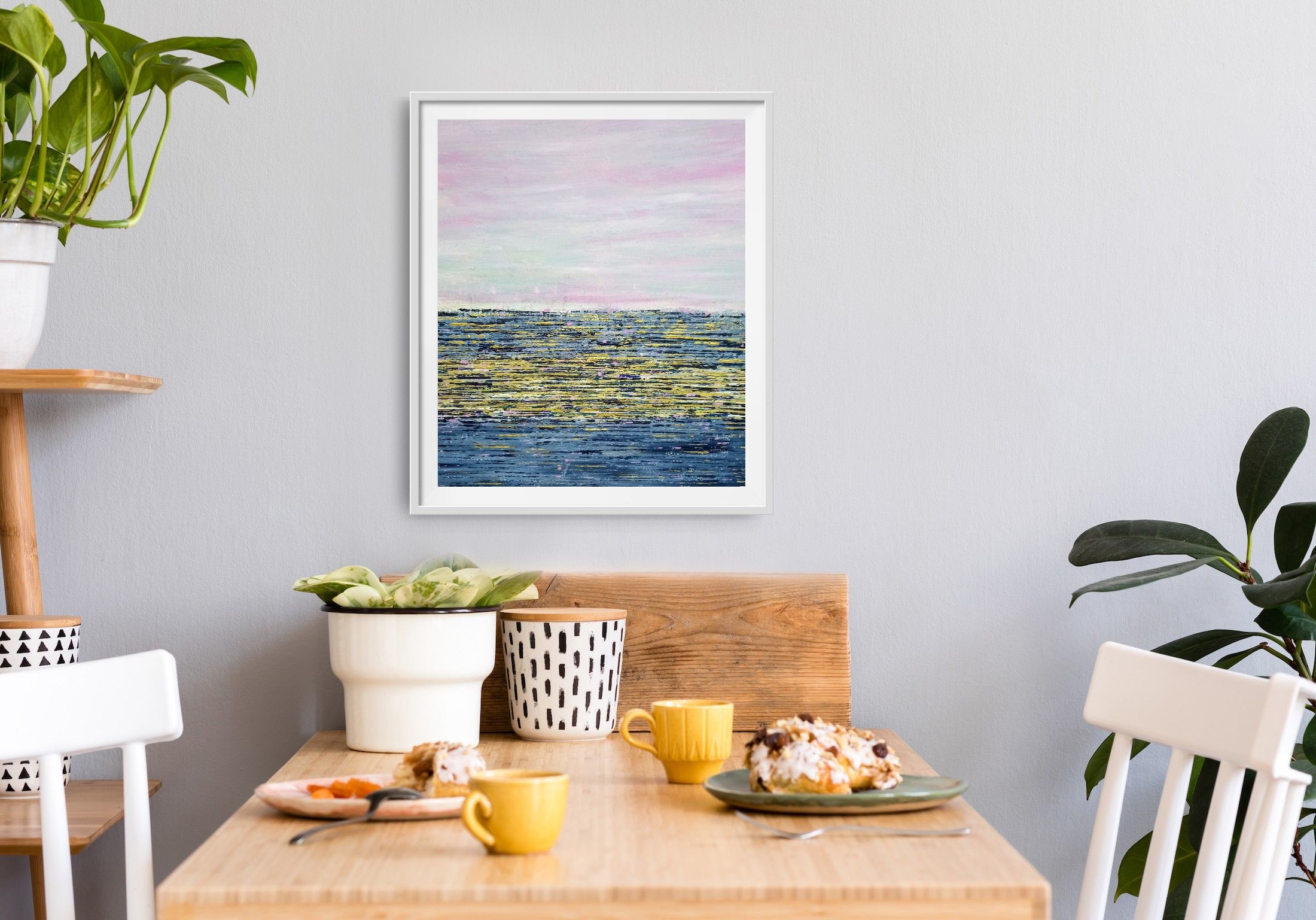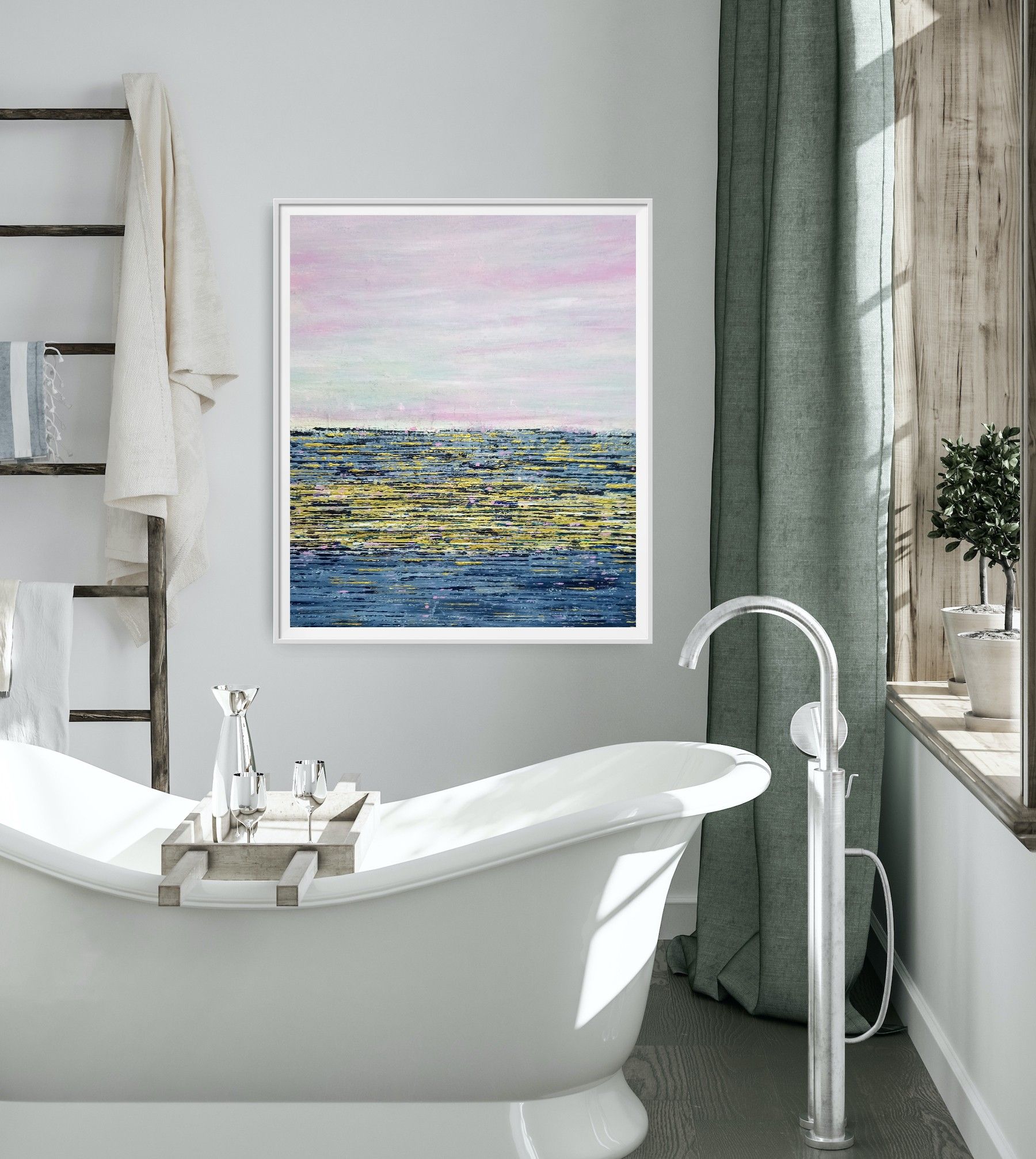 The pinks give a calm, serene feel to this piece. The dazzling sea is conjured up by the pop of gold and pink. A joy on any wall.